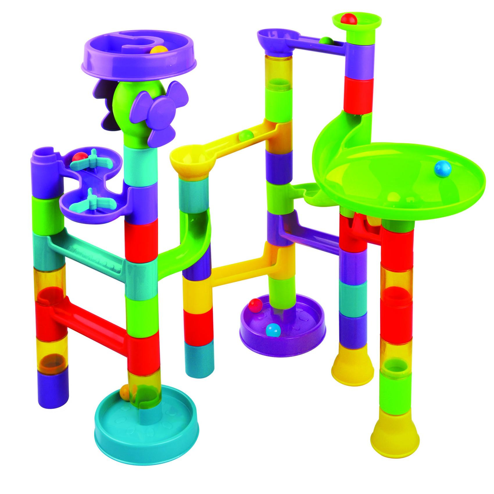 Kuličková dráha umožňuje sledovat cestu kuličky a její rychlost z horní části až dolů. Která kulička bude rychlejší a které sestavení dráhy bude zajímavější? Barevná kuličková dráha obsahuje spoustu překážek, které zvyšují napětí, zda kulička správně proběhne celou stavebnicí. Sestavit dráhu může dítě mnoha způsoby, dle vlastní fantazie. Stavebnice slouží k procvičení jemné motoriky a donutí dítě přemýšlet. Balení obsahuje 55 ks z toho 10 kuliček. Rozměr: 24 x 35 x 8 cm Vhodné od 3 let