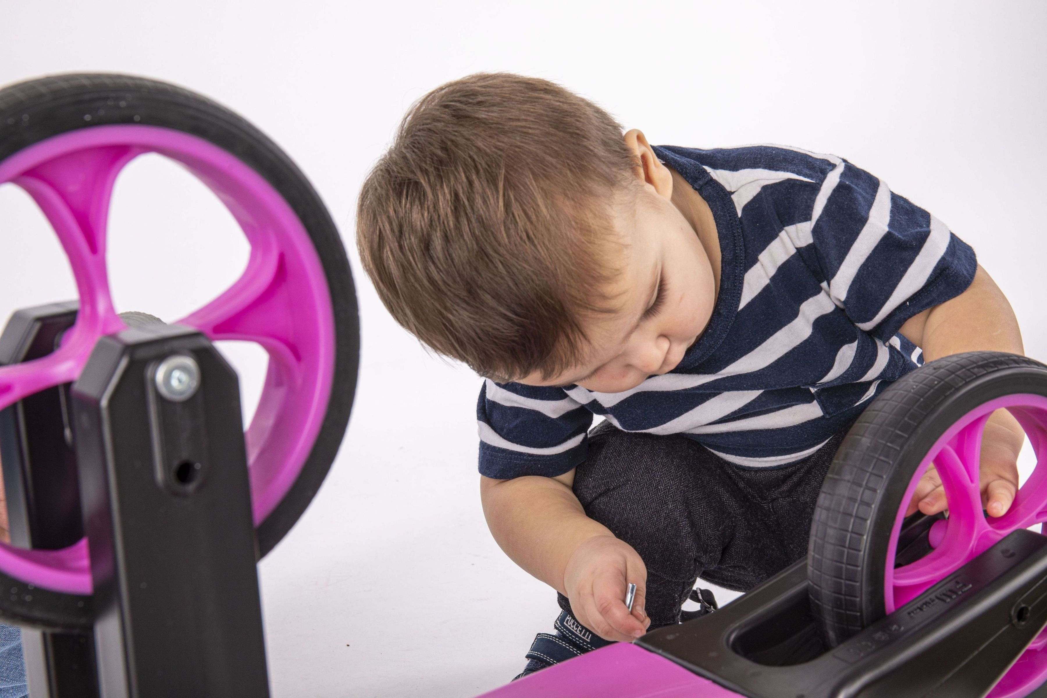 FUNNY WHEELS Rider SuperSport 2-in-1-Laufrad – verwandelt ein Dreirad ganz einfach in ein zweirädriges Laufrad. Das Kind muss sich nicht an ein neues Spielzeug gewöhnen, sondern hat weiterhin die Kontrolle über „seine Maschine“, kann also ohne Angst und entspannt mit der Veränderung umgehen und das Gleichgewicht lernen. Höhenverstellbar – 2 Einstellpositionen an beiden Achsen. Für kleinere und größere Kinder. Designerräder mit weichen REIFEN, die für eine ruhige Fahrt sorgen, keine Spuren auf dem Boden im Inneren hinterlassen und nicht durchstochen werden können (sie sind luftlos). Gurt zum TRAGEN des Laufrads. Sie hängen das Laufrad einfach über die Schulter und haben trotzdem beide Hände frei. Praktisch, wenn Sie das Laufrad ohne den kleinen Fahrer bewegen müssen. Lenkersperre – die Gabel hat einen begrenzten Drehbereich, der Lenker lässt sich nicht drehen. Der Verschluss verhindert Verletzungen am Babybauch. Der Lenker ist mit farbenfrohen, superweichen Griffen ausgestattet, die an den Enden verbreitert sind, um Kinderhände vor Verletzungen zu schützen. In Zusammenarbeit mit Orthopäden entwickelt. Hergestellt in der Tschechischen Republik aus langlebigem und unbedenklichem Kunststoff mit glatten Fugen. Zertifiziert in der Tschechischen Republik. Altersempfehlung: ab 18 Monaten (bzw. ab 80 cm Körpergröße) Belastbarkeit: 25 kg Sattelhöhe: 28/30 cm Lenkerbreite: 30 cm Hinterradabstand: 20 cm Gewicht Laufrad: 1,9 kg Verpackungsmaße 56 x 27 x 14,5 cm.