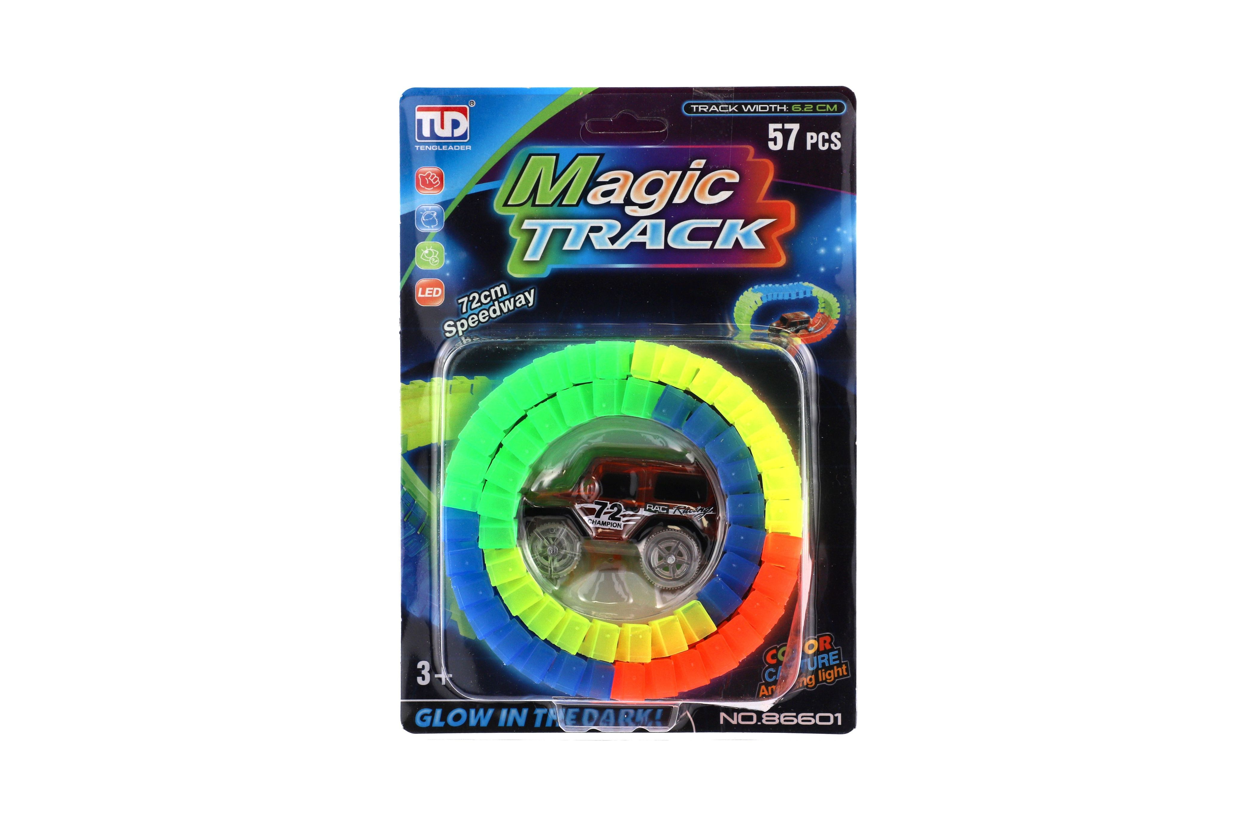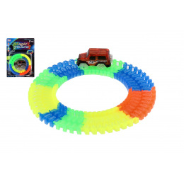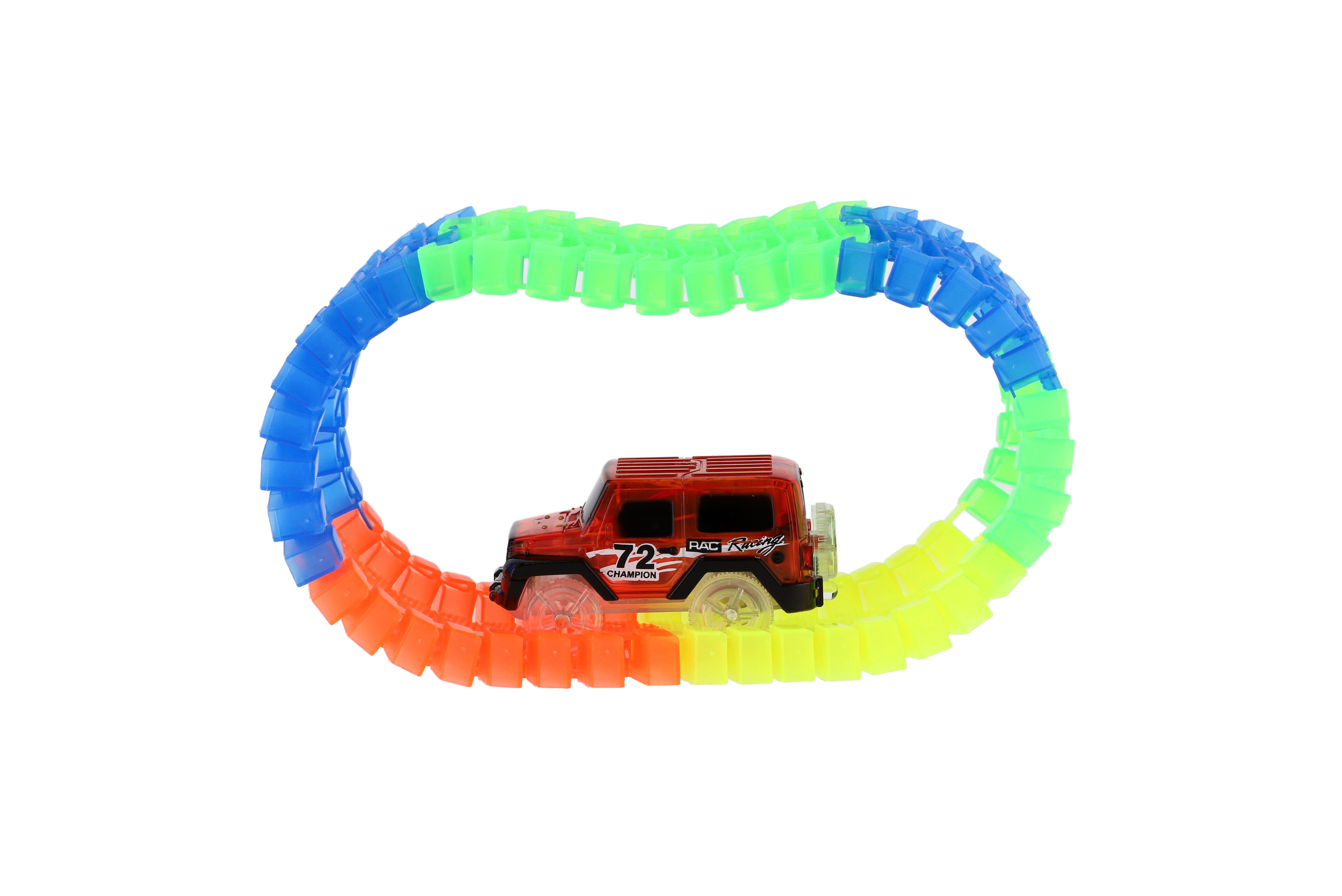 Beschreibung Teddies Leuchtende Rennstrecke im Dunkeln + batteriebetriebenes Auto aus Kunststoff 57 Teile Länge 72cm auf Karte 17x24x7cm