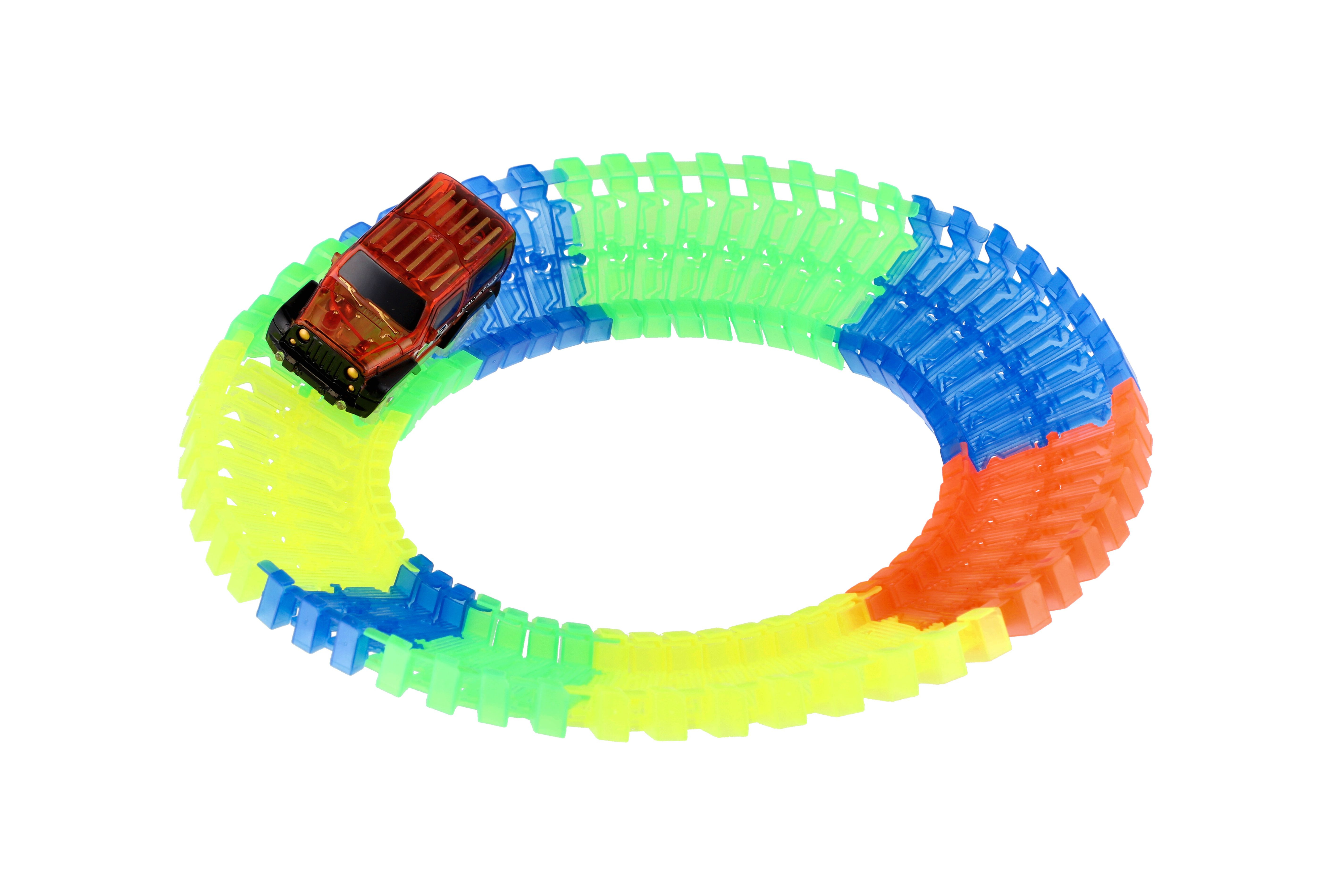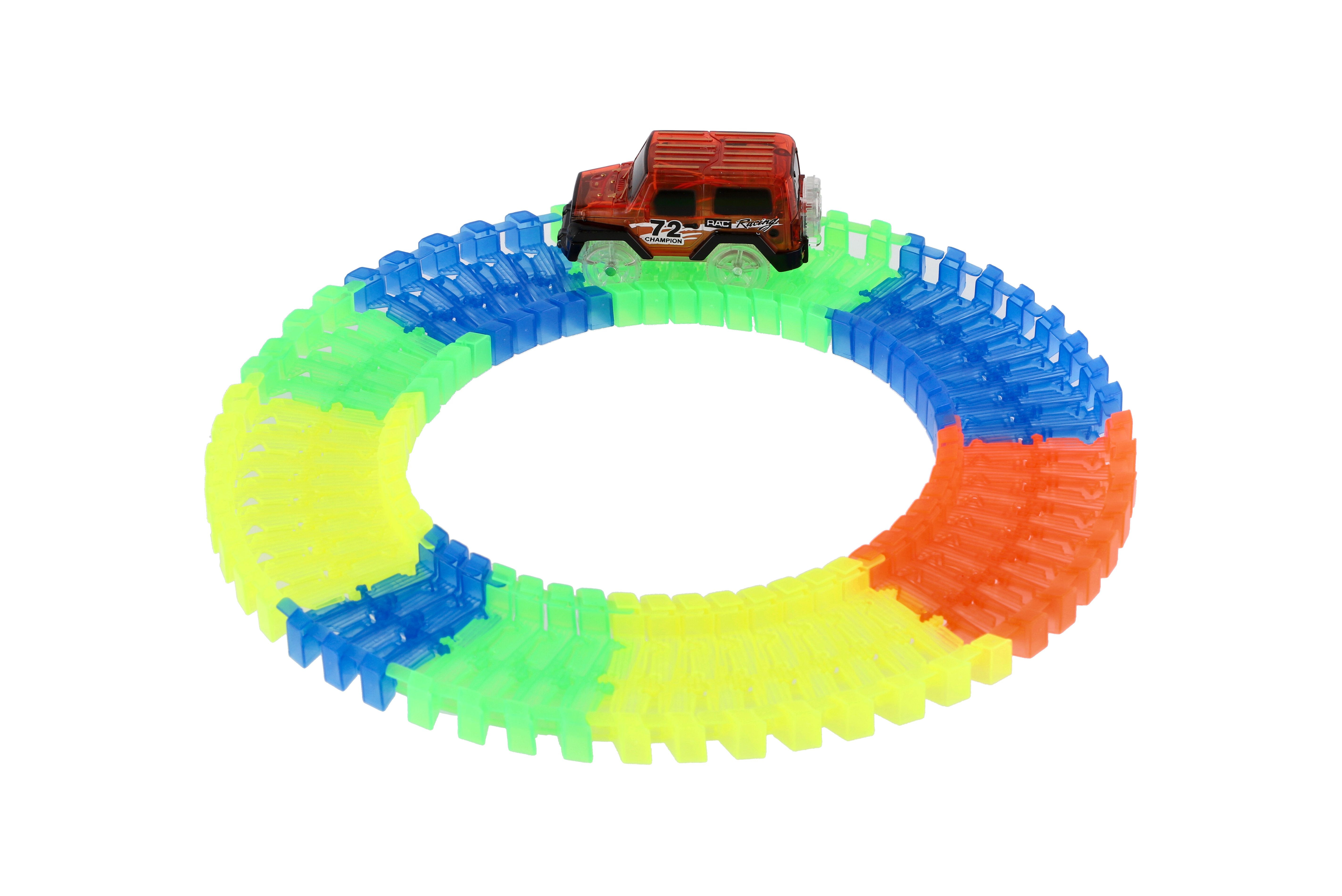 Bauen Sie eine tolle Strecke ganz nach Ihren Vorstellungen und lassen Sie das Auto losfahren! Machen Sie sich keine Sorgen, dass es verloren geht, es wird jedes Bit der Spur genau kopieren. Mit einer erstaunlichen Neon-Rennstrecke, die gebogen und gedreht werden kann und außerdem im Dunkeln leuchtet, erleben Sie echte Rennen! Das Auto, das über drei Blinklichter verfügt und superschnell ist, benötigt 1x AA-Batterie, nicht im Lieferumfang enthalten. Schienenlänge: 72 cm (57 Stück) Verpackungsgröße: 17 x 24 x 7 cm Geeignet für Kinder ab 3 Jahren
