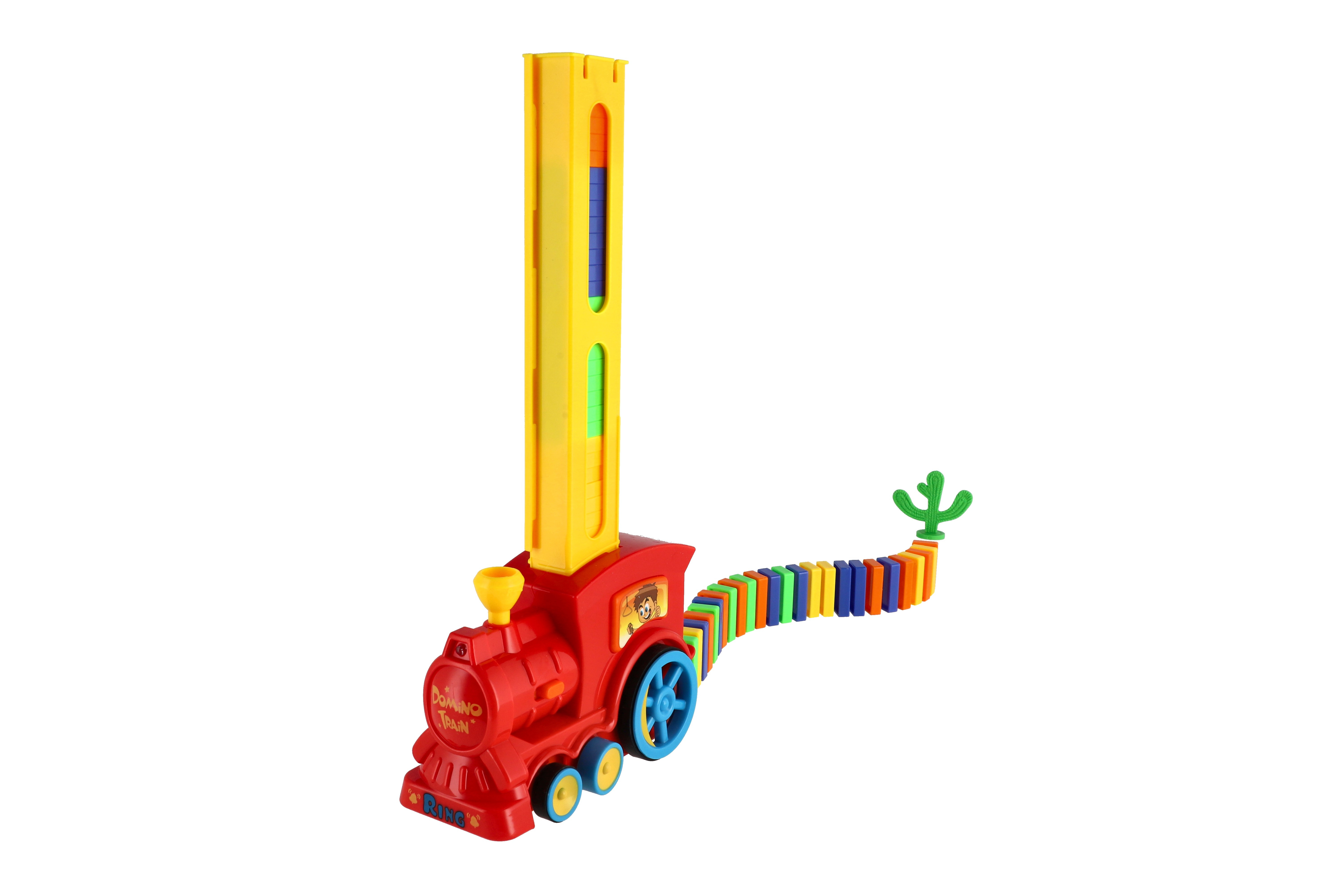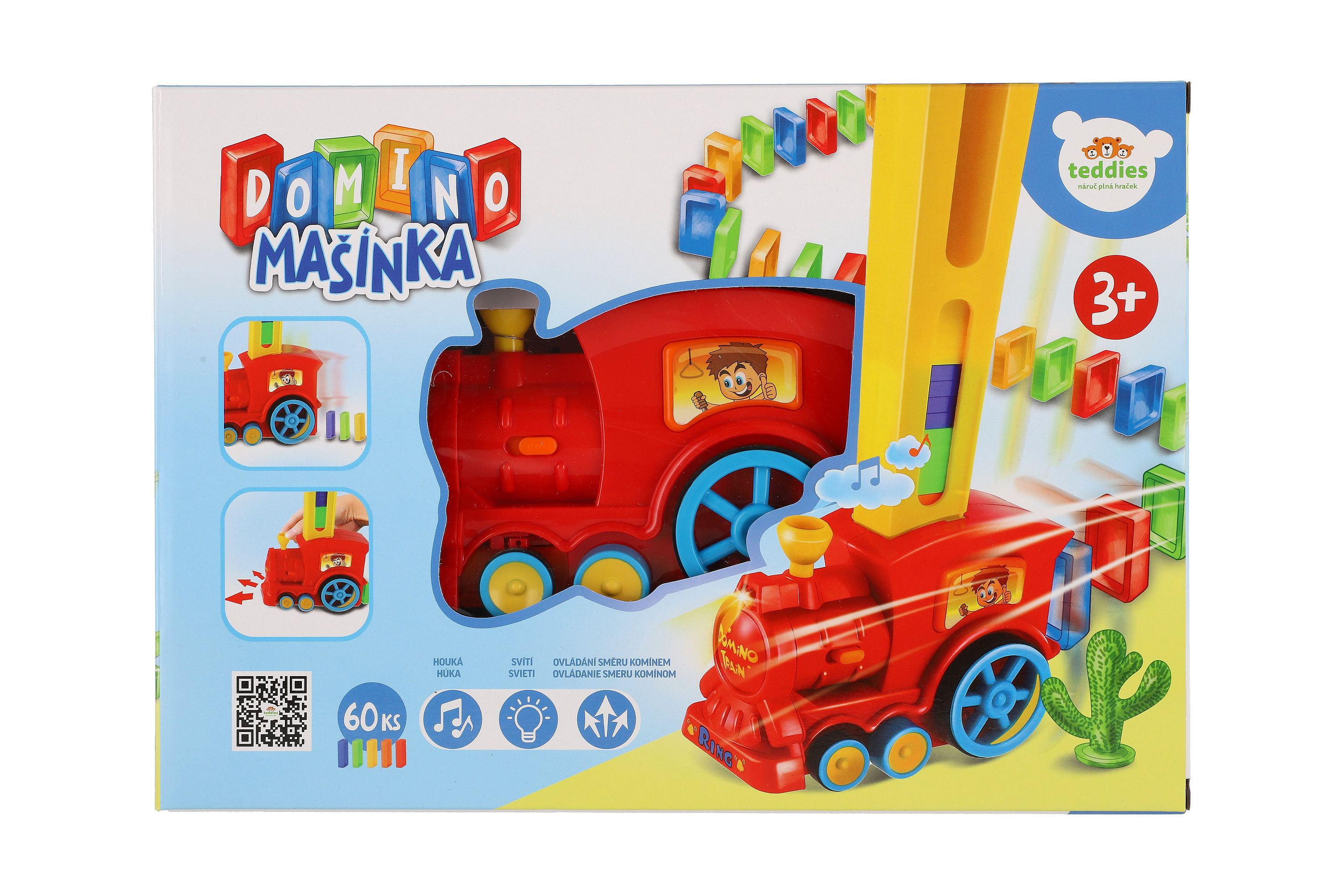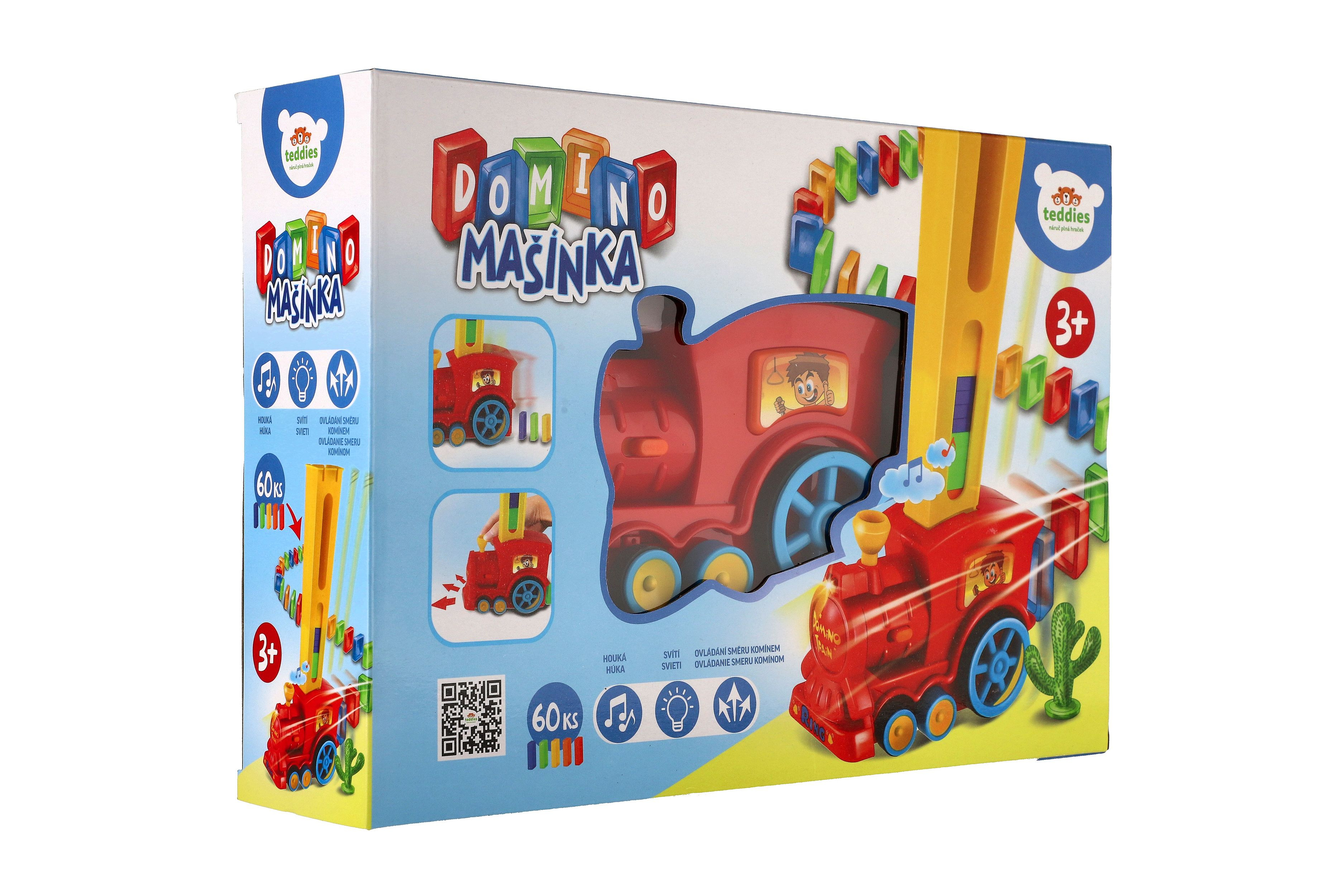 Lokomotiva skládající barevné domino 60ks. Vláček za jízdy staví řadu z domina, kterou můžete zbourat. Při nárazu vláček změní směr jízdy a jede dál, otočením komínku mašinky změníte směr, při jízdě svítí a cinká. Baterie 2x AA nejsou součástí balení. Rozměry balení 33 x 23 x 8 cm. Vhodné pro děti od 3 let.