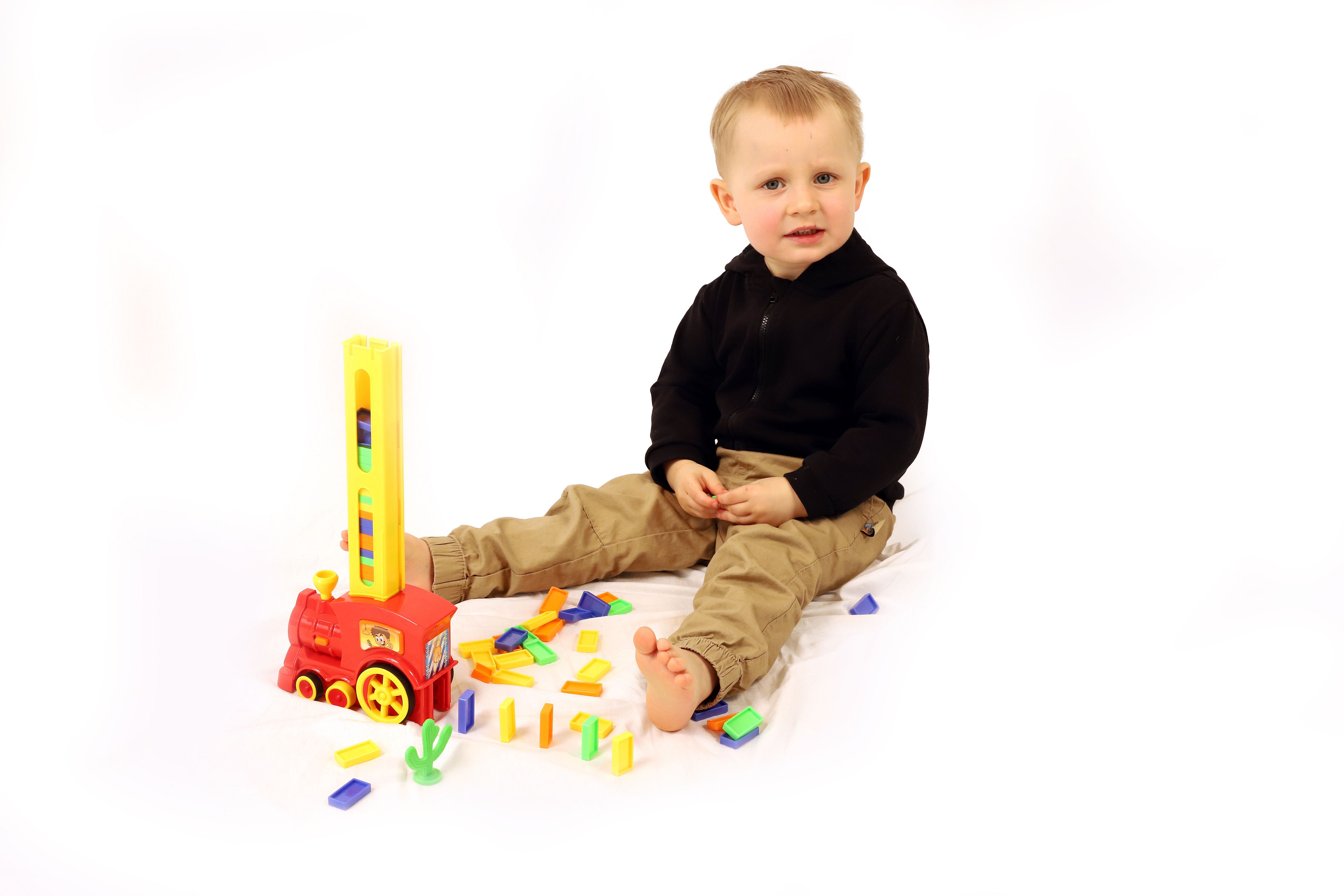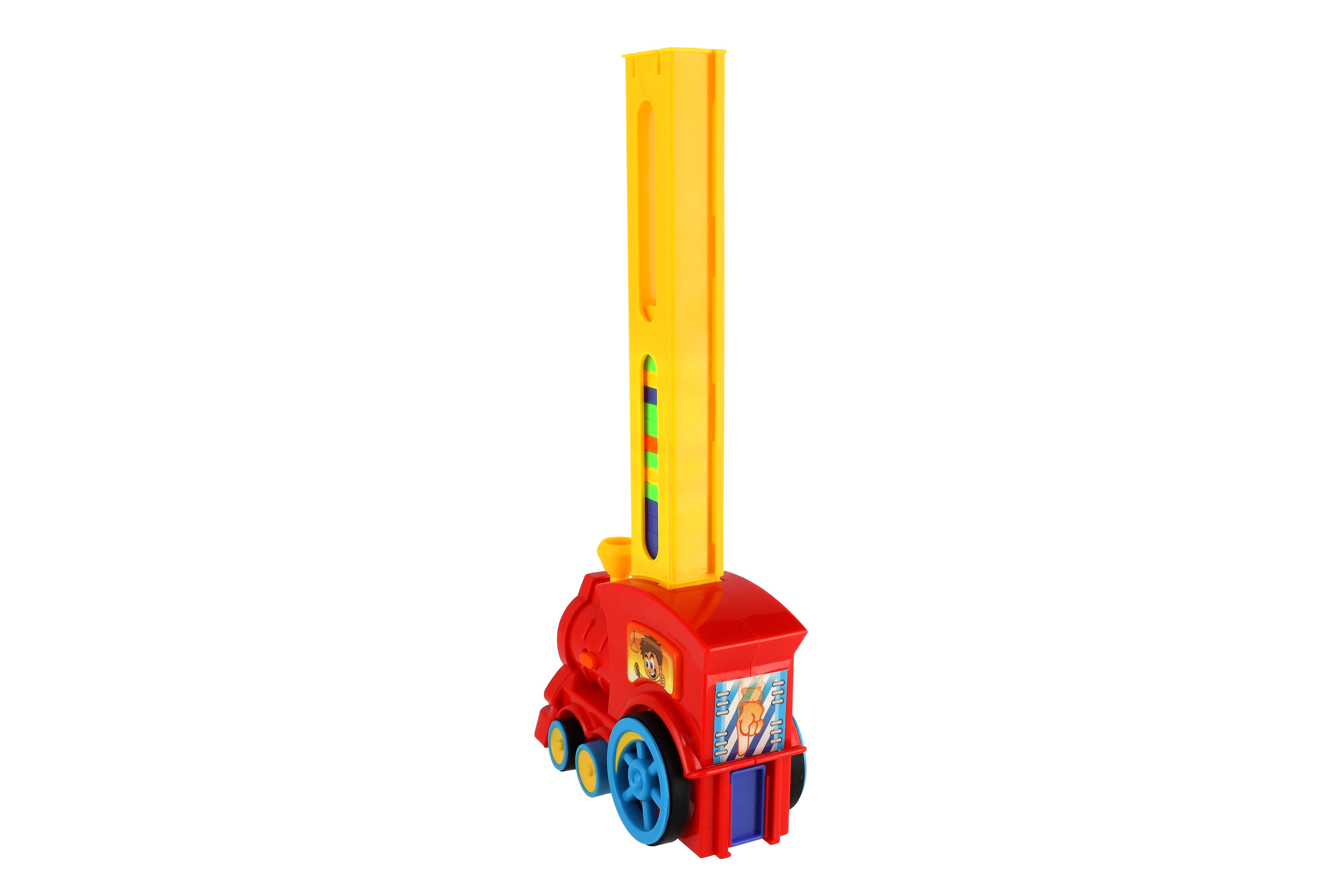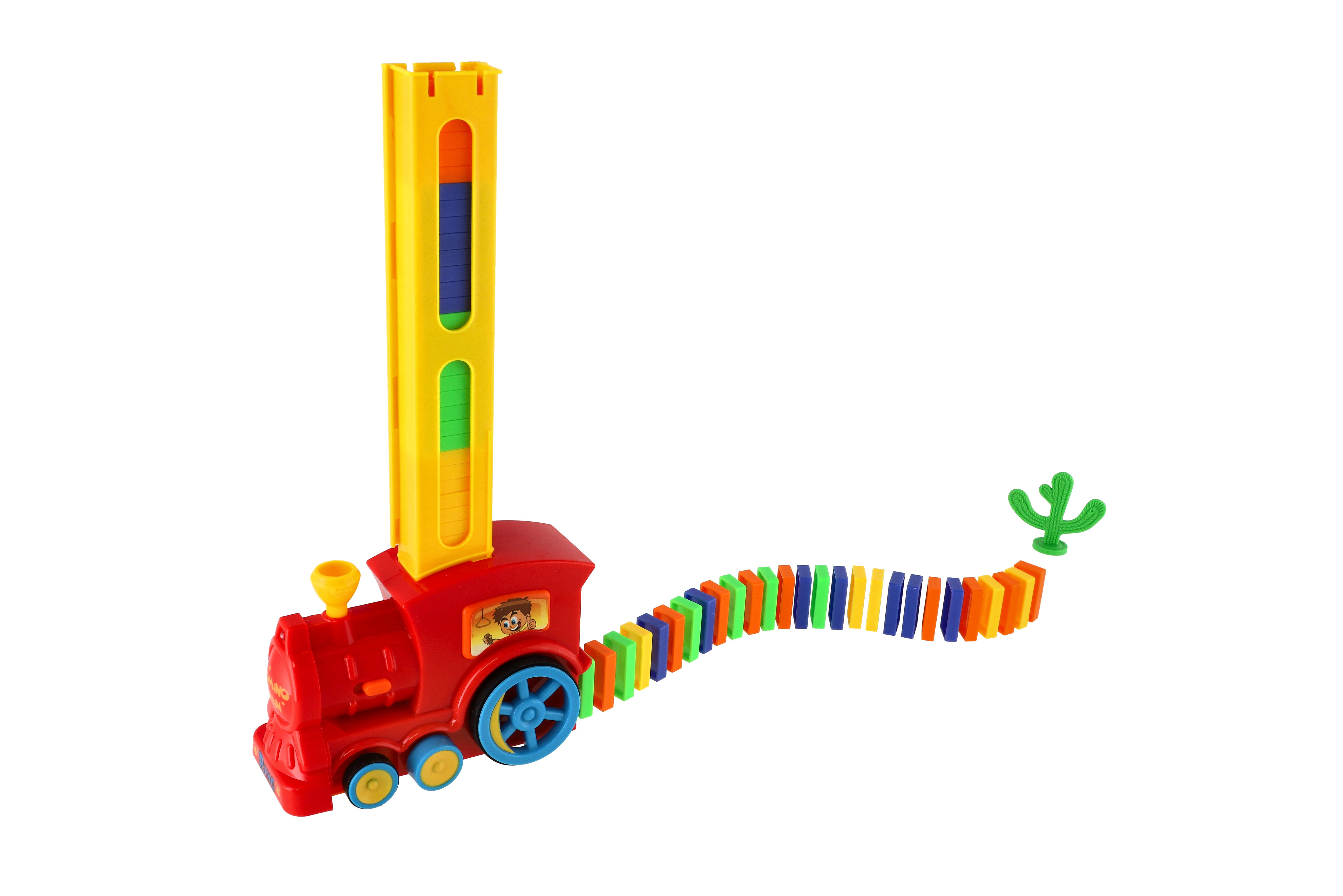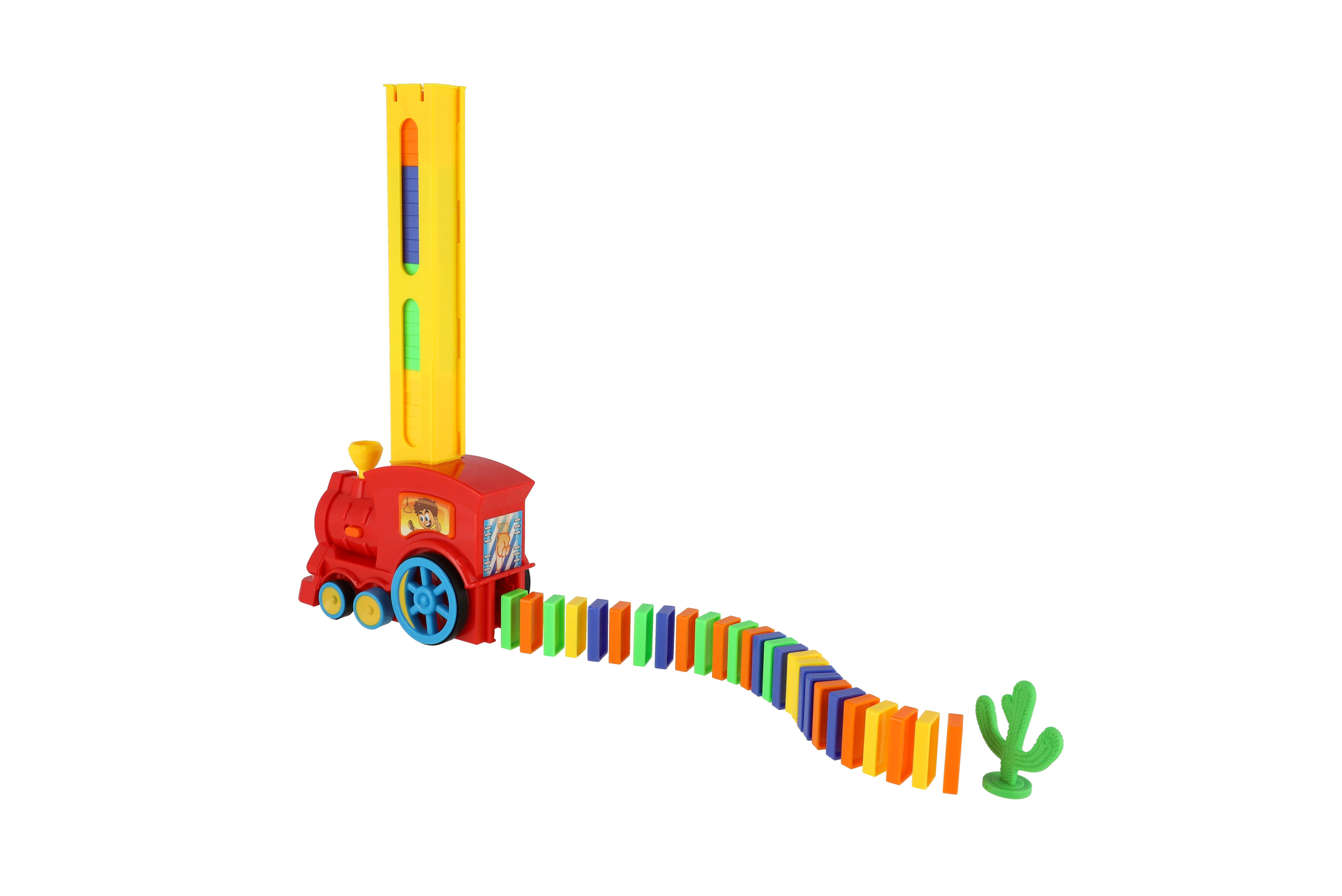 Lokomotiva skládající barevné domino 60ks. Vláček za jízdy staví řadu z domina, kterou můžete zbourat. Při nárazu vláček změní směr jízdy a jede dál, otočením komínku mašinky změníte směr, při jízdě svítí a cinká. Baterie 2x AA nejsou součástí balení. Rozměry balení 33 x 23 x 8 cm. Vhodné pro děti od 3 let.