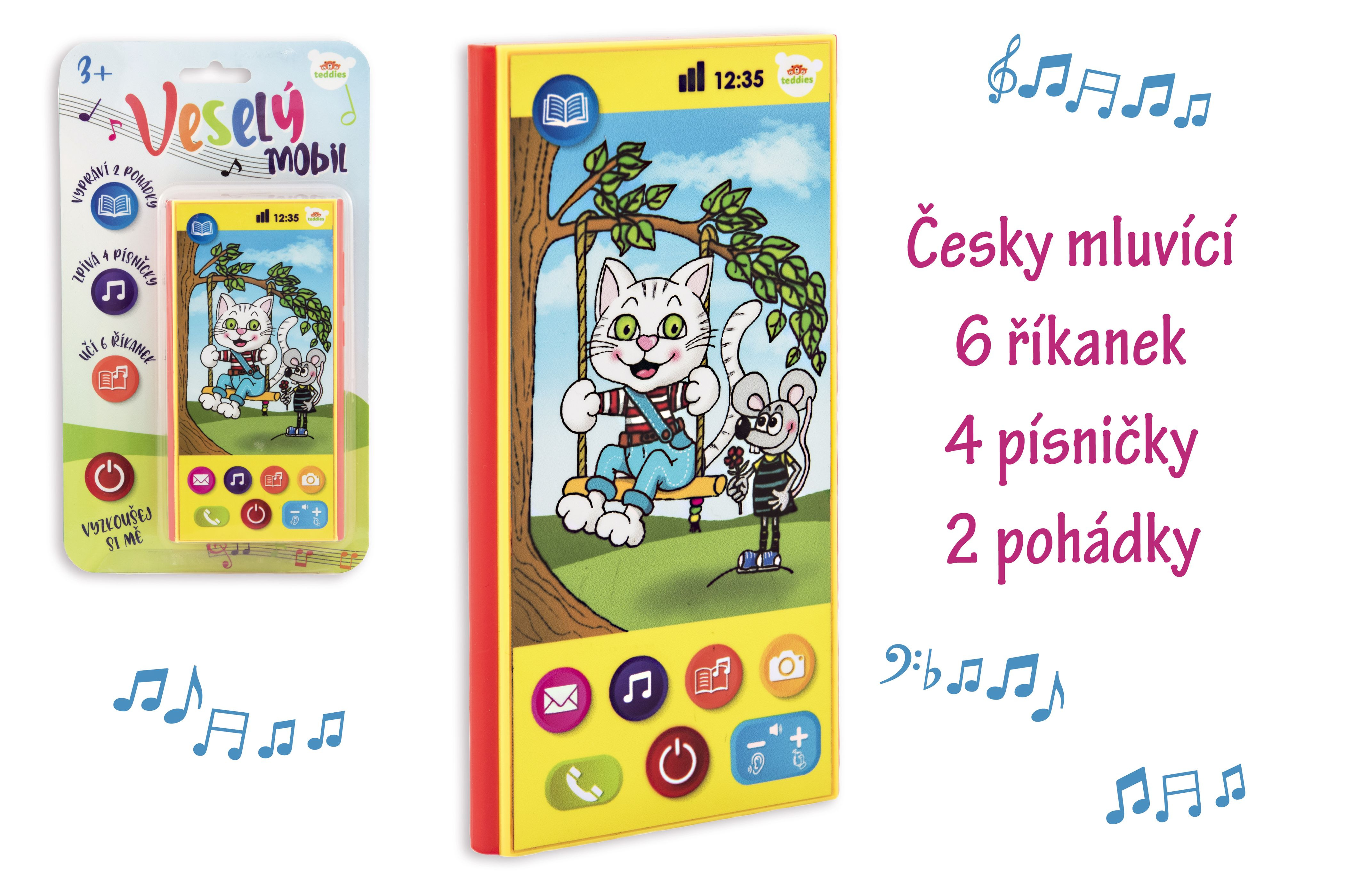 Beschreibung Teddies Lustiges Mobiltelefon aus Kunststoff, spricht Tschechisch, 7,5x15cm, batteriebetrieben, mit Sound auf Karte