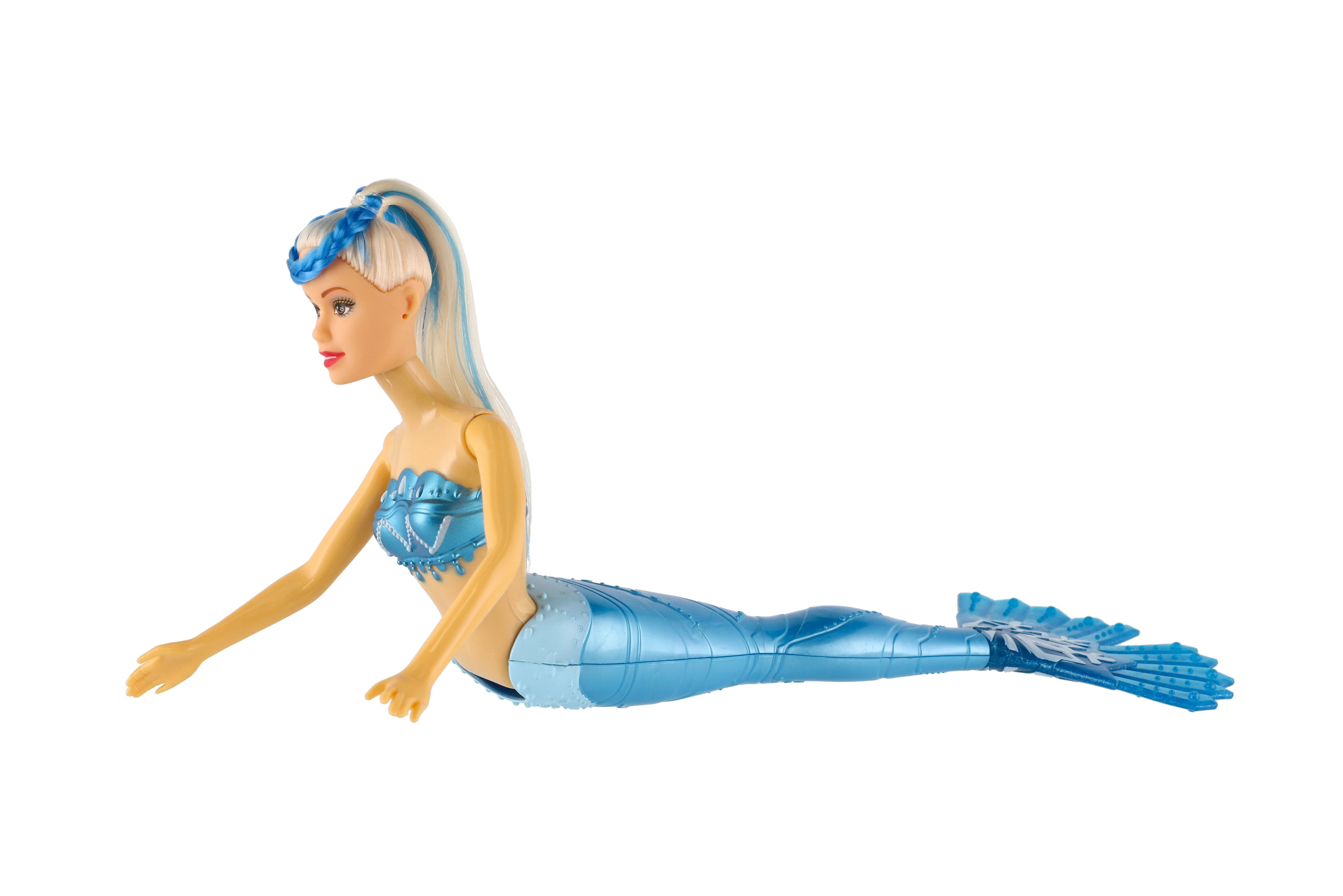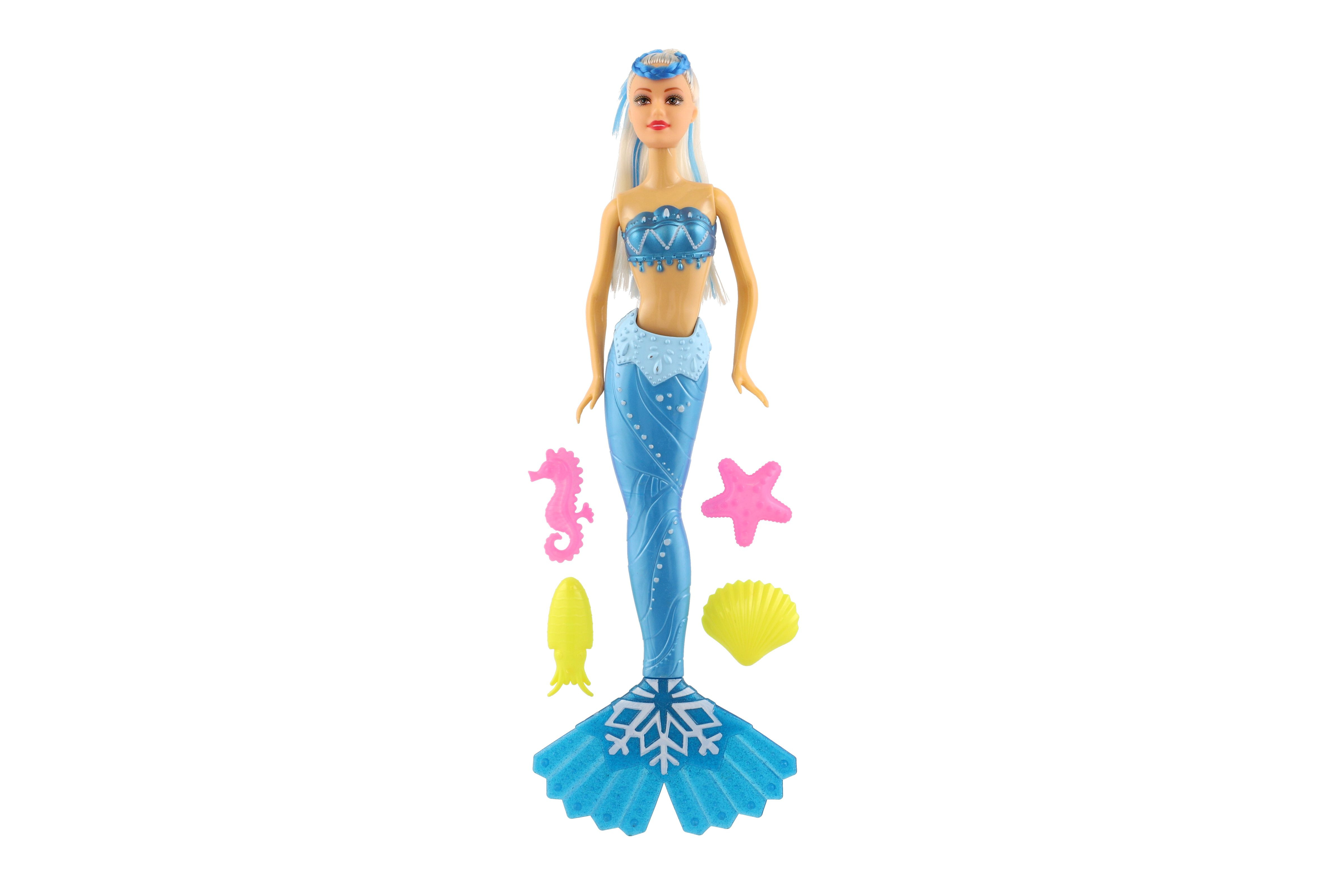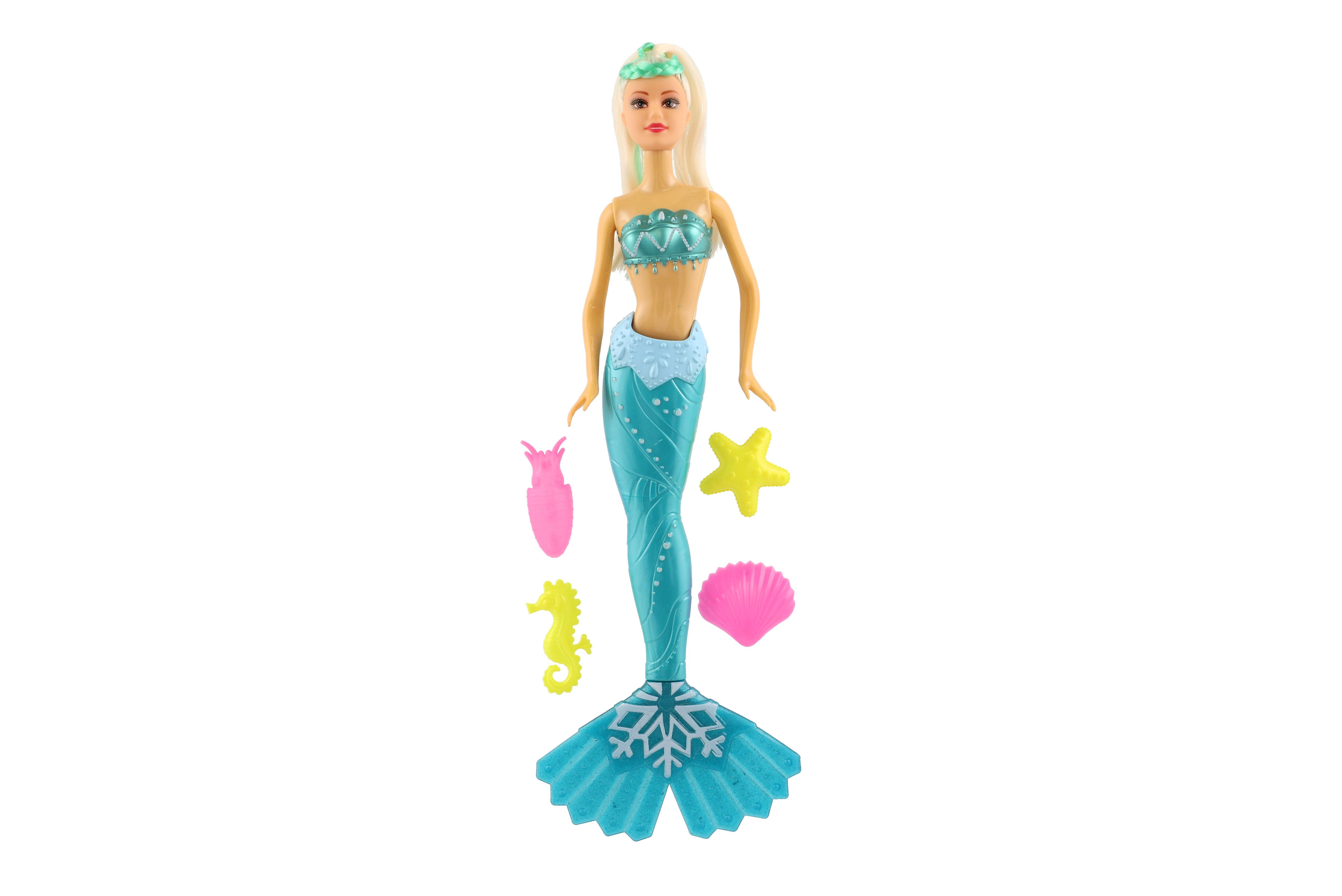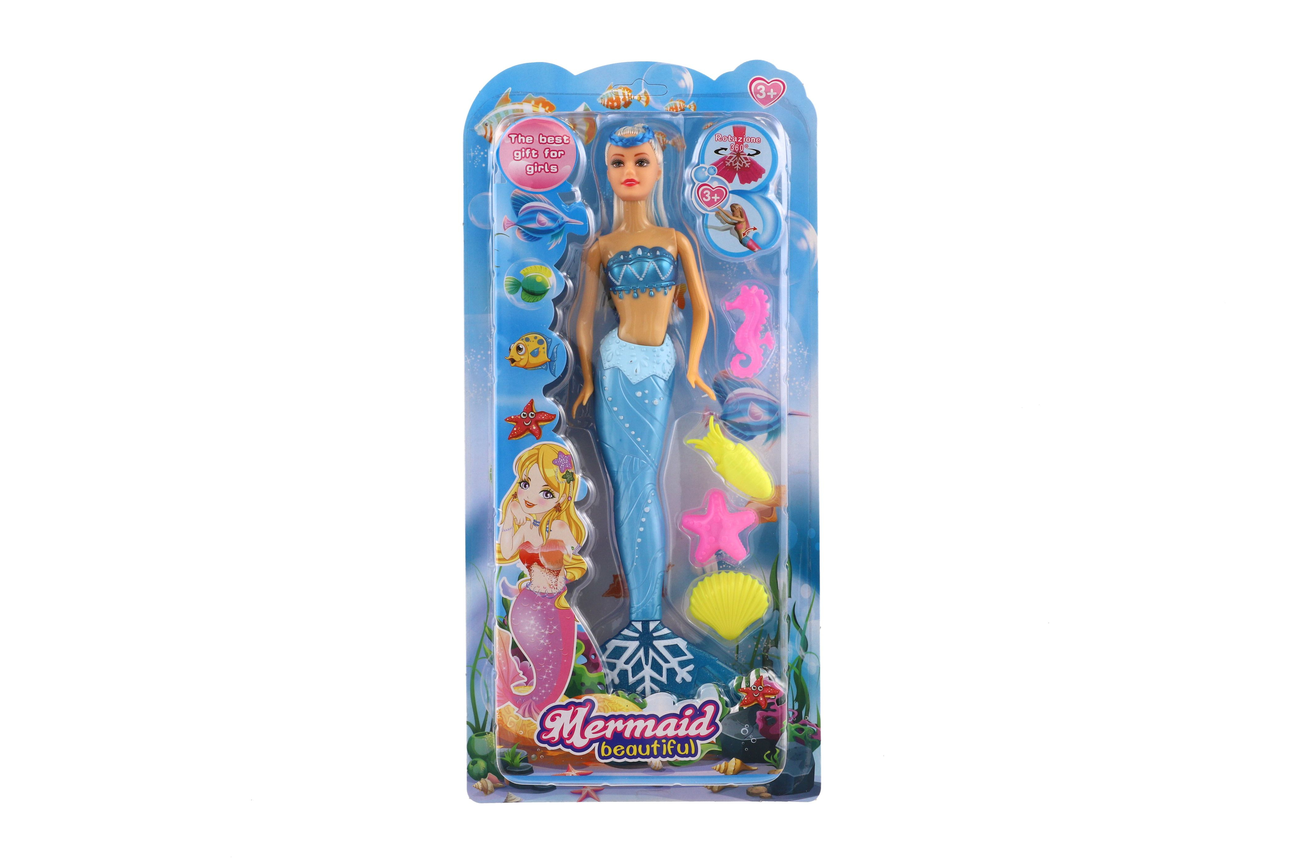 Meerjungfrauenpuppe aus Plastik. Erleben Sie mit einer Meerjungfrau ein Abenteuer auf dem Meeresgrund! Bringen Sie der Puppe bei, ihr langes Haar zu kämmen, damit es die gesamte Unterwasserwelt verzaubert! Im Lieferumfang sind außerdem 4 Zubehörteile enthalten, die Lamelle ist um 360 °C drehbar. Packungsgröße: 34 cm. Geeignet für Kinder ab 3 Jahren.