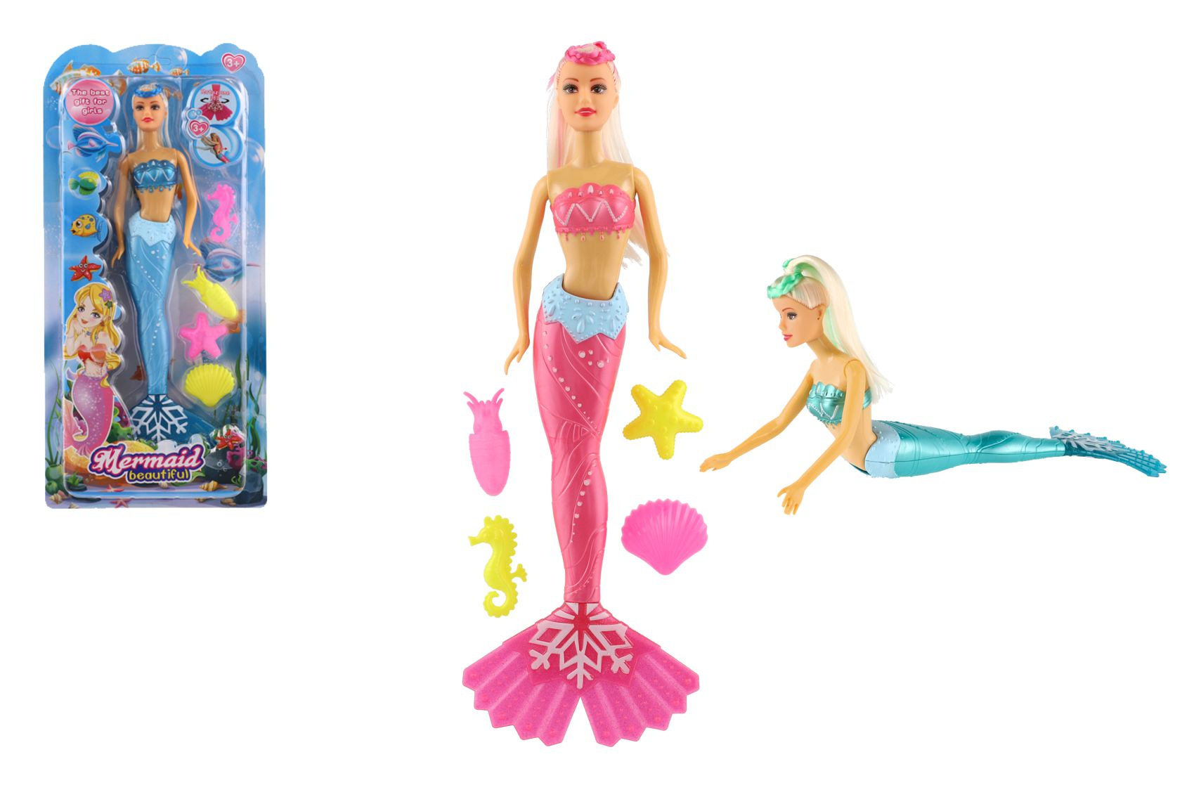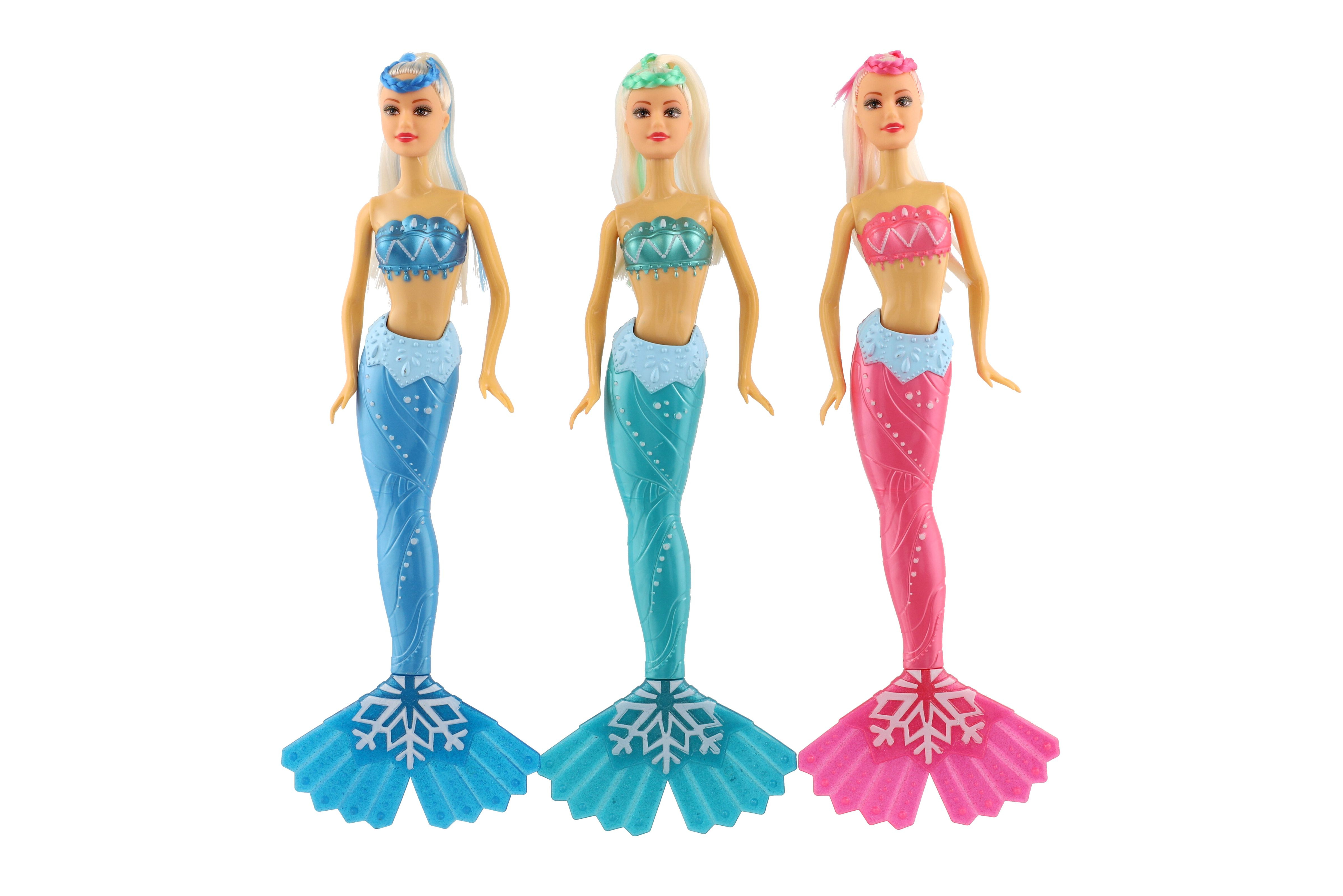 Beschreibung Teddies Meerjungfrauenpuppe mit Zubehör aus Kunststoff 34cm 3 Farben auf Karte