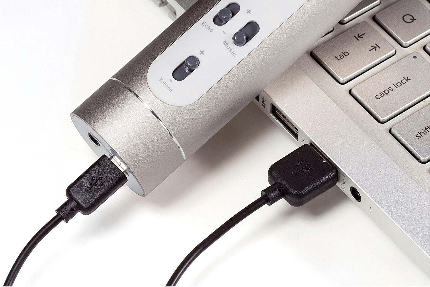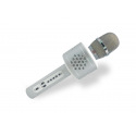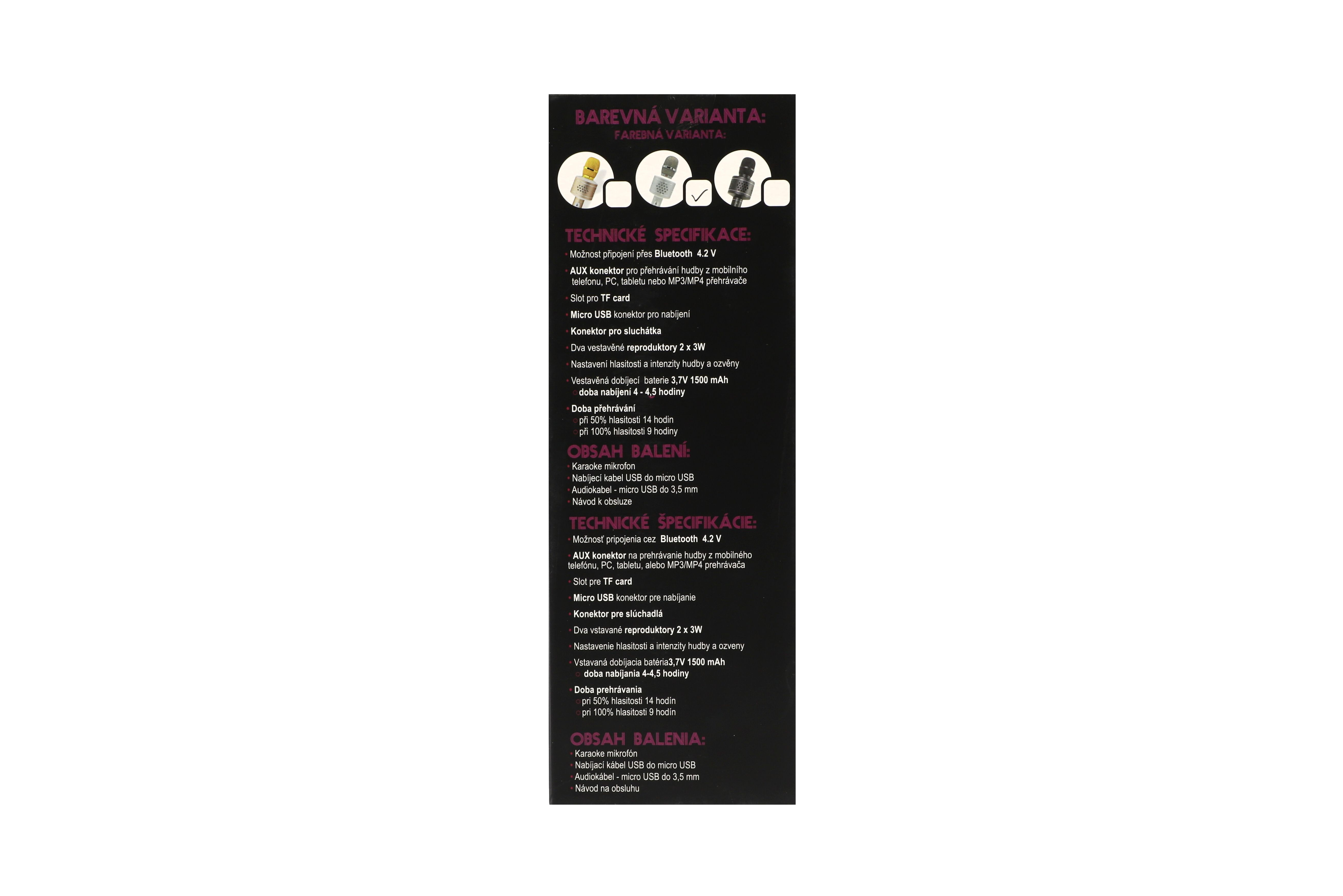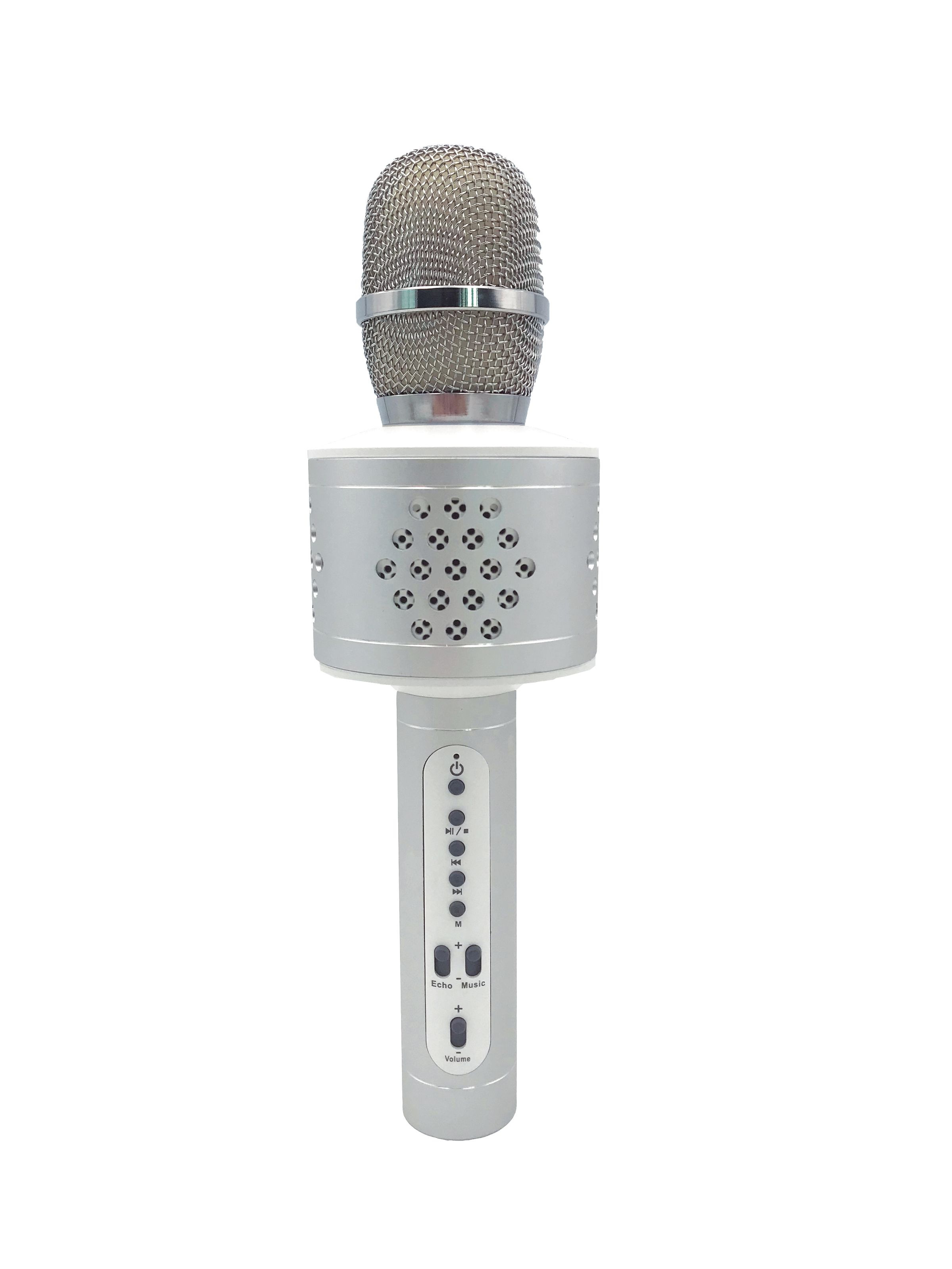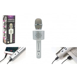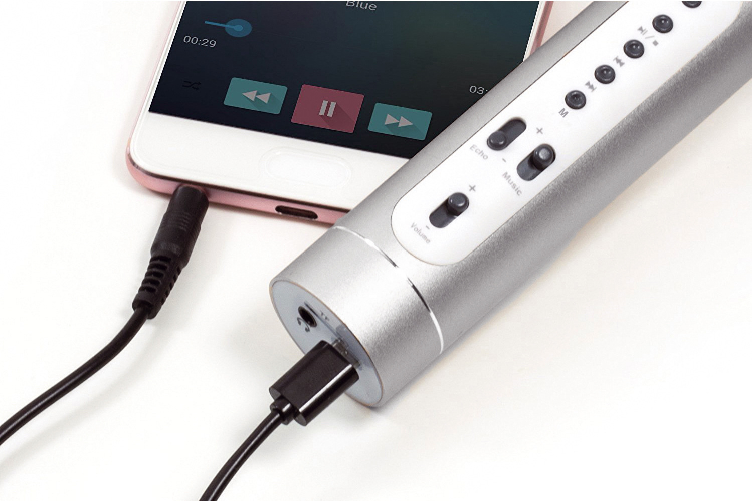 Ein kabelloses Karaoke-Mikrofon ist ein Muss für jede Party. Verwenden Sie ein Kabel oder Bluetooth, um Ihr Telefon mit dem Mikrofon zu verbinden. AUX-Anschluss zum Abspielen von Musik von einem Mobiltelefon, PC, Tablet oder MP3/MP4-Player. Enthält einen TF-Kartensteckplatz – schalten Sie das Mikrofon durch langes Drücken der EIN-Taste ein, legen Sie eine Speicherkarte ein und das Mikrofon beginnt mit der Wiedergabe der auf der Karte gespeicherten Musik. Sie können mit dem Mitsingen über das Mikrofon beginnen. AUX-Anschluss – schließen Sie das Kabel mit dem einen Ende an den AUX-Steckplatz und dem anderen USB-Ende an Ihr Mobiltelefon, Tablet, PC oder MP3 an. Das Mikrofon beginnt mit der Wiedergabe der von Ihnen ausgewählten Musik auf dem angeschlossenen Gerät und Sie können mit dem Singen beginnen. Wenn Sie das Bluetooth-Mikrofon einschalten, funktioniert es spontan. Wenn die Verbindung nicht hergestellt werden kann, wird nach einer anderen BT-Verbindung gesucht. Wenn Sie das Mikrofon nicht koppeln können, überprüfen Sie, ob das Gerät, mit dem Sie das Mikrofon koppeln möchten, A2DP unterstützt. Lautstärke und Intensität von Musik und Echo können angepasst werden. Technische Daten: - Bluetooth 4.2 V, Entfernung größer als 1 m – Lautsprecher 2 x 3 W – Frequenz 90 Hz – 10 KHz – Batterie wiederaufladbare 3,7 V 1500 mAh Lithiumbatterie (nicht austauschbar) – Ladezeit 4,5 Stunden (ausgeschaltet) – Betriebszeit bei 50 % Lautstärke beträgt 14 Stunden, bei 100 % Lautstärke 9 Stunden. Packungsinhalt: Karaoke-Mikrofon, USB-auf-Micro-USB-Ladekabel, Audiokabel, Bedienungsanleitung. Farbe: Silber. Wir wünschen viel Spaß! Verpackungsmaße 10 x 28 x 9 cm. Es ist kein Spielzeug.