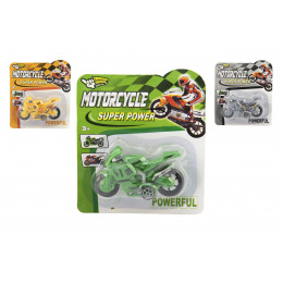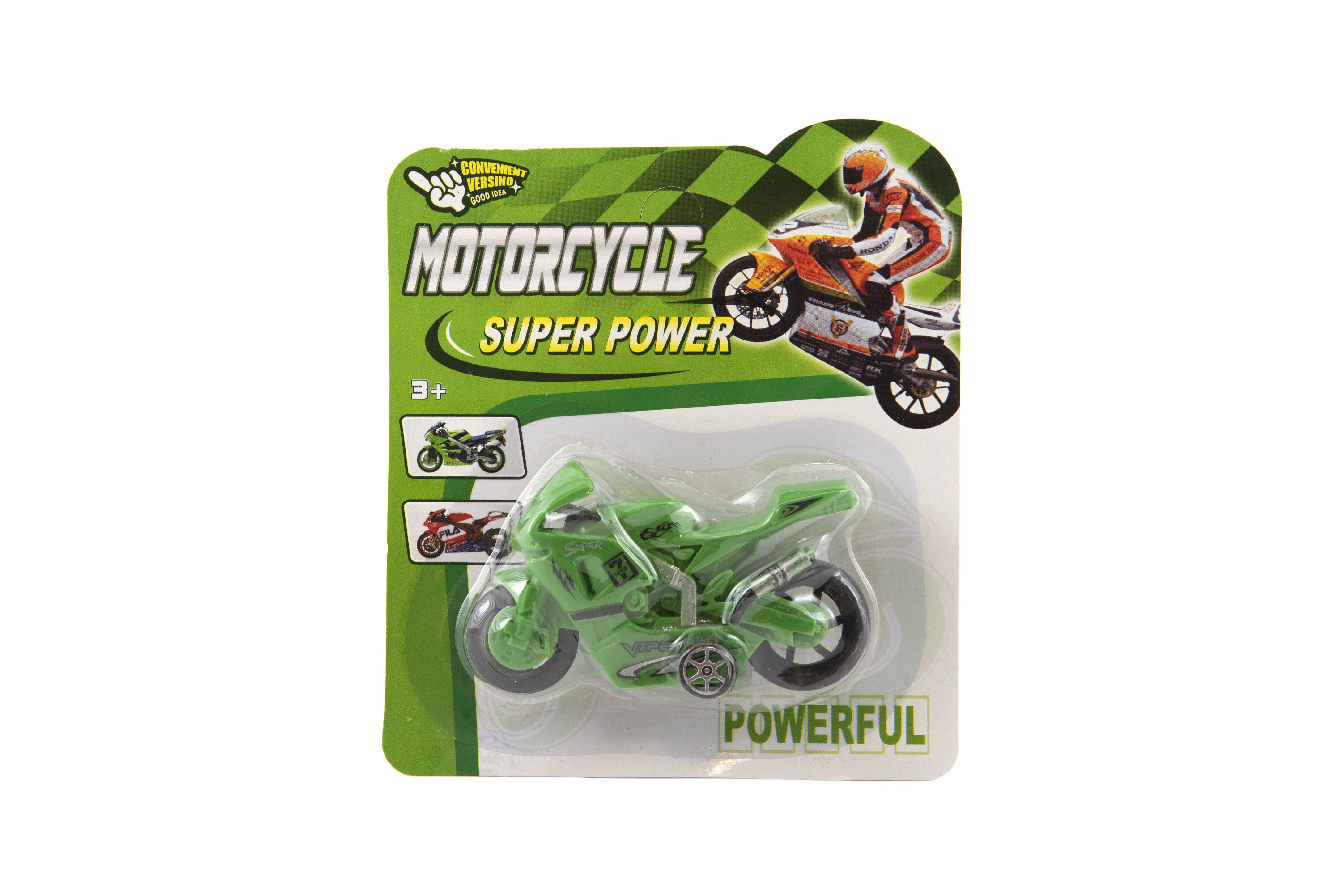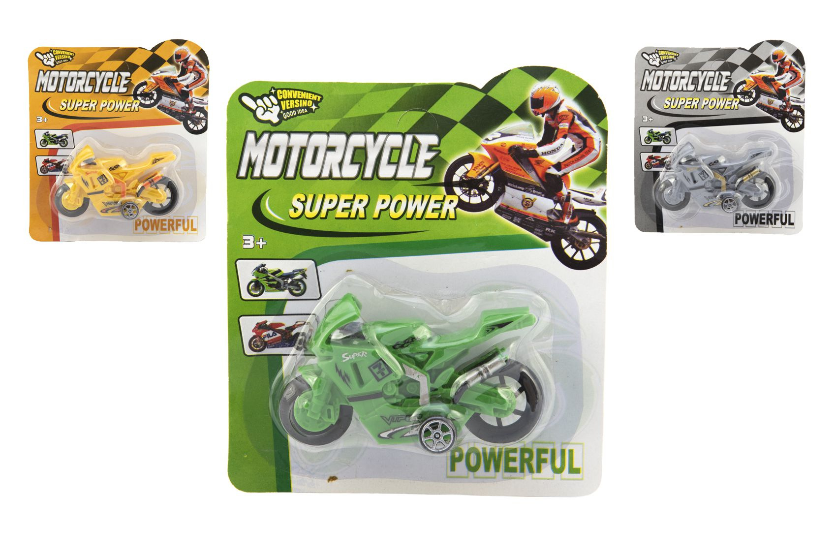 Teddies Motorrad Straßenmaschine aus Kunststoff 10cm mit Rückziehmotor in 3 Farben auf Karte