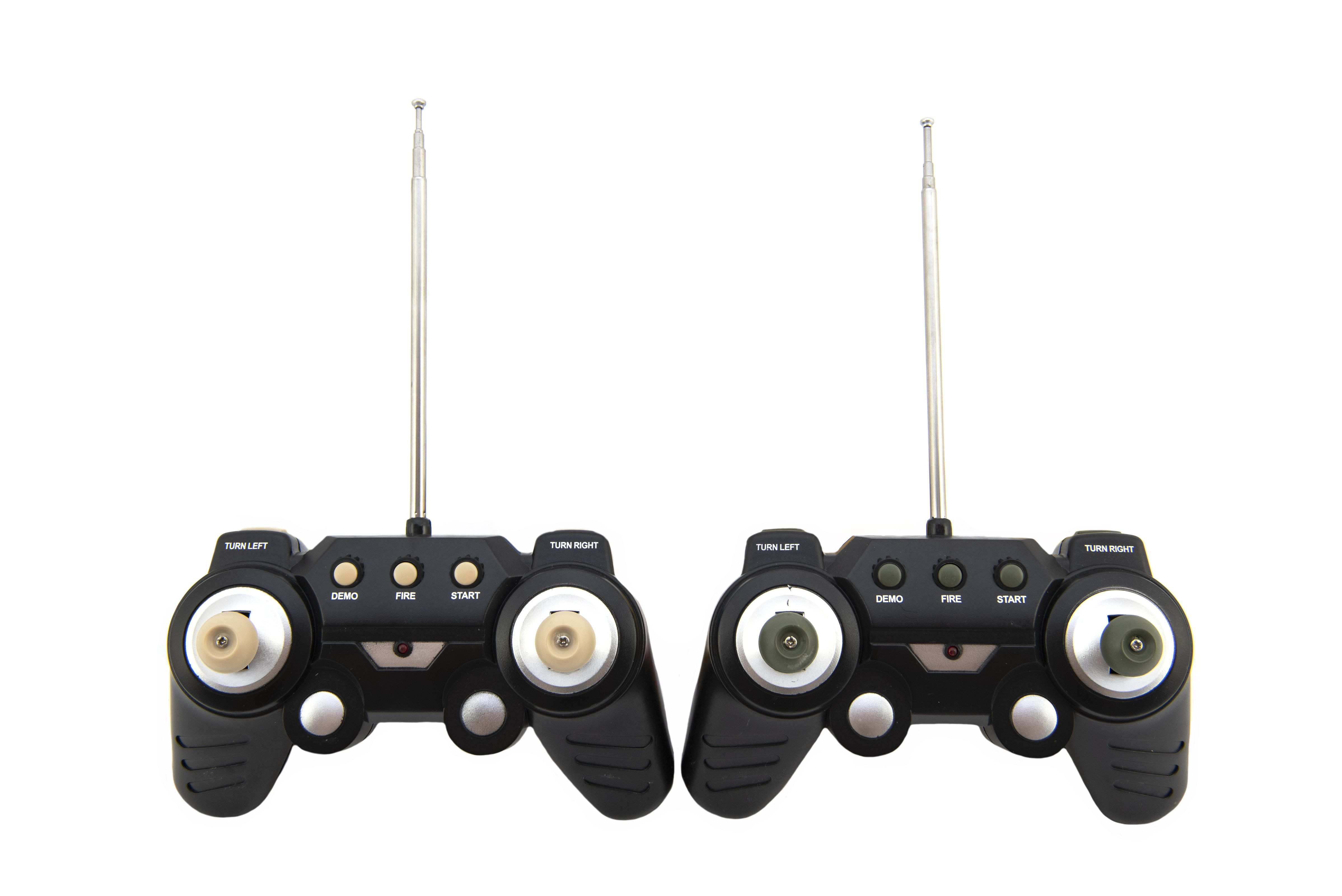 Zahrajte si na tankovou bitvu. Každý tank vydává zvuky, střílí, otočná věž se otáčí o 360 stupňů, svítí. Kdo ztratí všechny "životy", prohrál. Hlaveň vydává zvuky. Každý tank pracuje na jiné frekvenci (27 MHz/40 MHz). Vyrobeno z kvalitního a odolného plastu. Měřítko 1:32. Baterie 2x 4.8V AA (tanky), 2x 9V (dálkové ovládání) jsou součástí balení. Vrhni se do válečné bitvy! Ovládej tank a hledej svého nepřítele! Vzdálenost dálkového ovladače do 15 metrů. Vzdálenost mezi tanky pro tankovou bitvu do 4 metrů. První doba nabíjení baterie je 8 hodin. Každé další nabíjení bude 3-4 hodiny do plného nabití baterie. Jeden plně nabitý dobíjecí pack vydrží 10-15 minut hry. Rozměry balení 50 x 20 x 23 cm. Vhodné pro děti od 8 let.