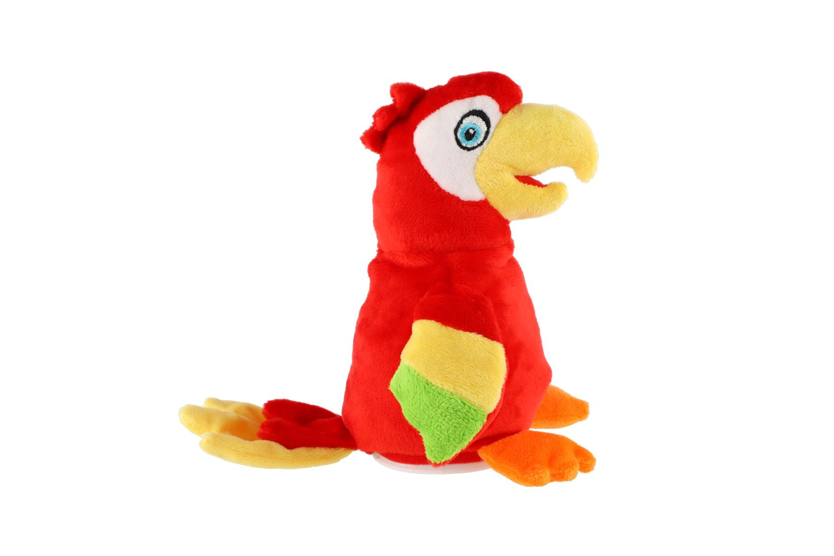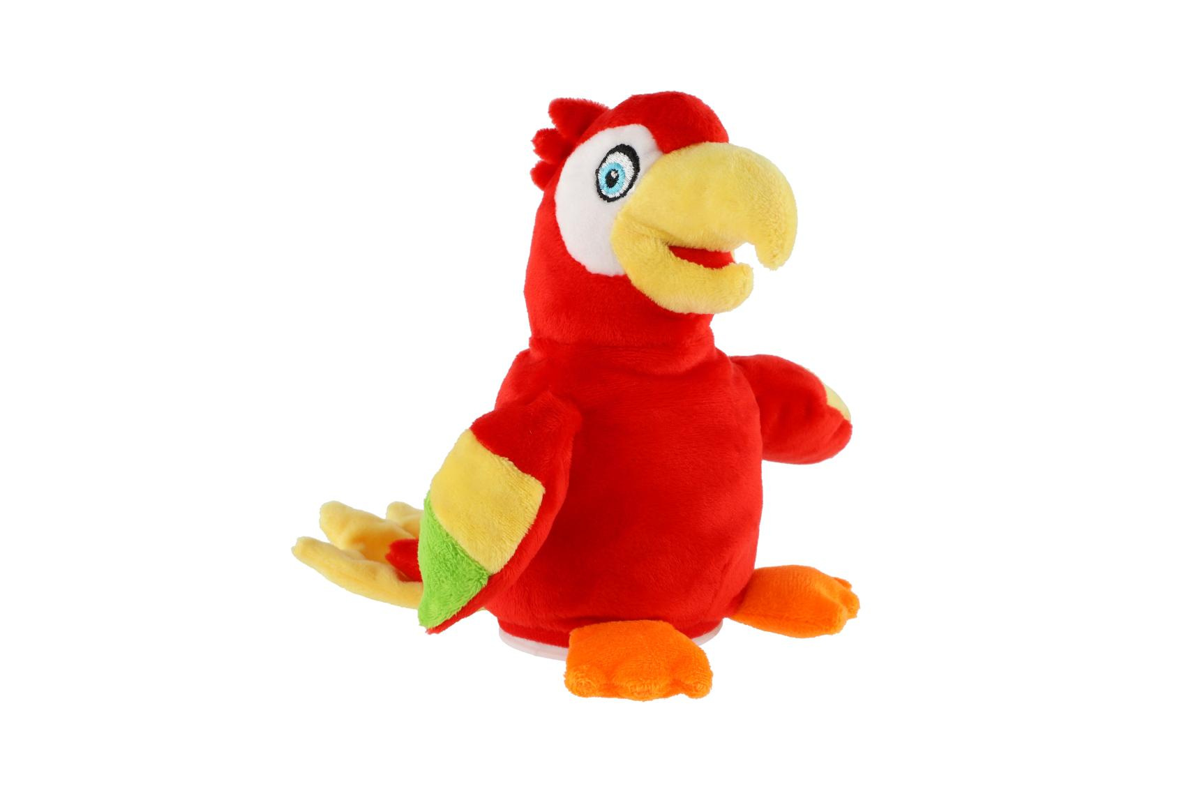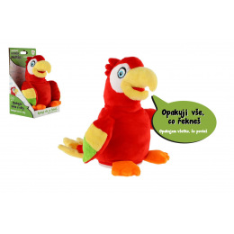 Beschreibung Teddies Papagei Jaroušek, der Sätze wiederholt, Plüsch 16cm, batteriebetrieben mit Sound, in einer Schachtel 12x20x10cm im Beutel
