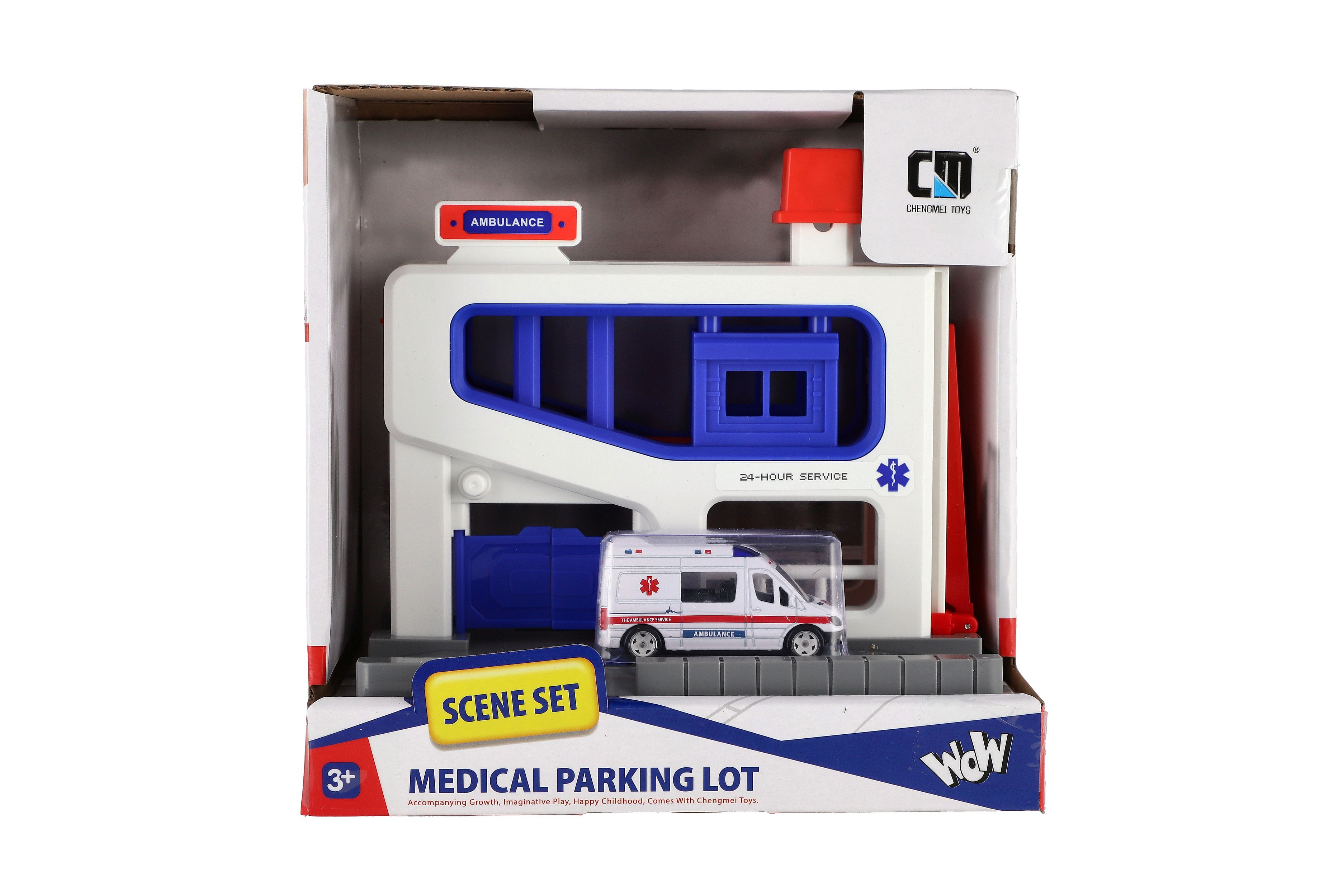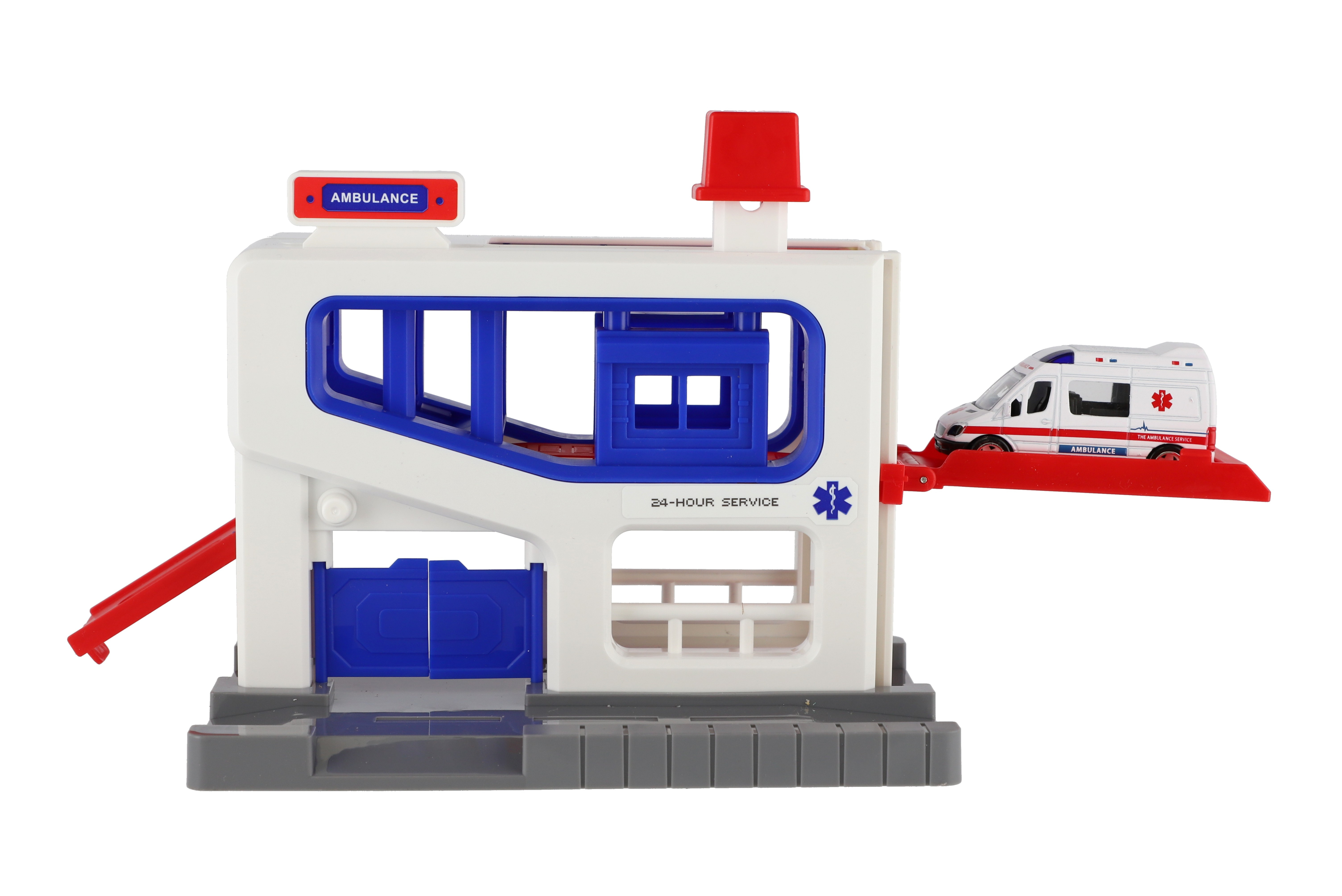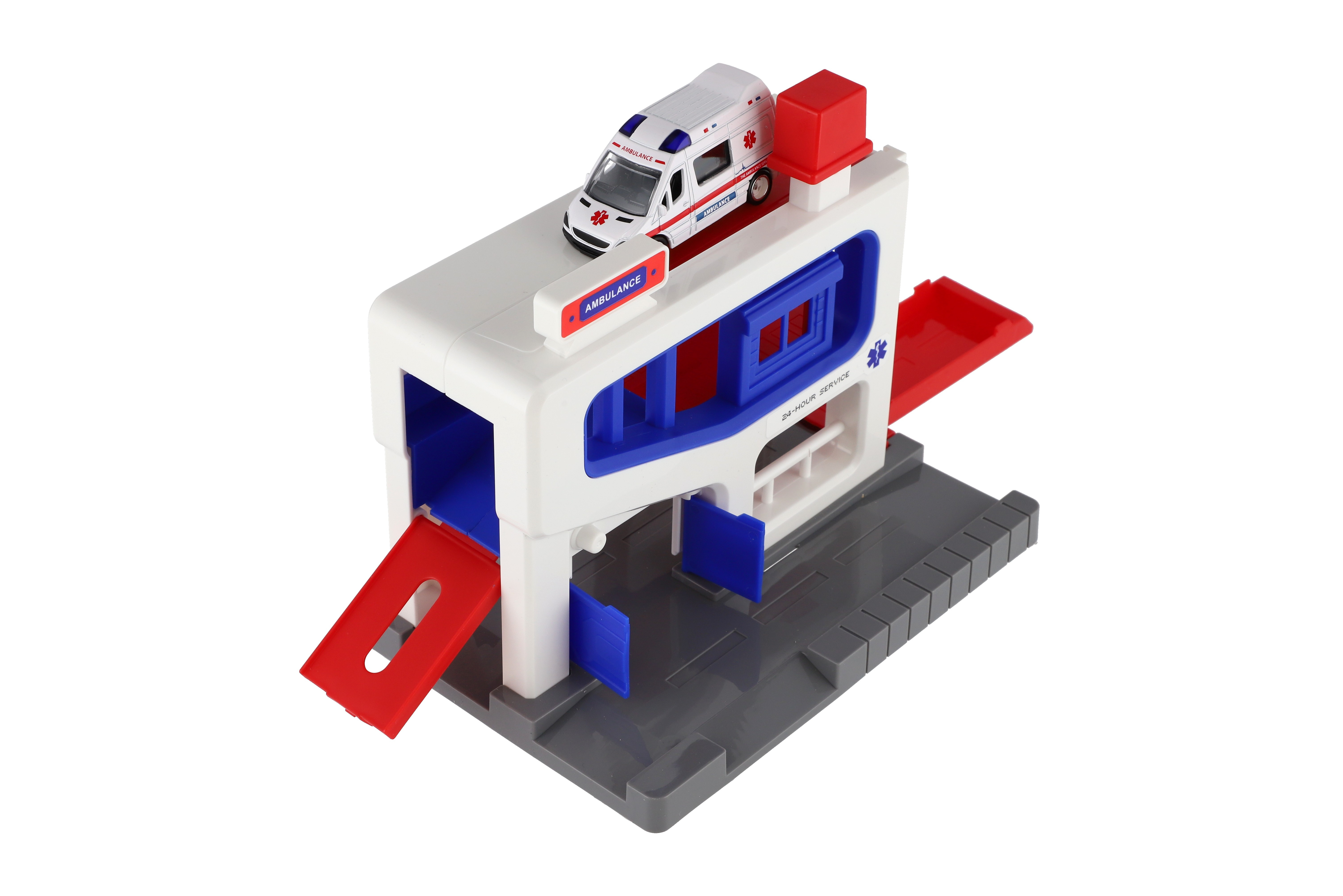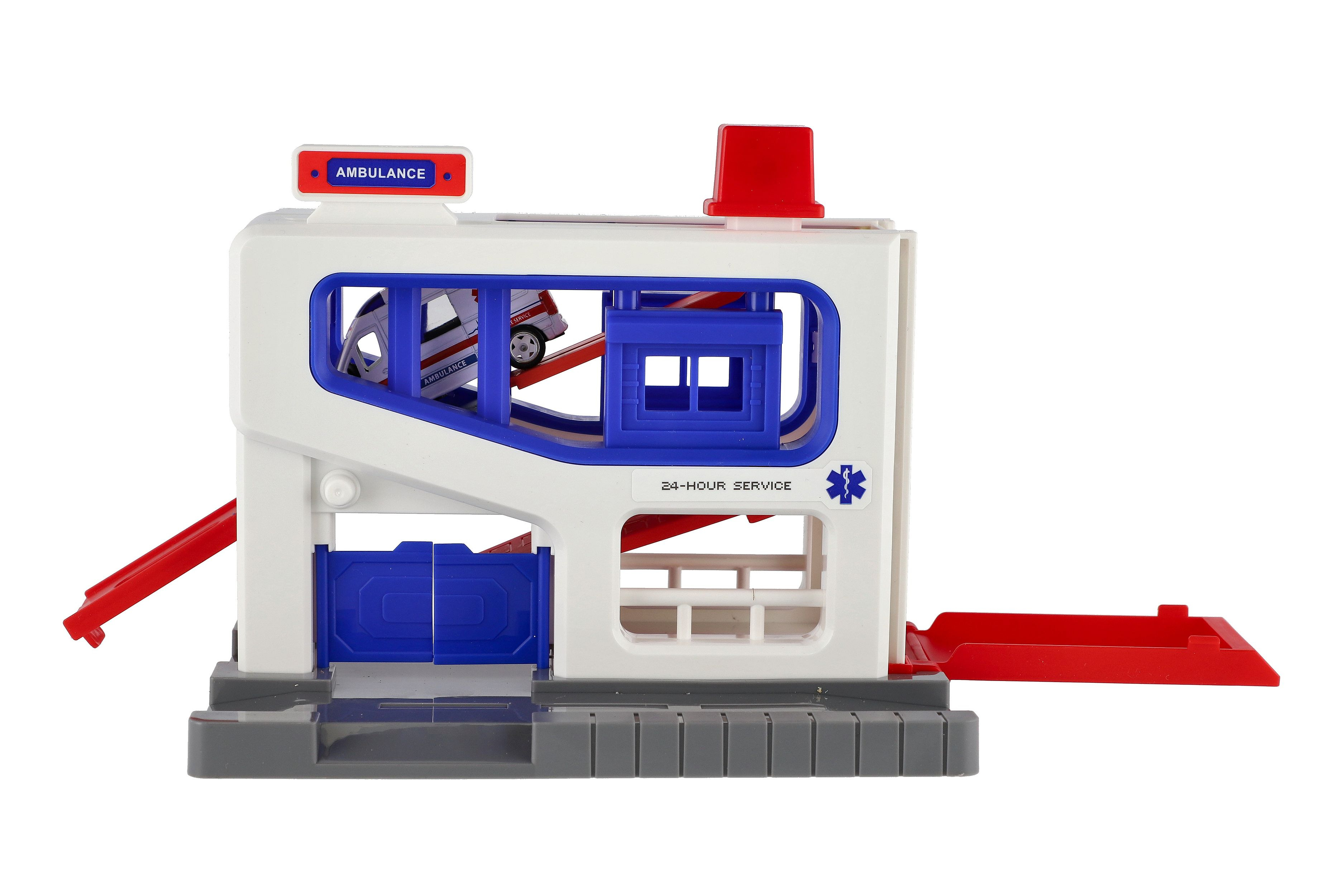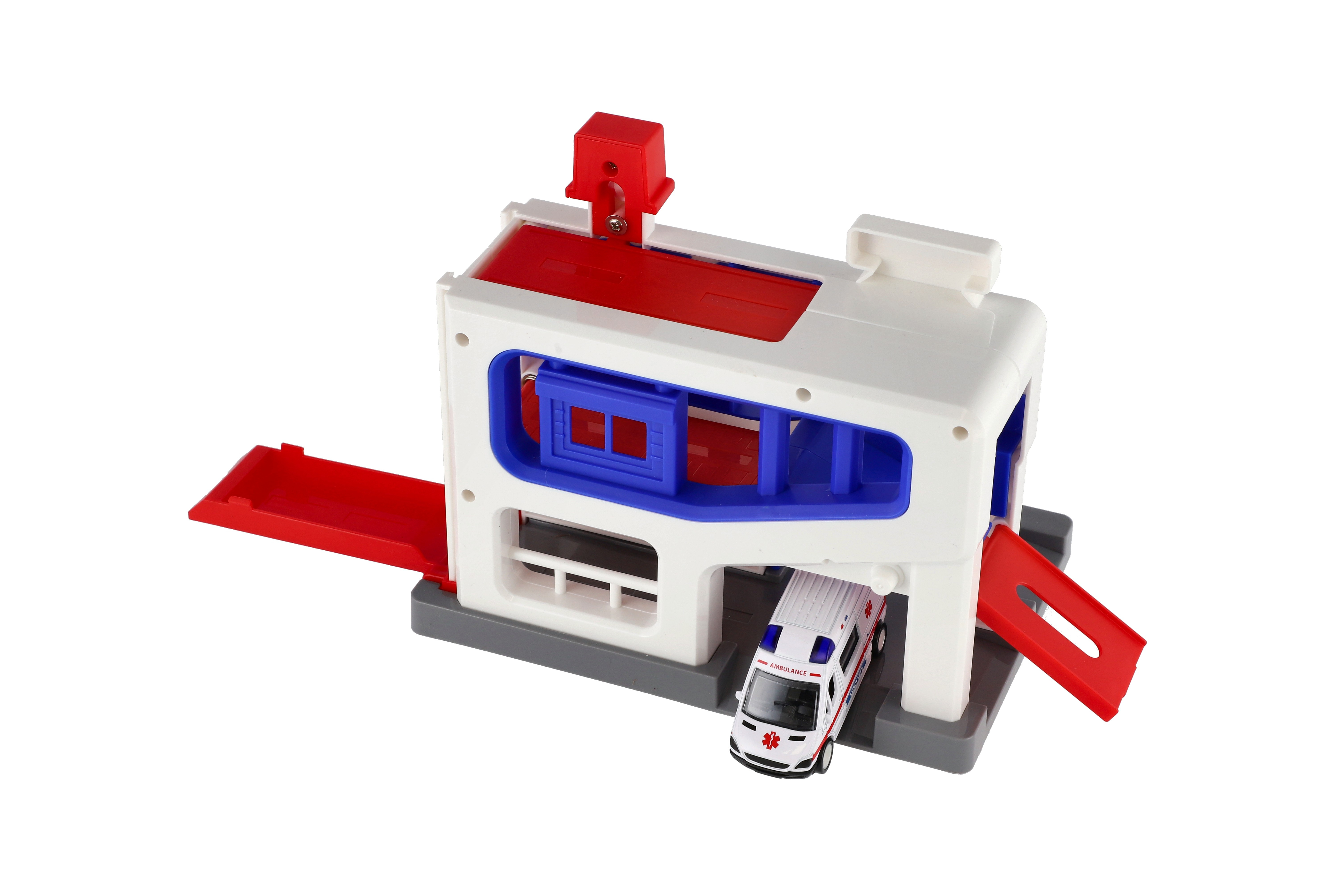 Beschreibung Teddies Parkhaus + Krankenwagen aus Kunststoff in Schachtel 20x20x14cm