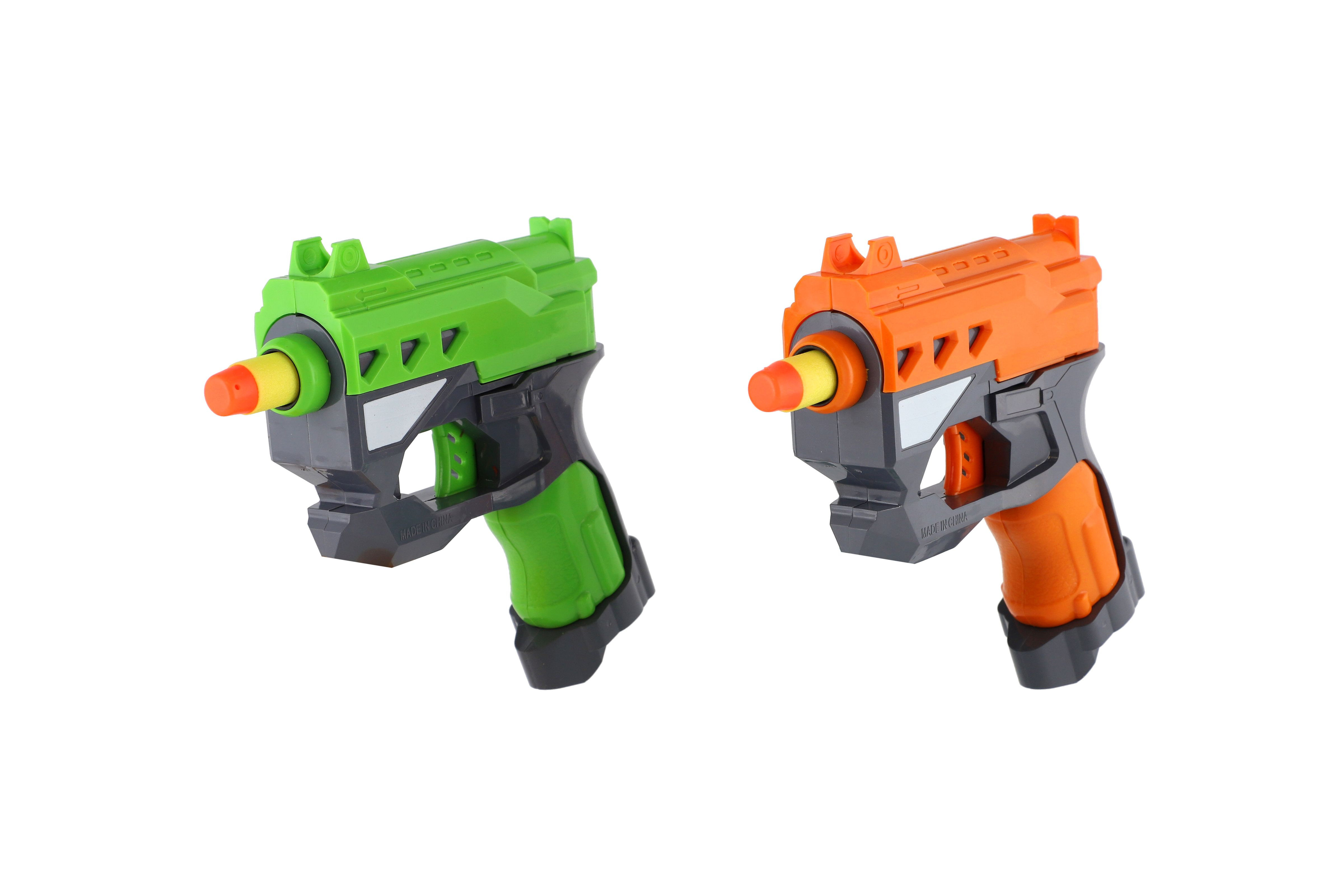 Spielerischer Spaß nicht nur für Jungs! Die Schaumstoff-Kugelpistole wird jeden kleinen Revolverhelden unterhalten. Legen Sie die Patrone in die Pistolenkammer und betätigen Sie den Abzug. Jetzt müssen Sie nur noch gut zielen und auf Ihren Gegner schießen! Das Paket enthält zwei Pistolen, ideal für Sie und Ihren Freund oder Ihr Geschwister. Ihnen stehen jeweils drei Kugeln zur Verfügung und das Spiel kann beginnen! Pistolengröße: 12 cm Verpackungsgröße: 22 x 29 x 5 cm Geeignet für Kinder ab 6 Jahren