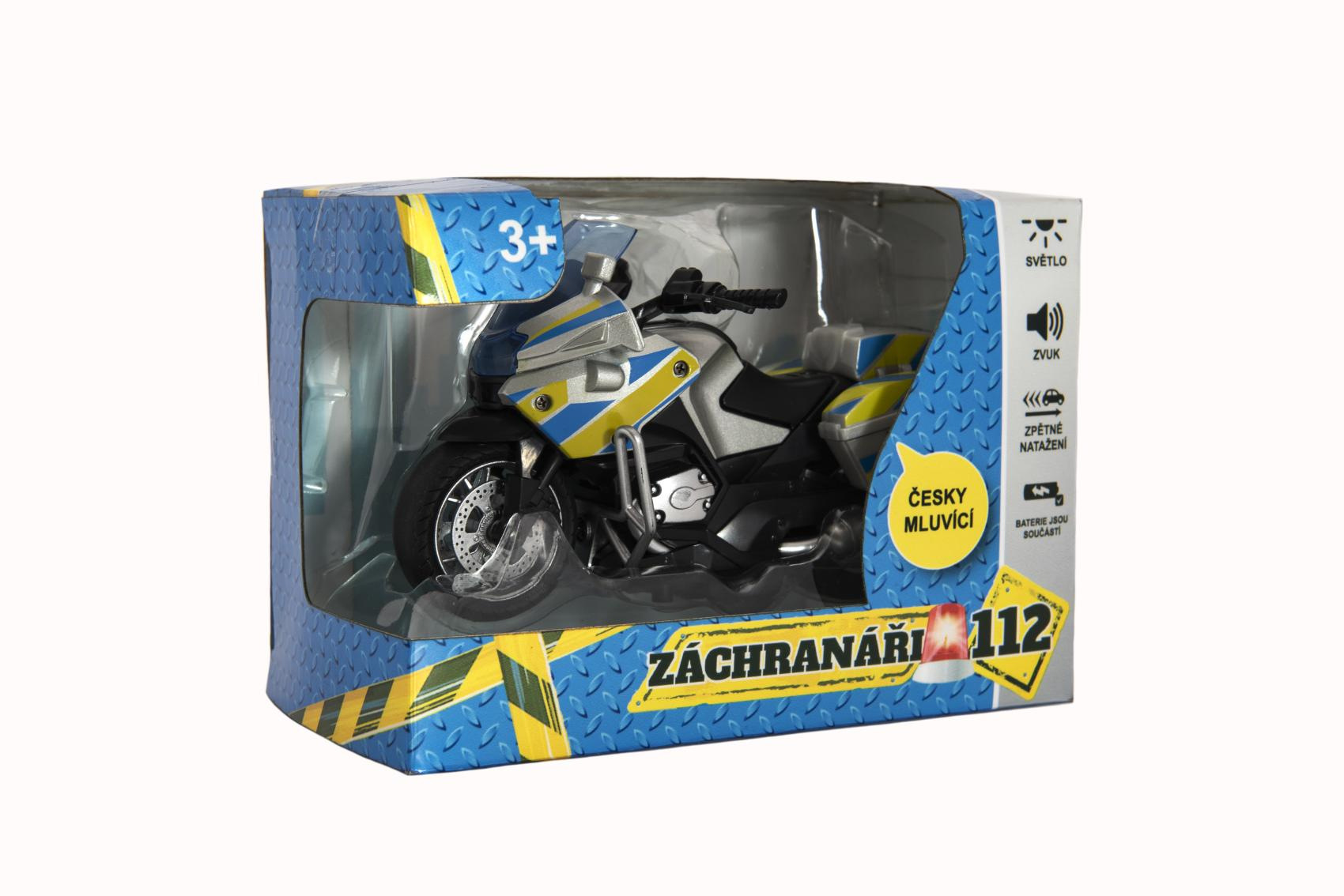Teddies Polizeimotorrad 12cm Metall/Kunststoff, spricht Tschechisch, mit Rückzug. auf der Fledermaus. mit Licht/Ton in der Box.15x11
