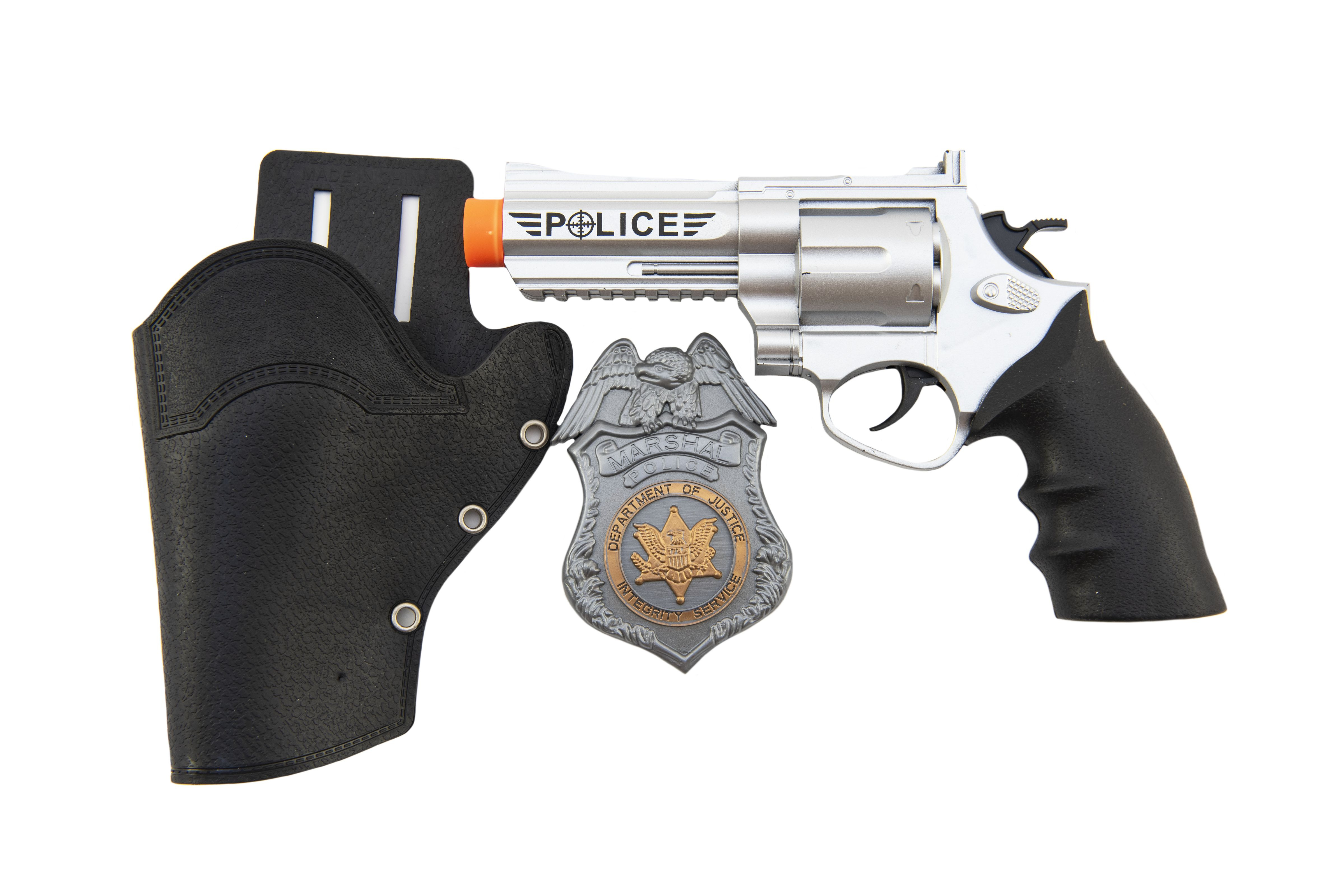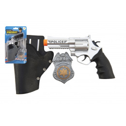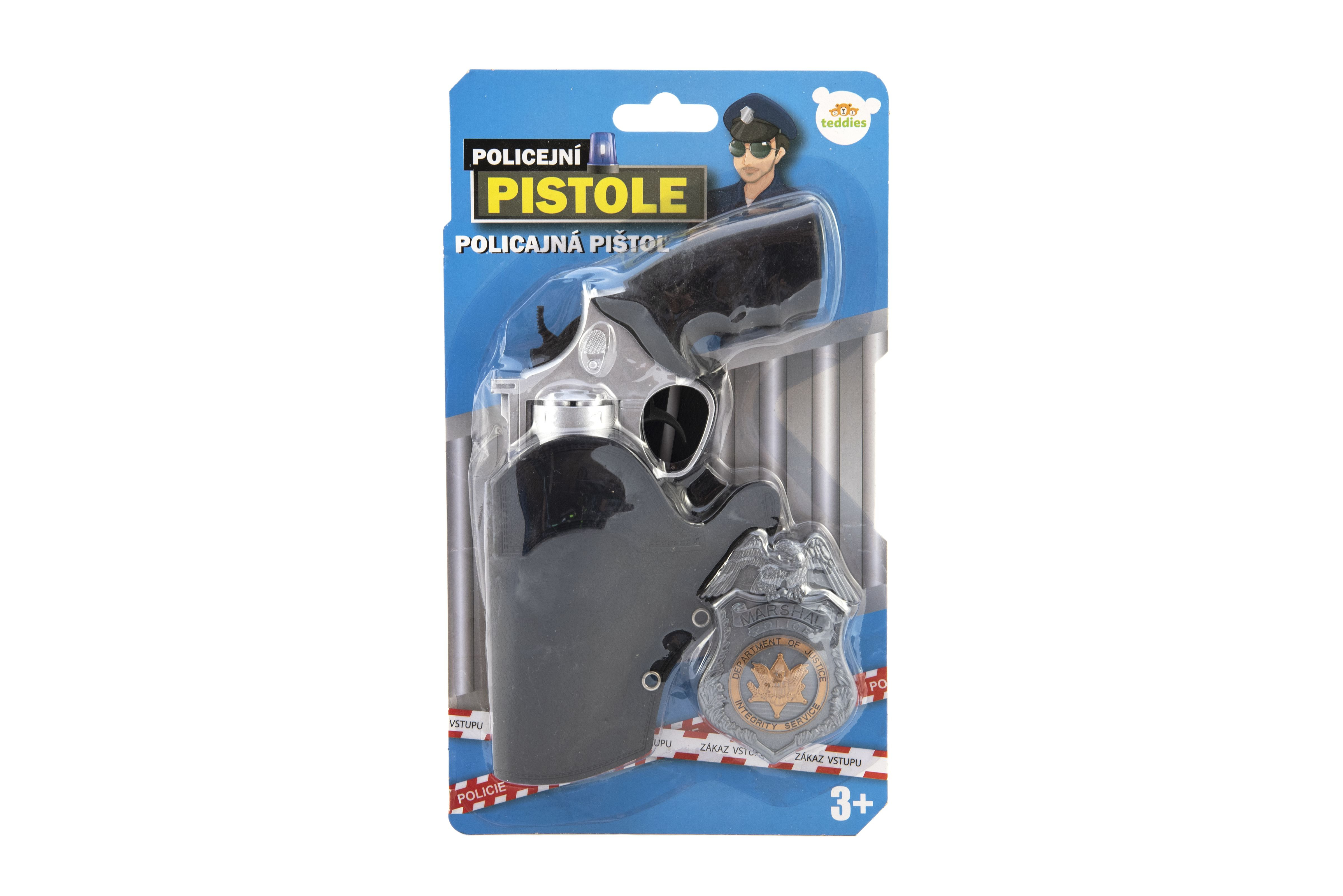 Teddies Polizeipistole klappernd 20 cm im Holster mit Abzeichen aus Kunststoff auf Karte