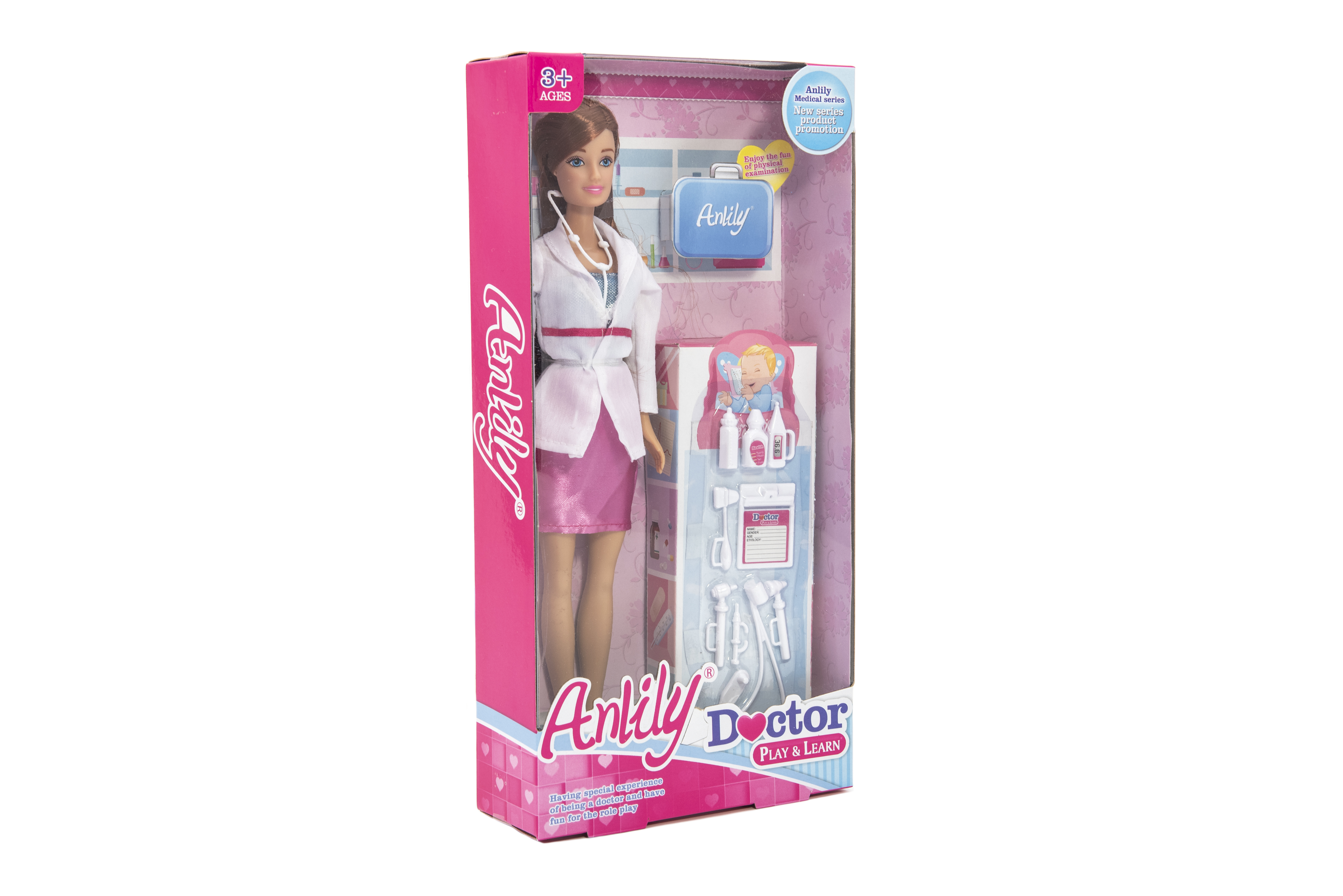 Beschreibung Teddies Puppe Anlily Ärztin gelenkig 30cm Kunststoff mit Zubehör 2 Farben in Schachtel 16x32x5,5cm
