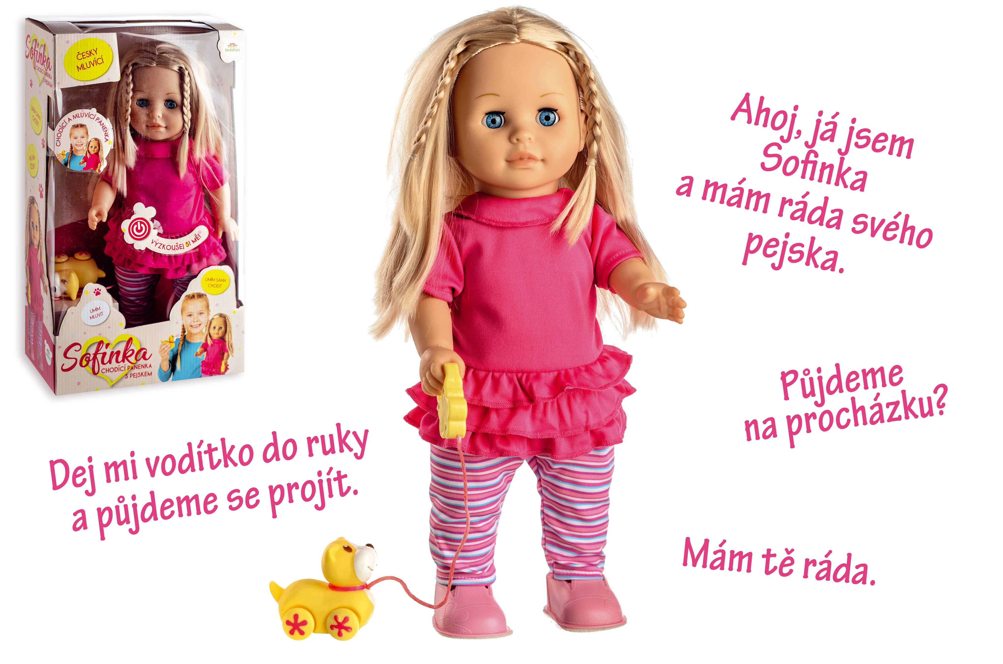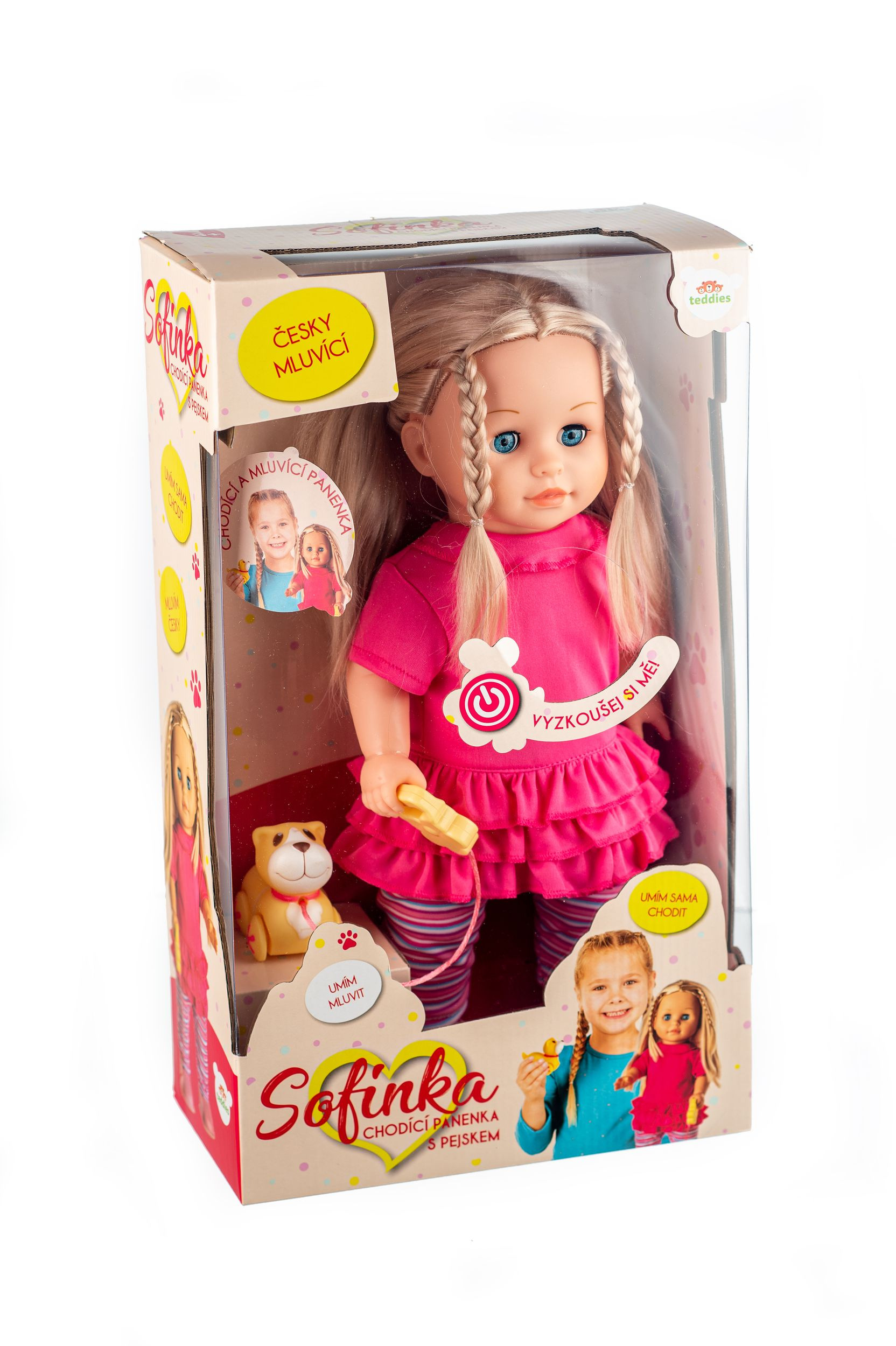 Beschreibung Teddies Puppe Sofinka mit Hund, gehend und sprechend, aus Kunststoff, 42 cm, batteriebetrieben, mit Sound, in Schachtel 26x44x13 cm