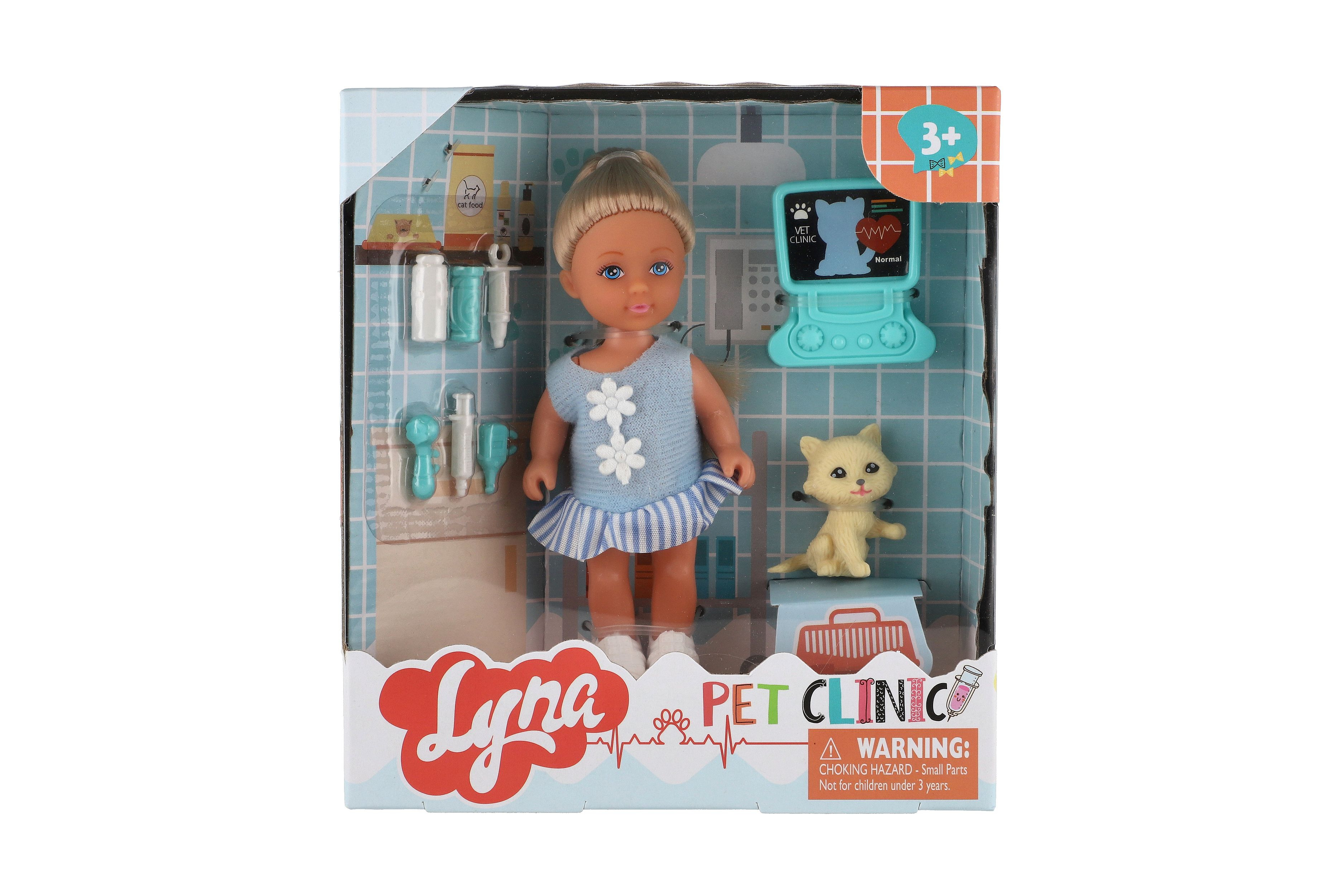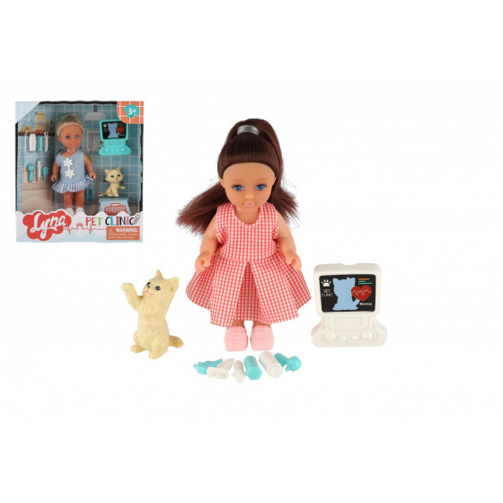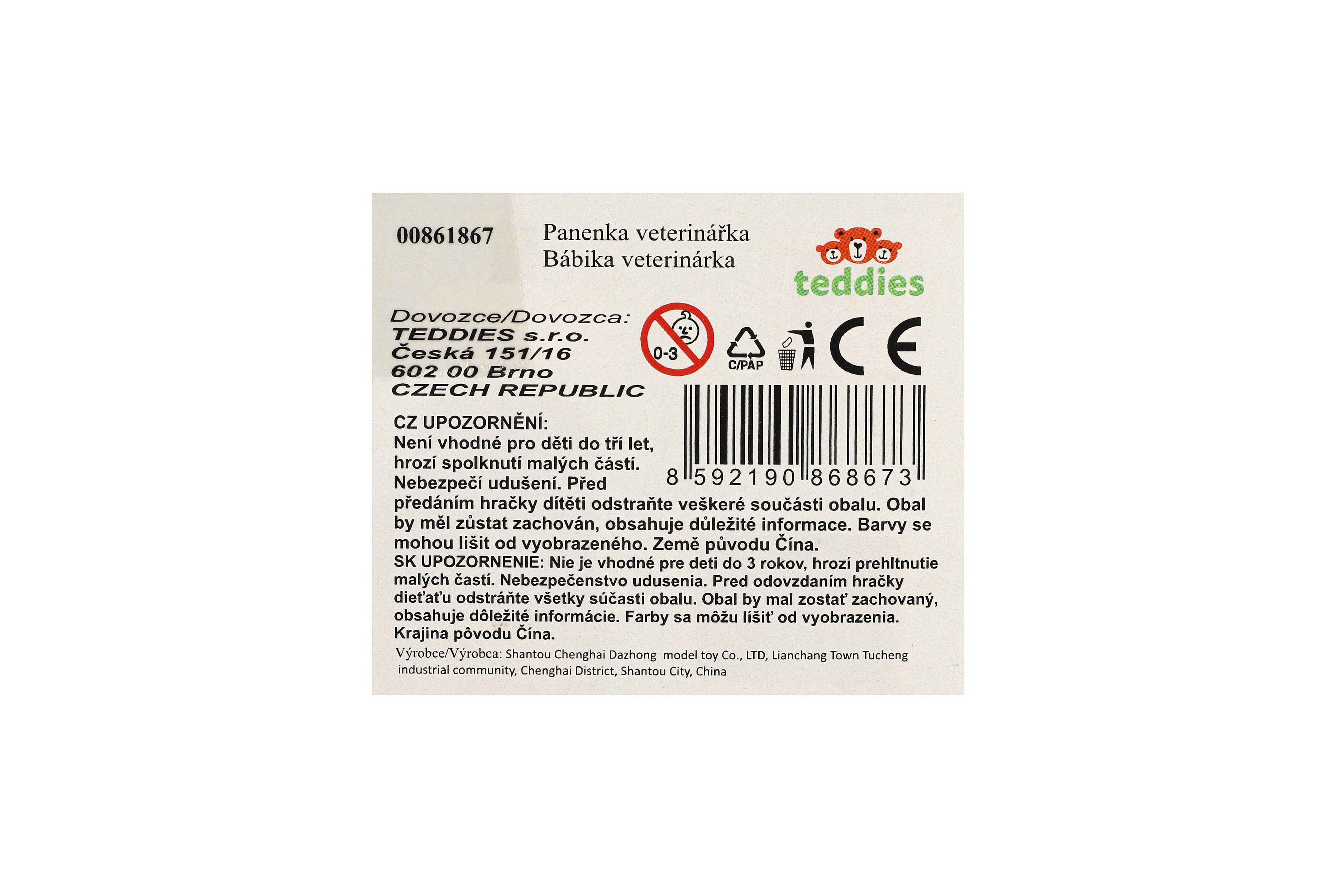Panenka veterinářka má pevné tělo a velikost je cca 11 cm. Sada obsahuje vše, co každý zvířecí doktor potřebuje pro vyšetření a uzdravení domácích mazlíčků. Rozměry balení 15 x 16 x 4,5 cm. Vhodné pro děti od 3 let.
