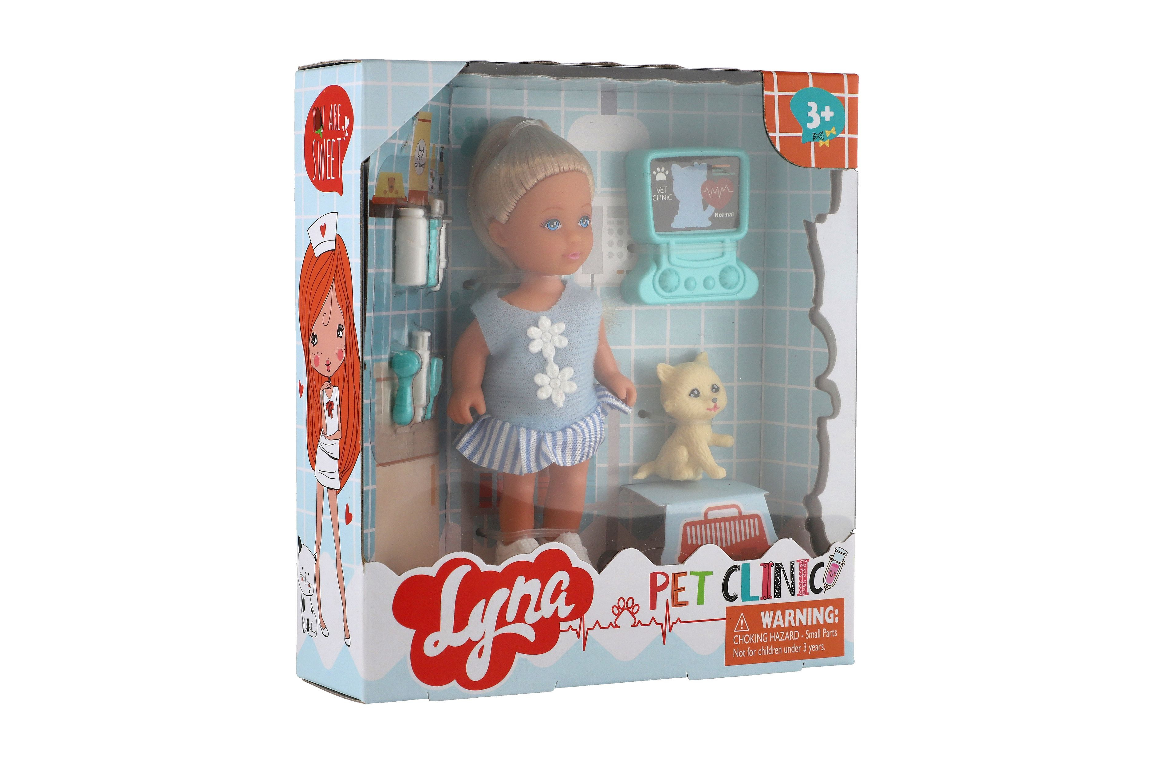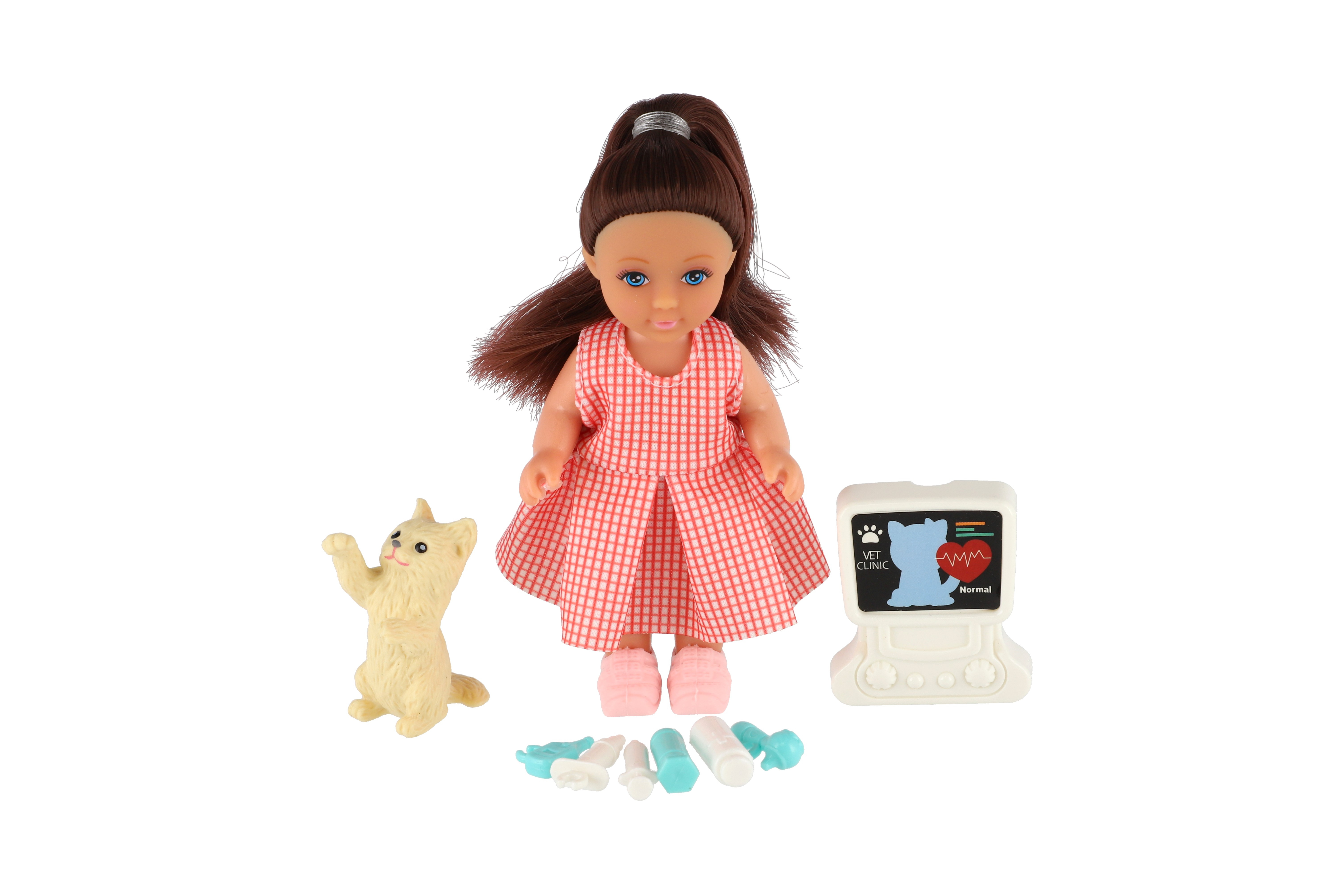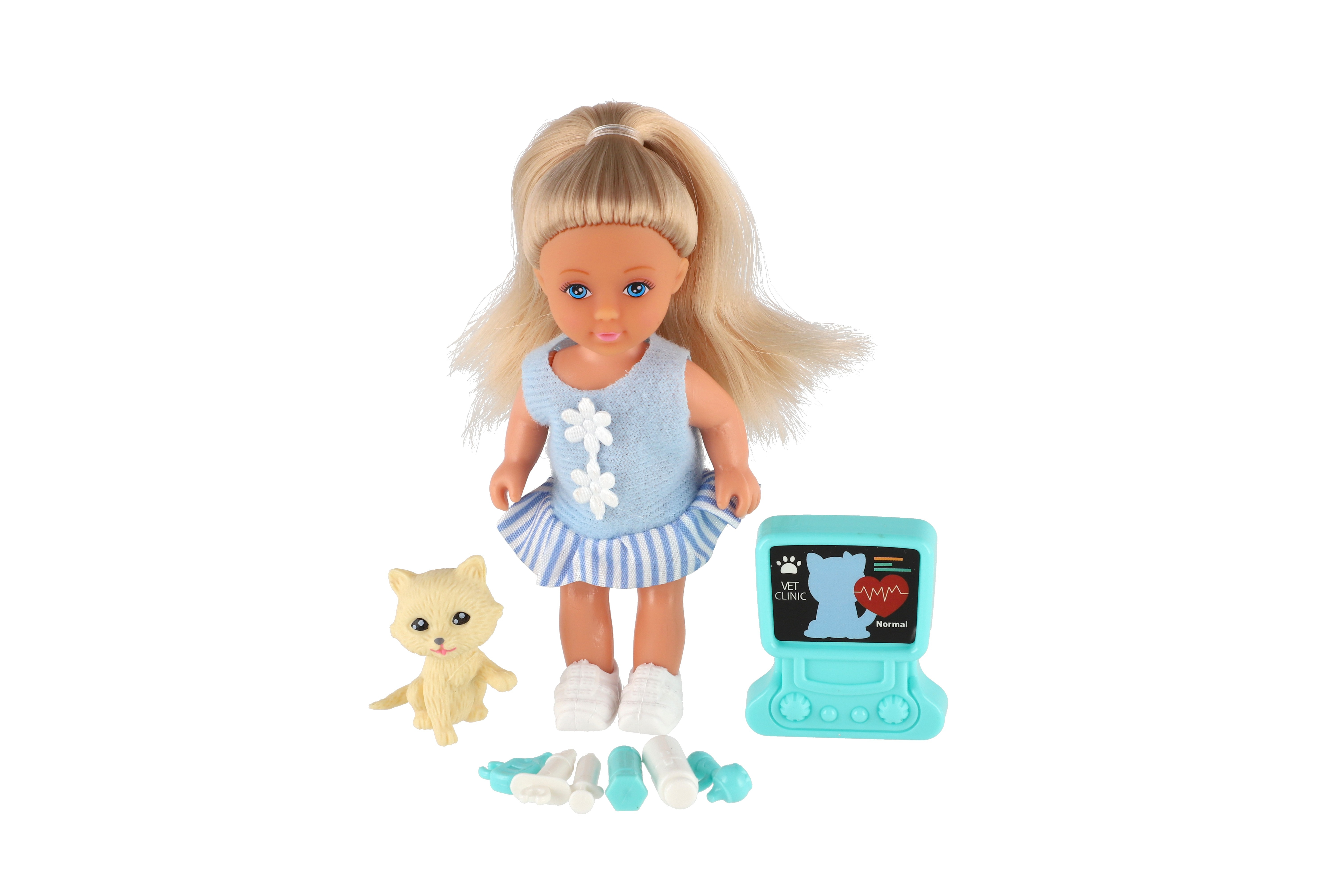 Beschreibung Teddies Puppe Tierärztin Kunststoff 11cm fester Körper mit Zubehör 2 Arten in Schachtel 15x16x4,5cm