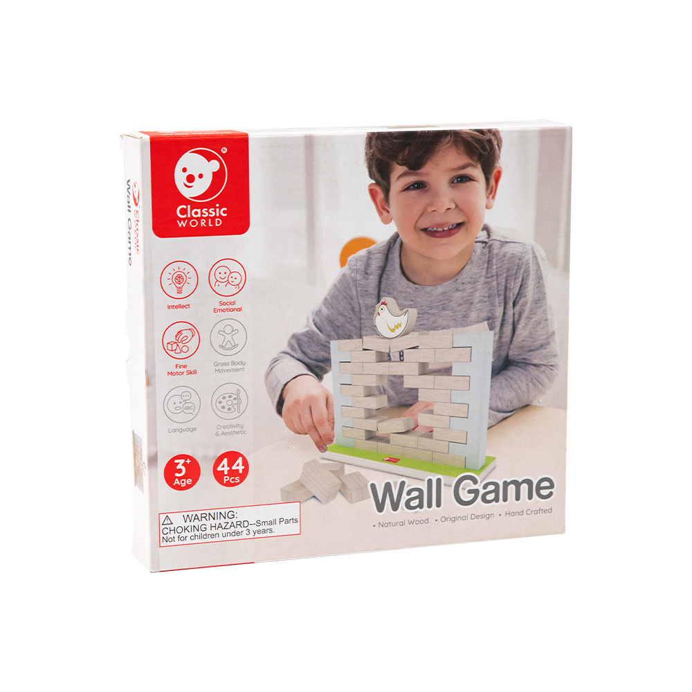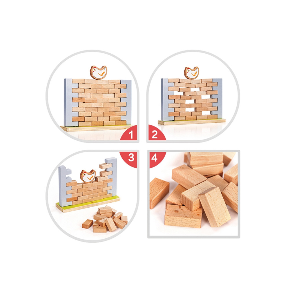 Skvělá dřevěná hra pro celou rodinu, jejíž hlavní předností jsou jednoduchá pravidla, logické myšlení a zábava pro všechny věkové kategorie. Postavte zeď ze speciálně připravených bloků. Umístěte slepici na vrchol a pak cihly jednu po druhé vytáhněte ze zdi. Když se zeď zhroutí, hra končí. Při hře se vaše batole naučí soustředění, strategii a řešení problémů a zlepší si koordinaci rukou a očí. Rozměr balení: 26 x 24,5 x 4 cm Vhodné pro děti od 3 let