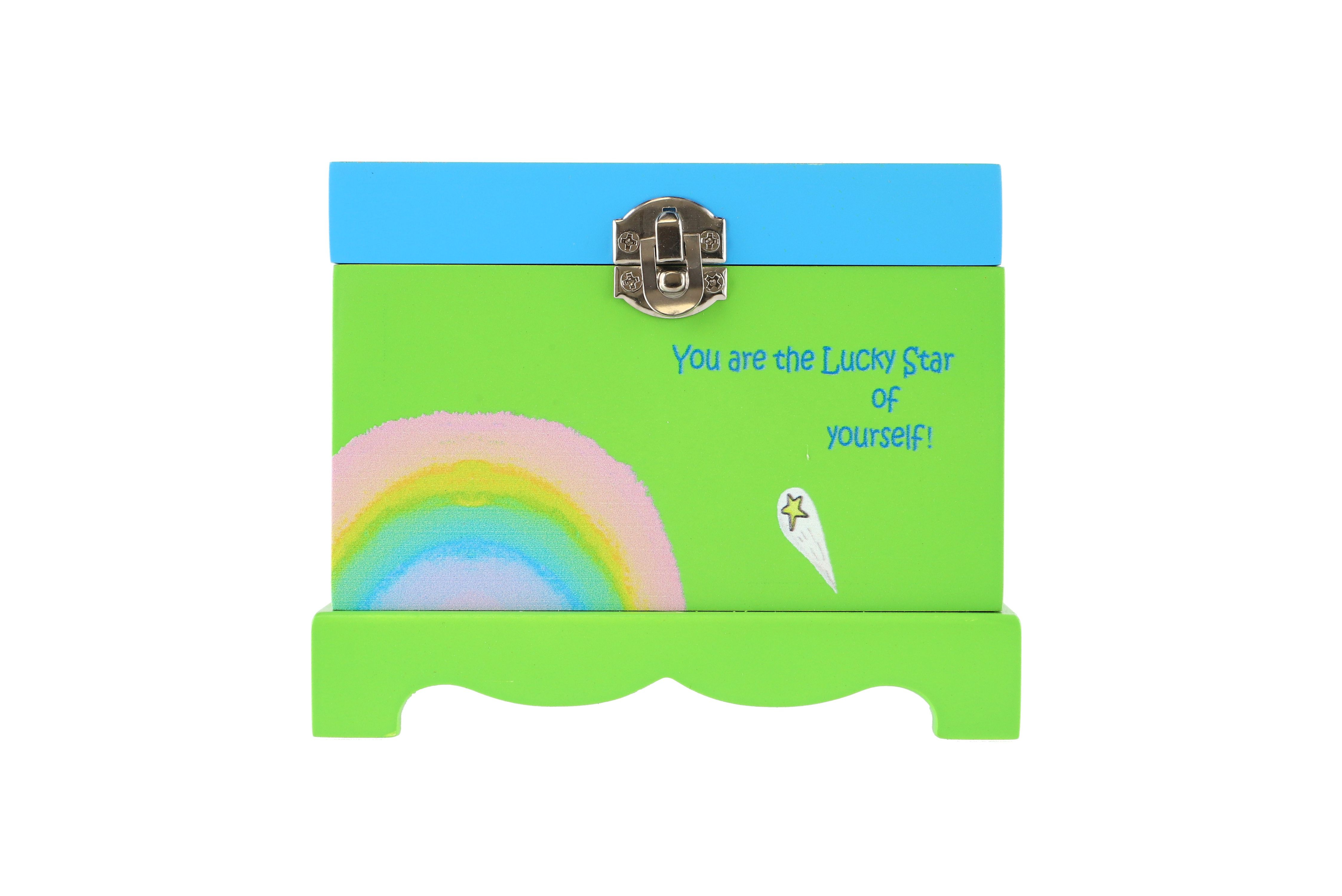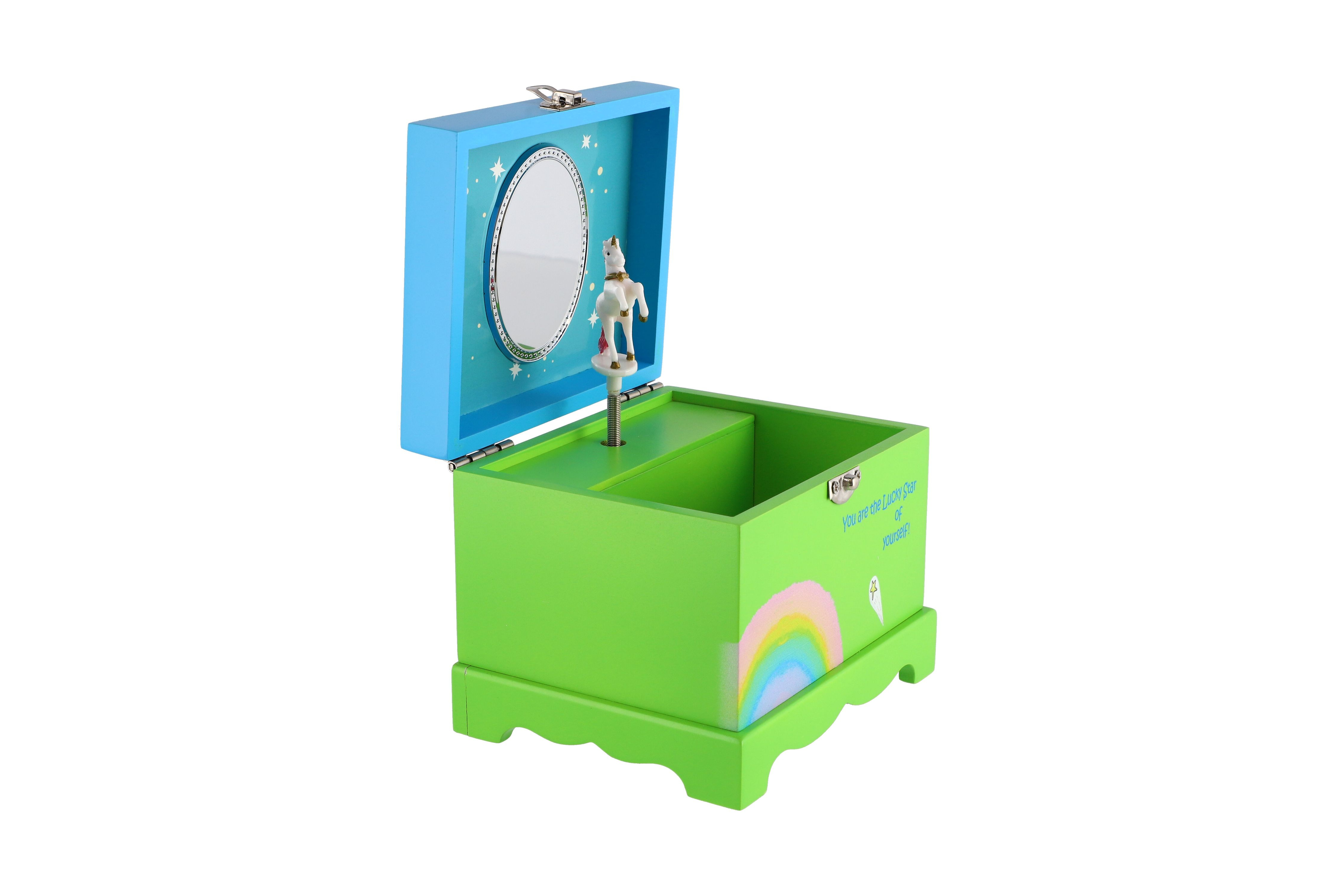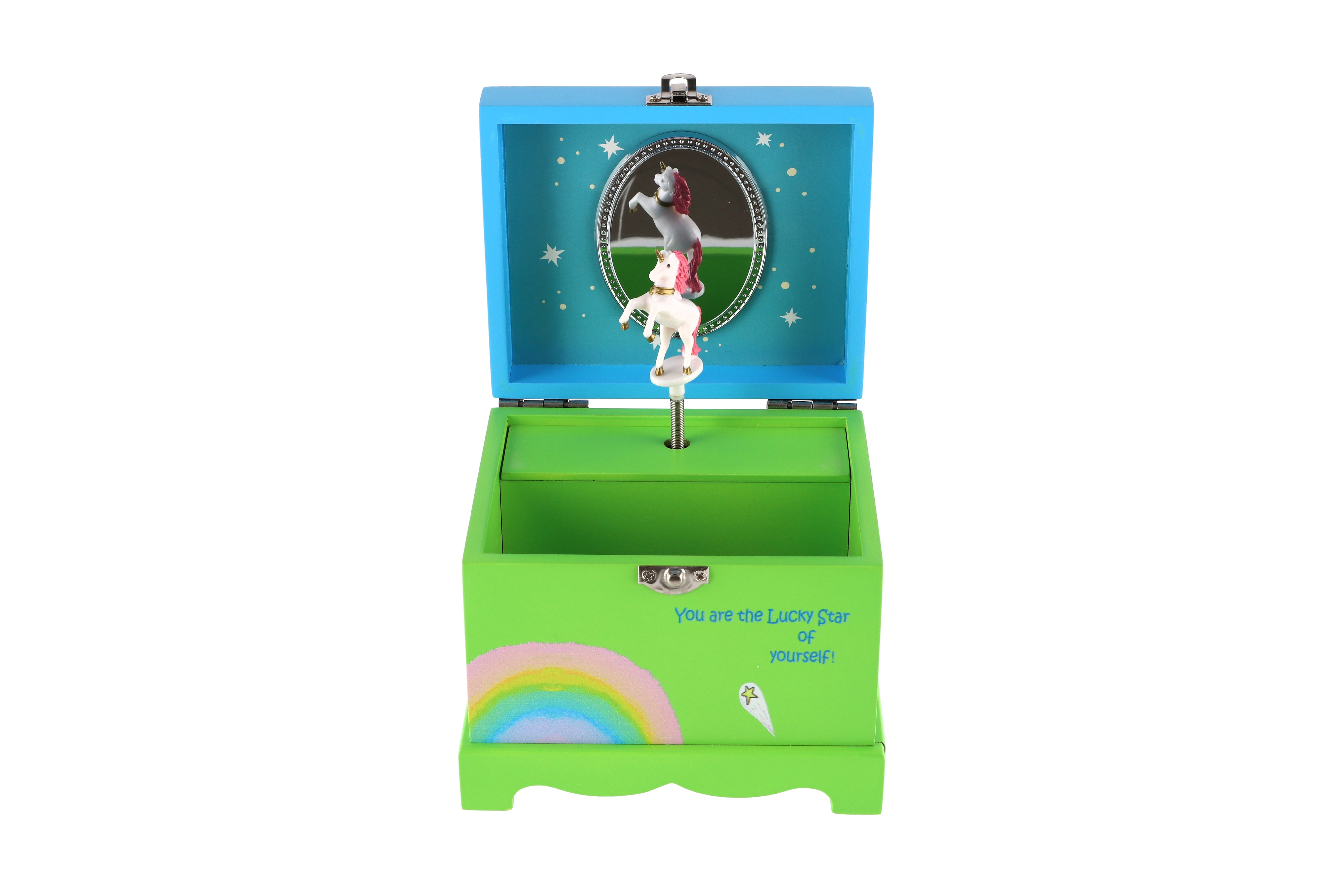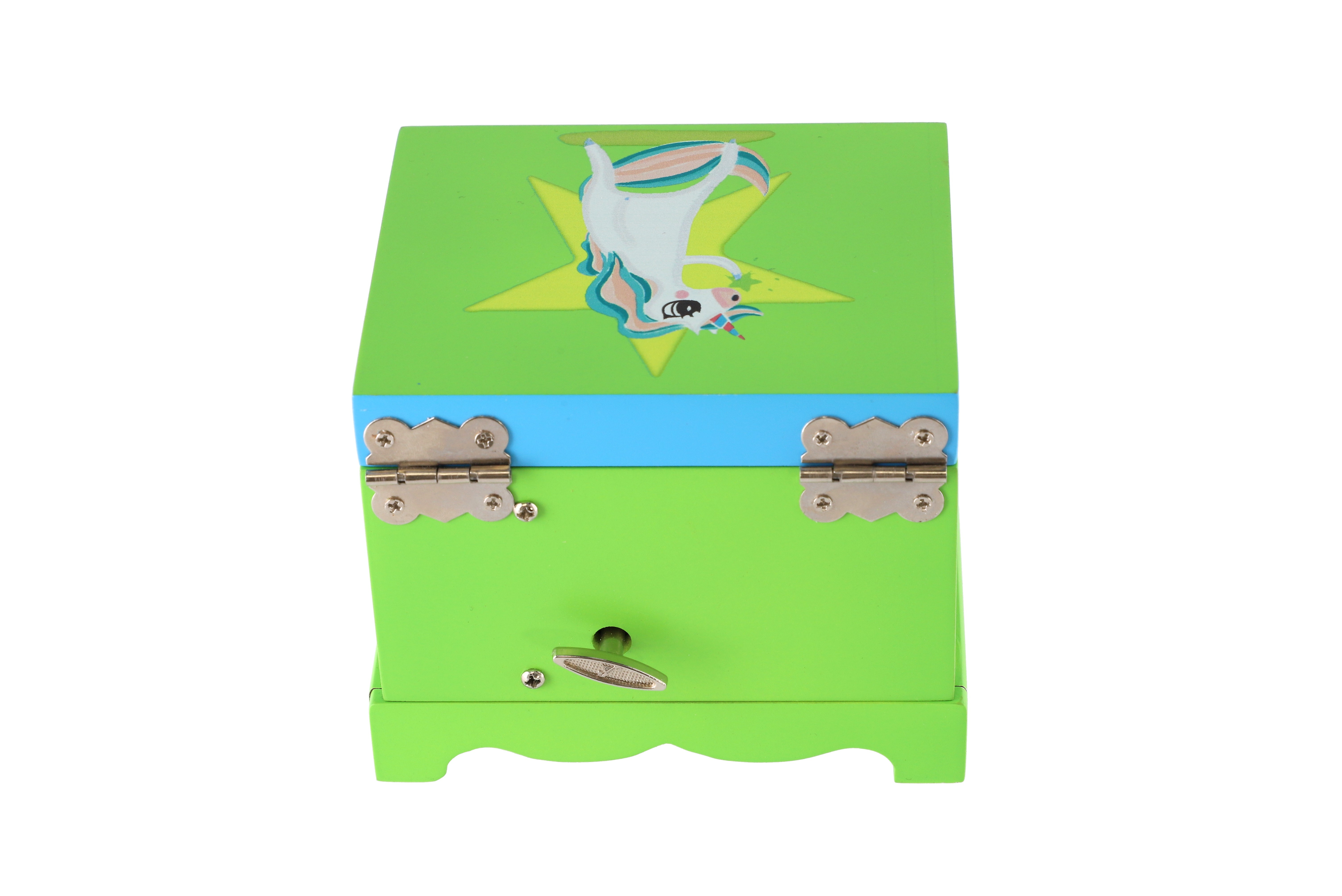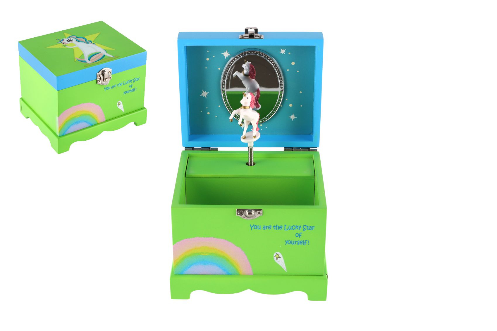 Tato hrací šperkovnice bude ideálním místem pro uložení pokladů každé dívky. Šperkovnice je vyrobena ze dřeva, má krásnou zelenou barvu a je zdobena hvězdou a motivem jednorožce, což z ní dělá ideální doplněk pro dětský pokoj. Pod krytem se zrcadlem je prostor pro suvenýry nebo šperky. Také zde je bílo-růžový jednorožec, který se po natažení klíčku točí a hraje. Rozměr šperkovnice: 12,5x12,5x10cm Není hračka