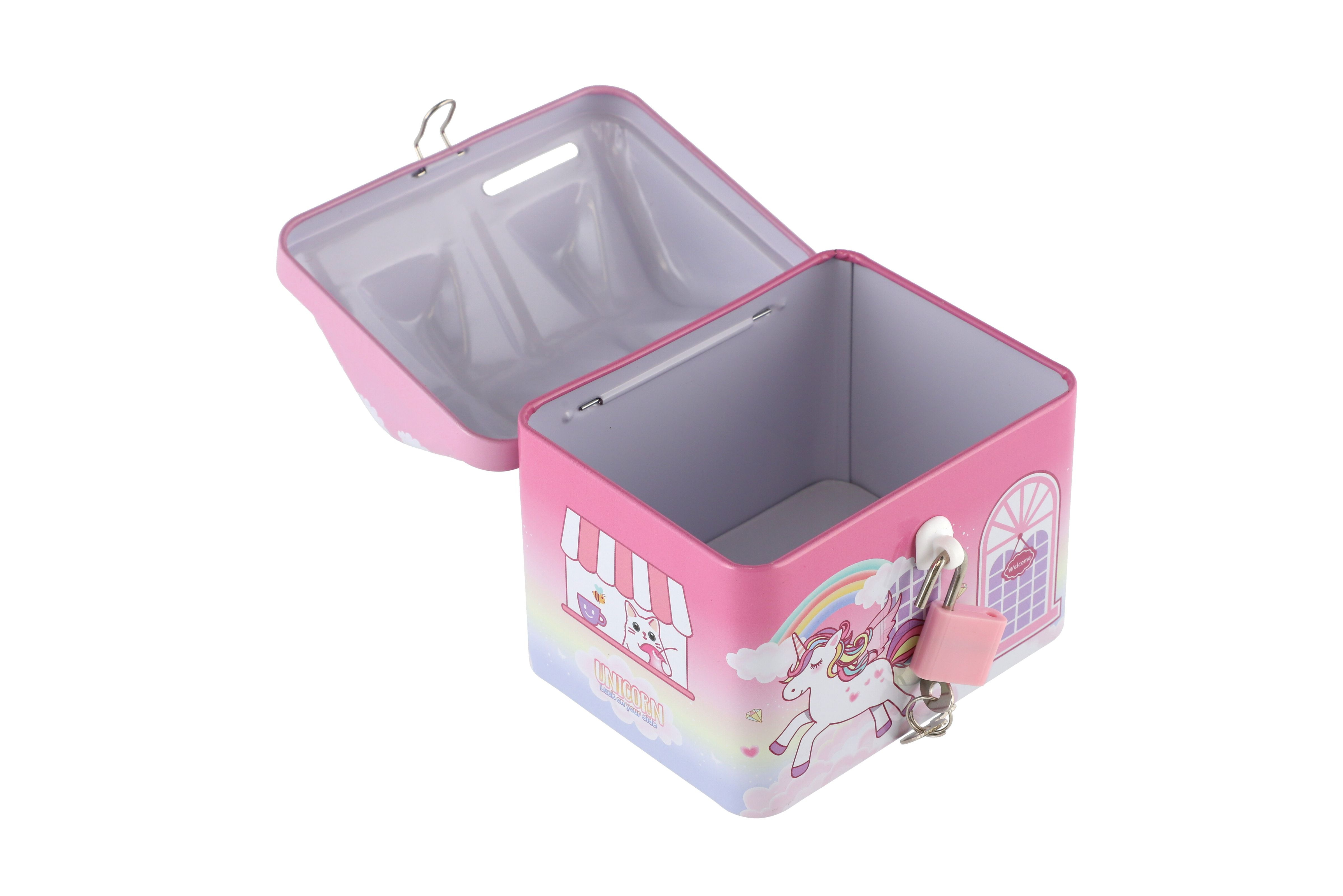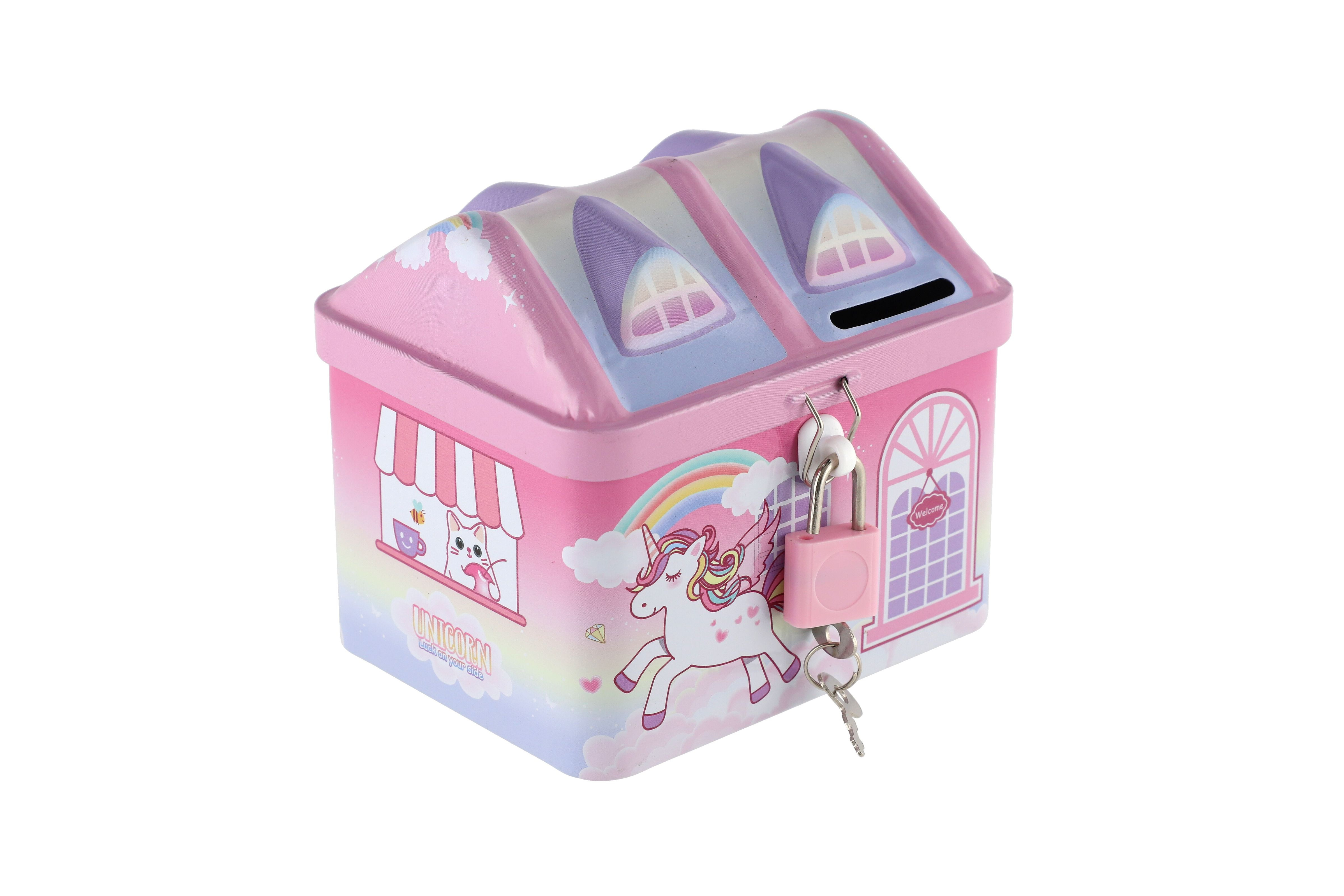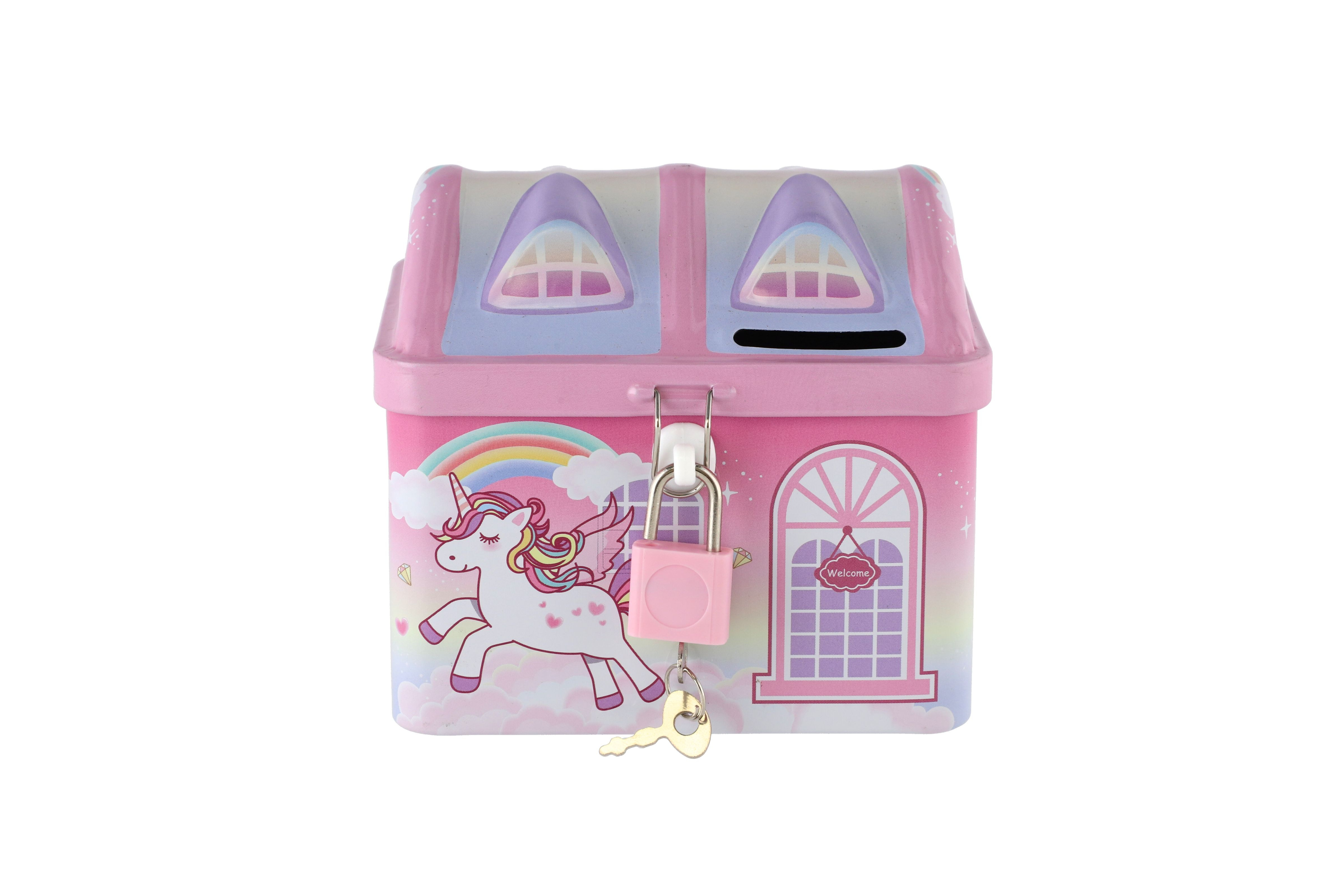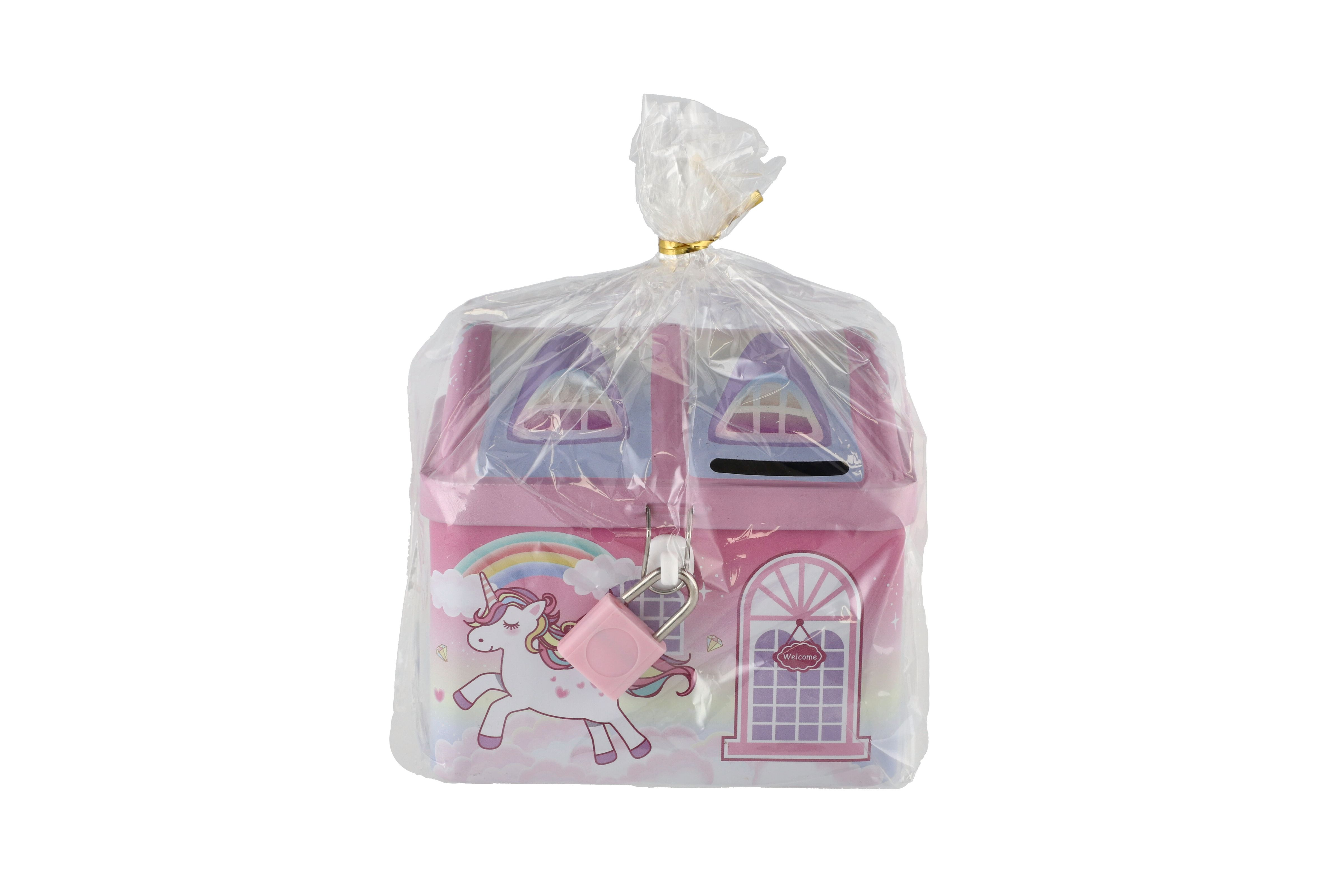 Beschreibung Teddies Spardose Häuschen Einhorn aus Blech mit Schloss 11x9cm rosa im Beutel