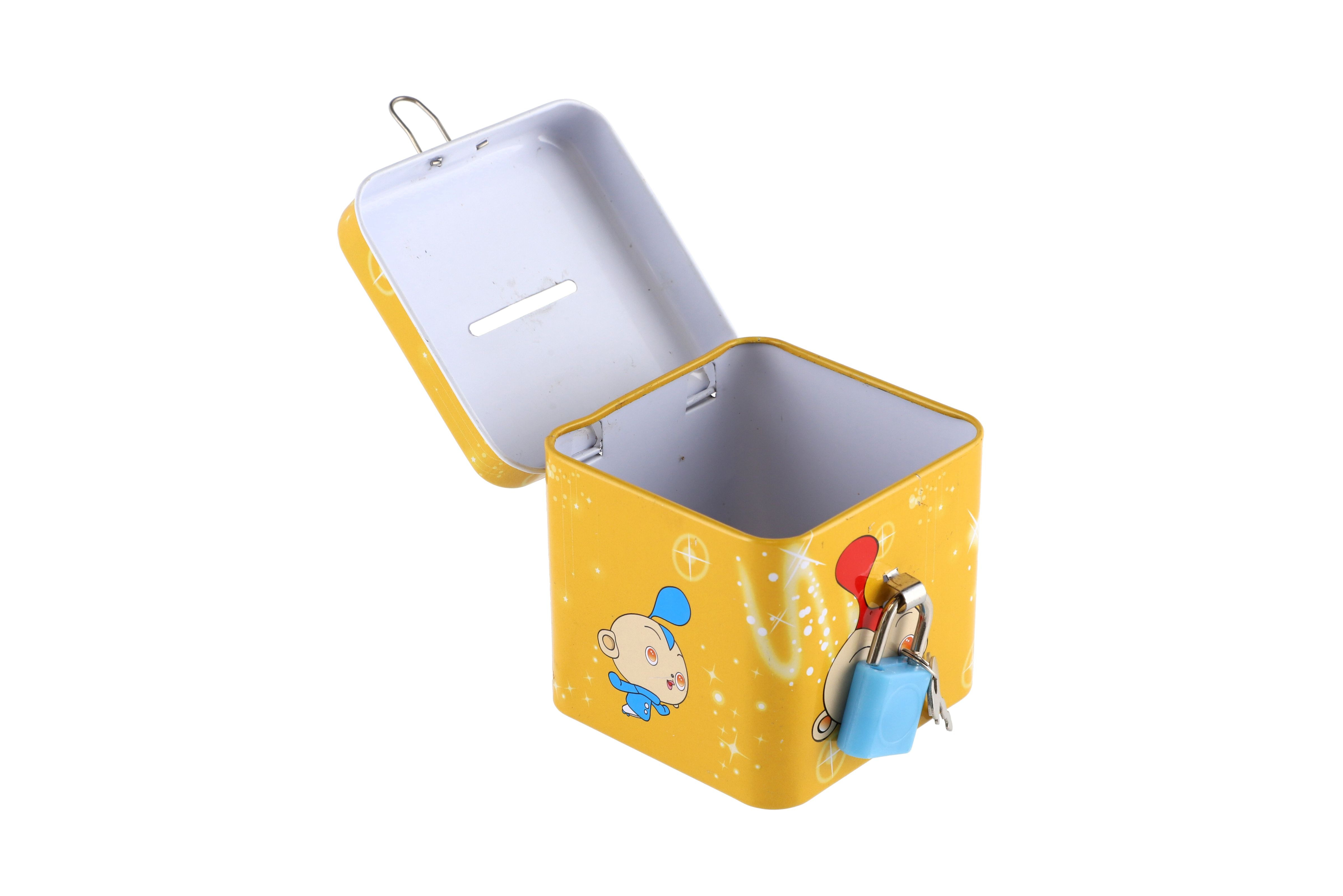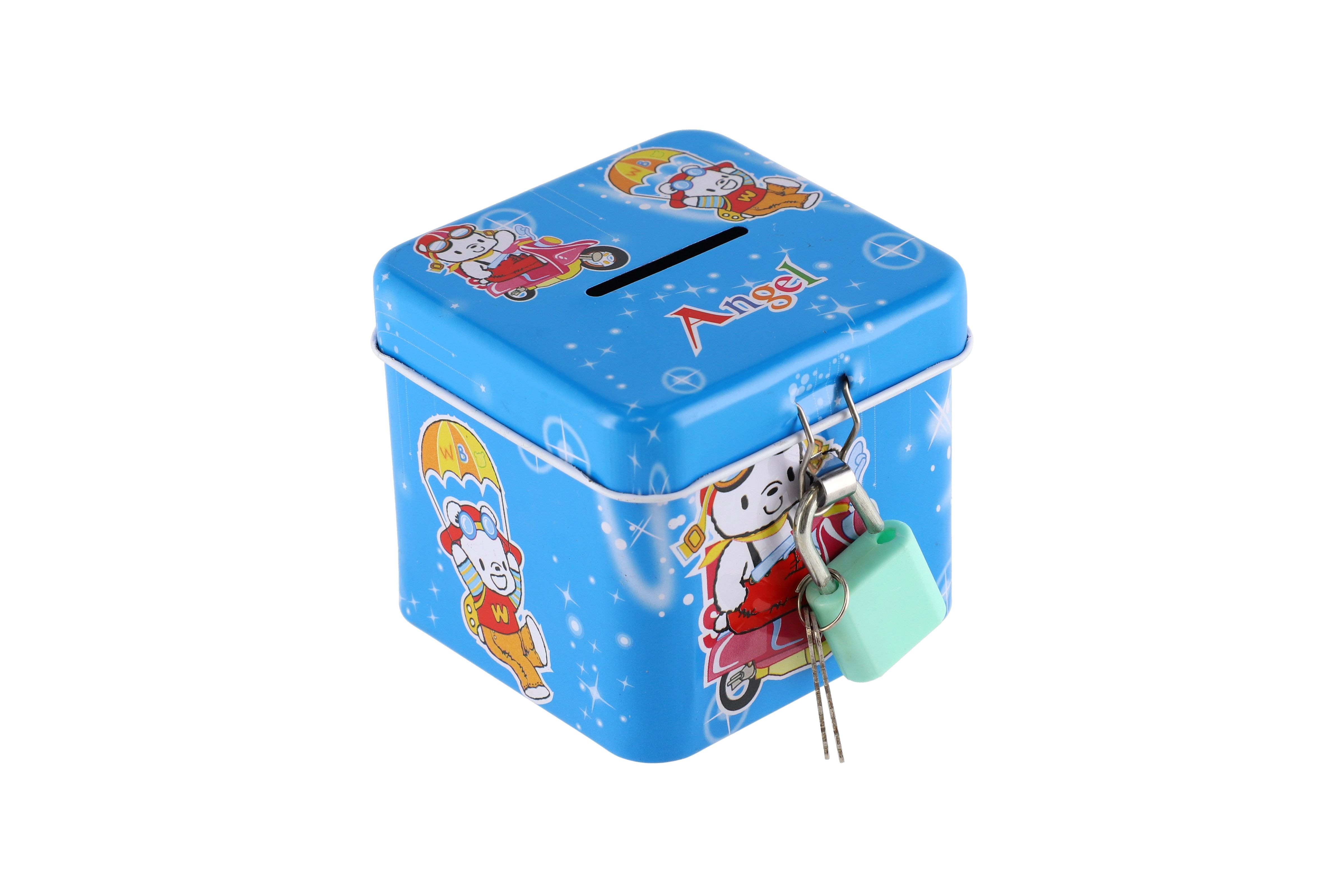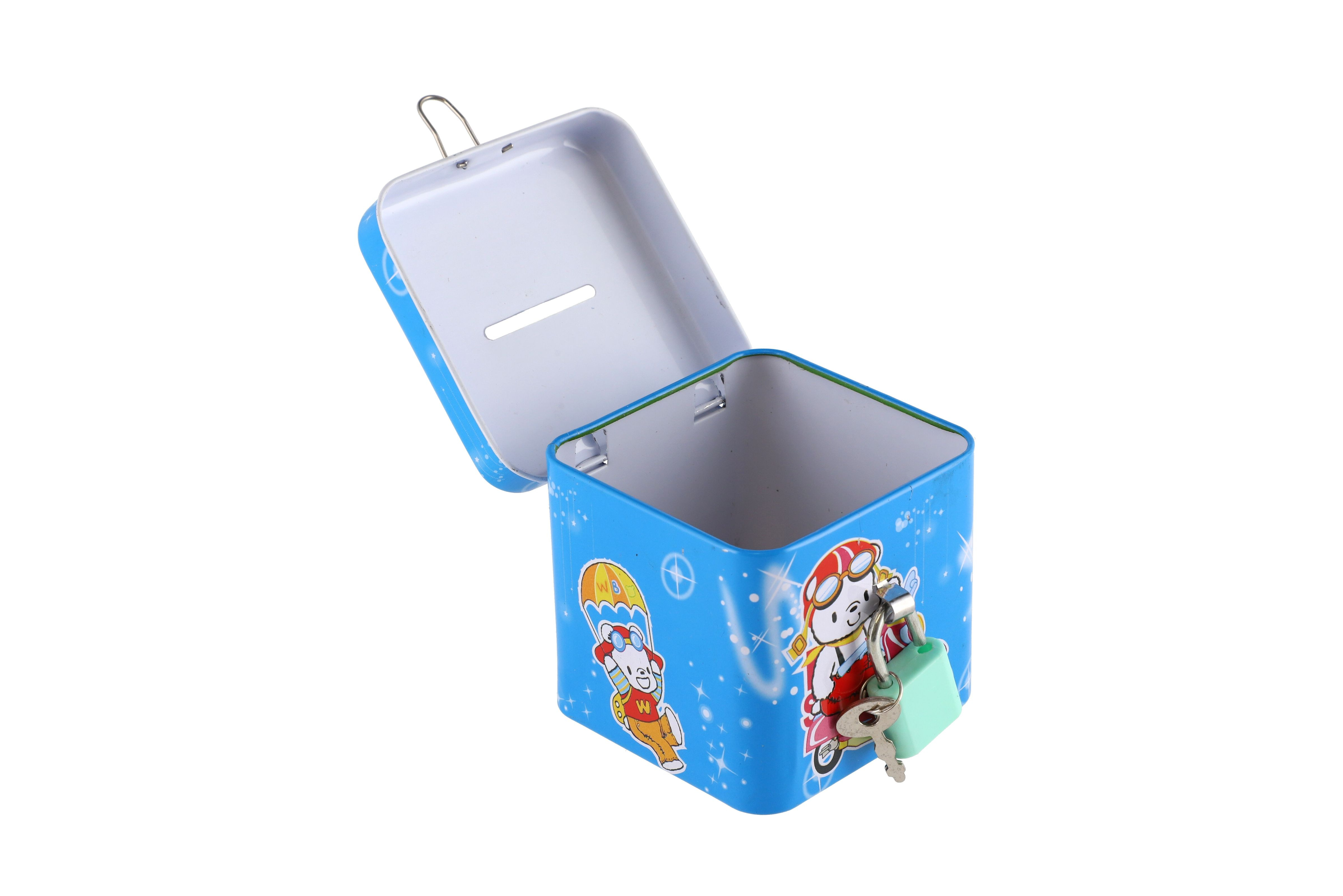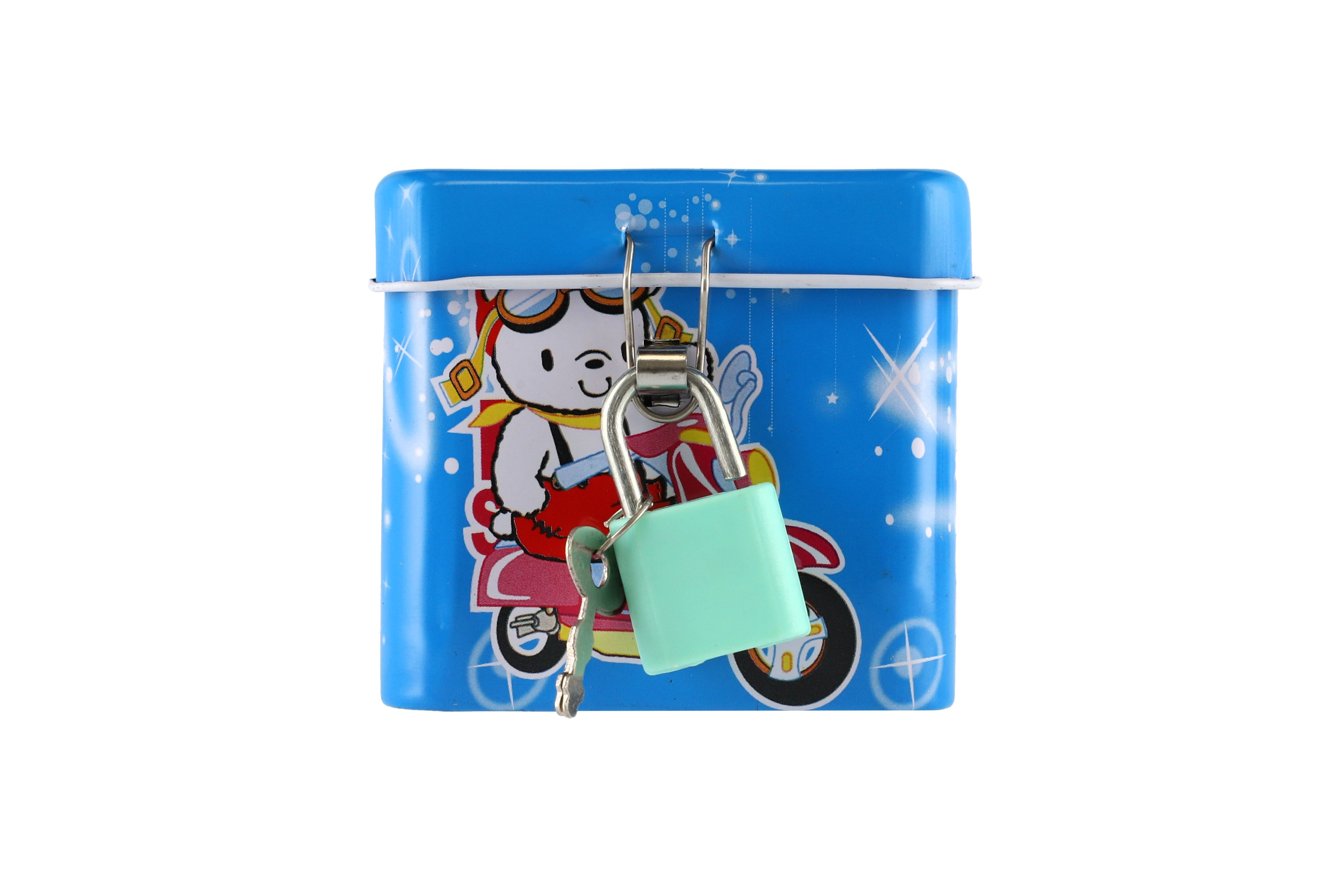 Beschreibung Teddies Spardose mit Schloss, Blechwürfel 7x6cm, 4 Farben