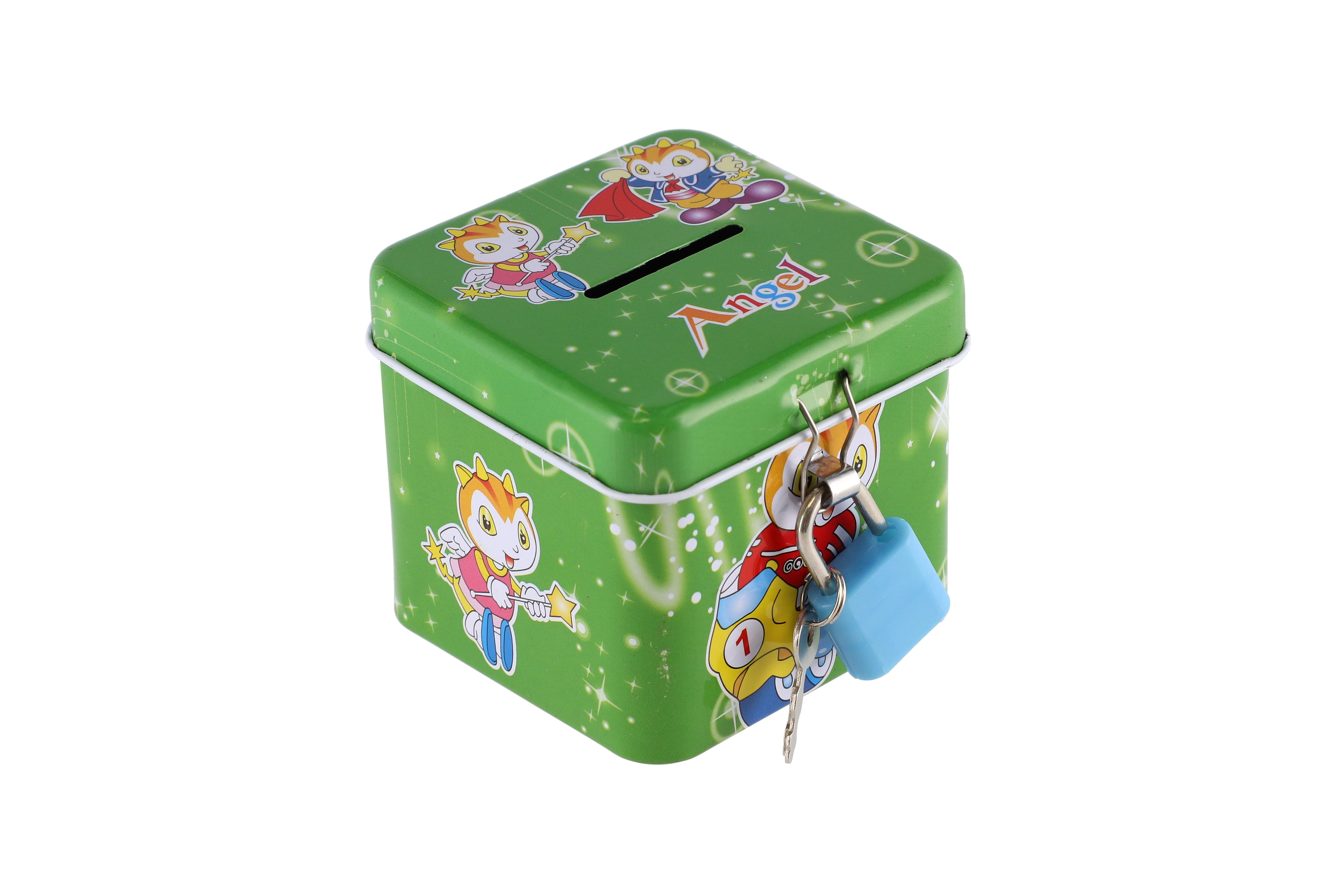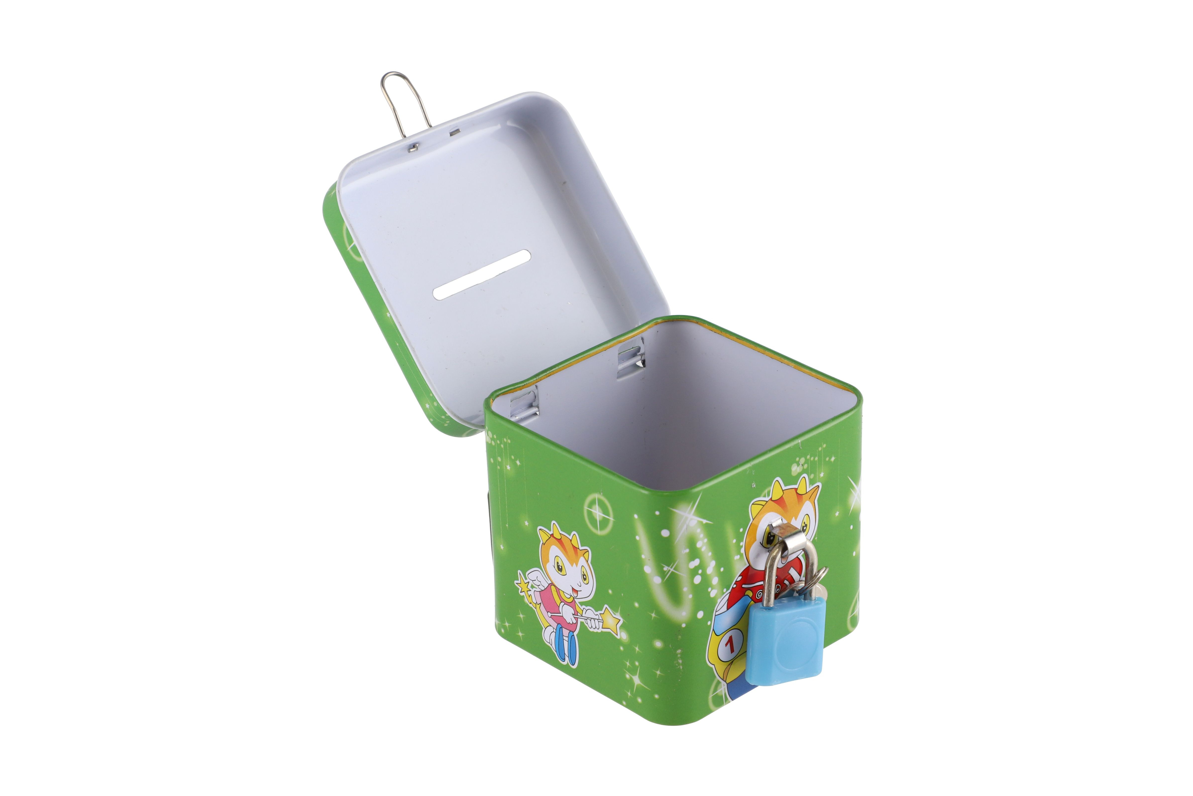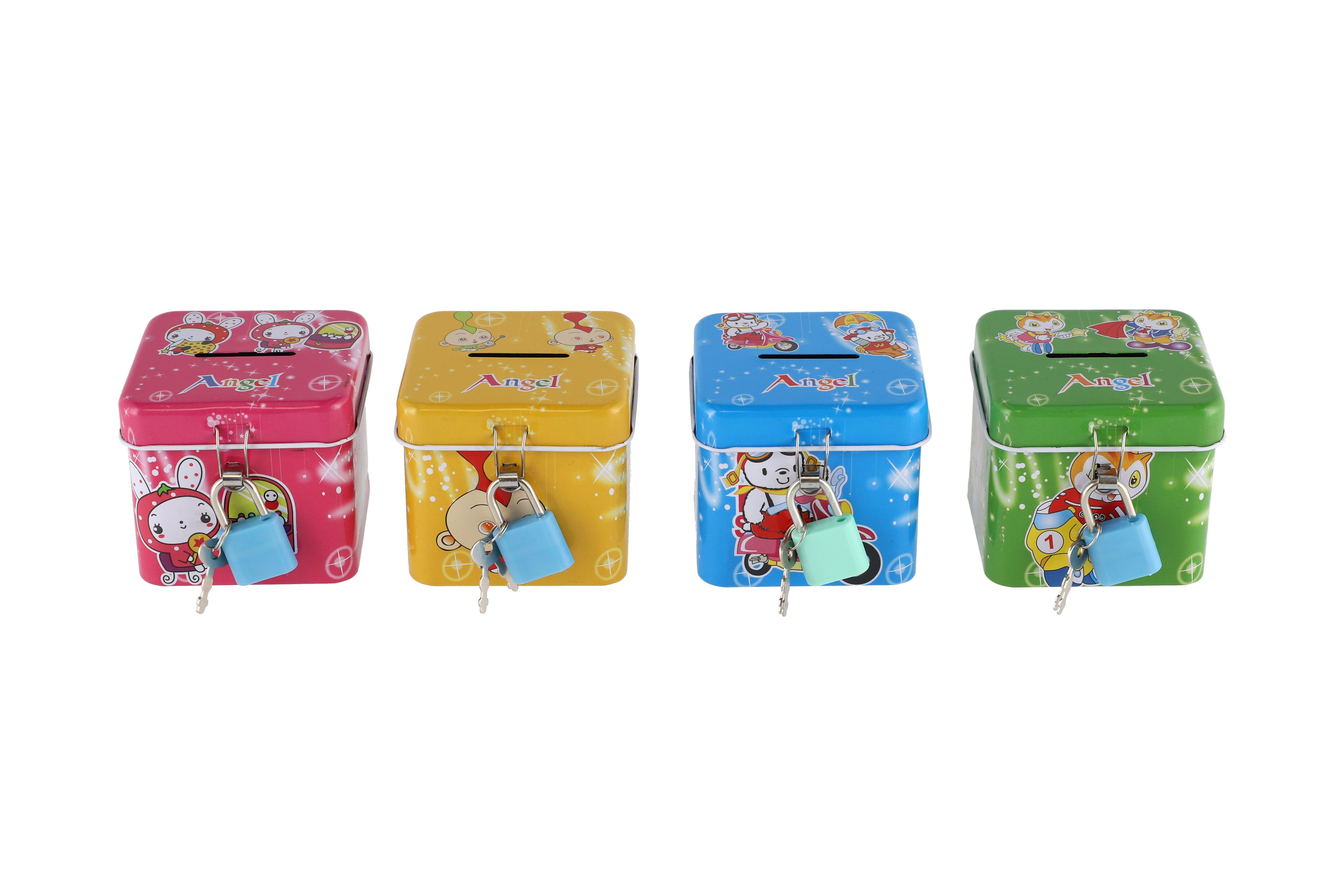 Beschreibung Teddies Spardose mit Schloss, Blechwürfel 7x6cm, 4 Farben