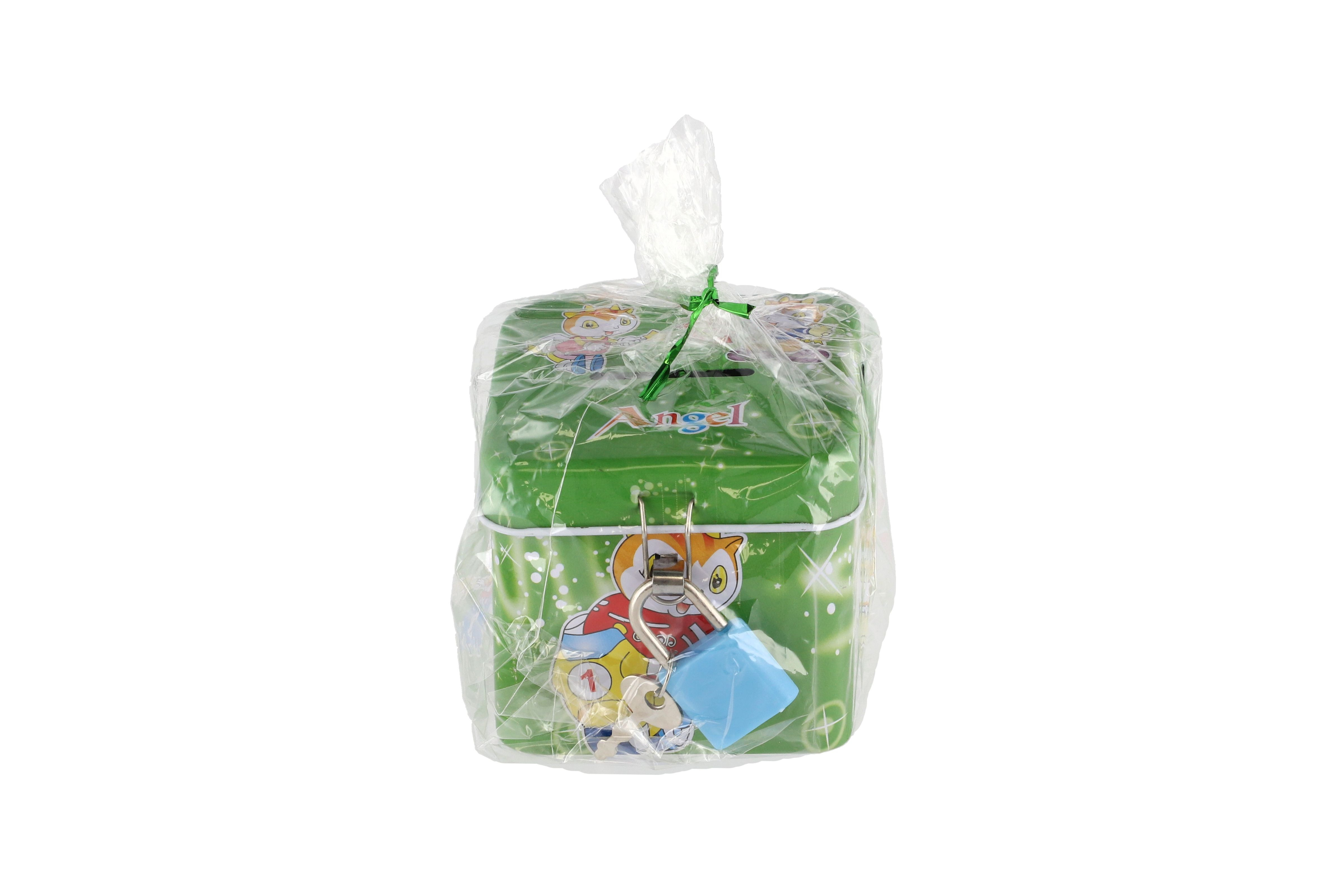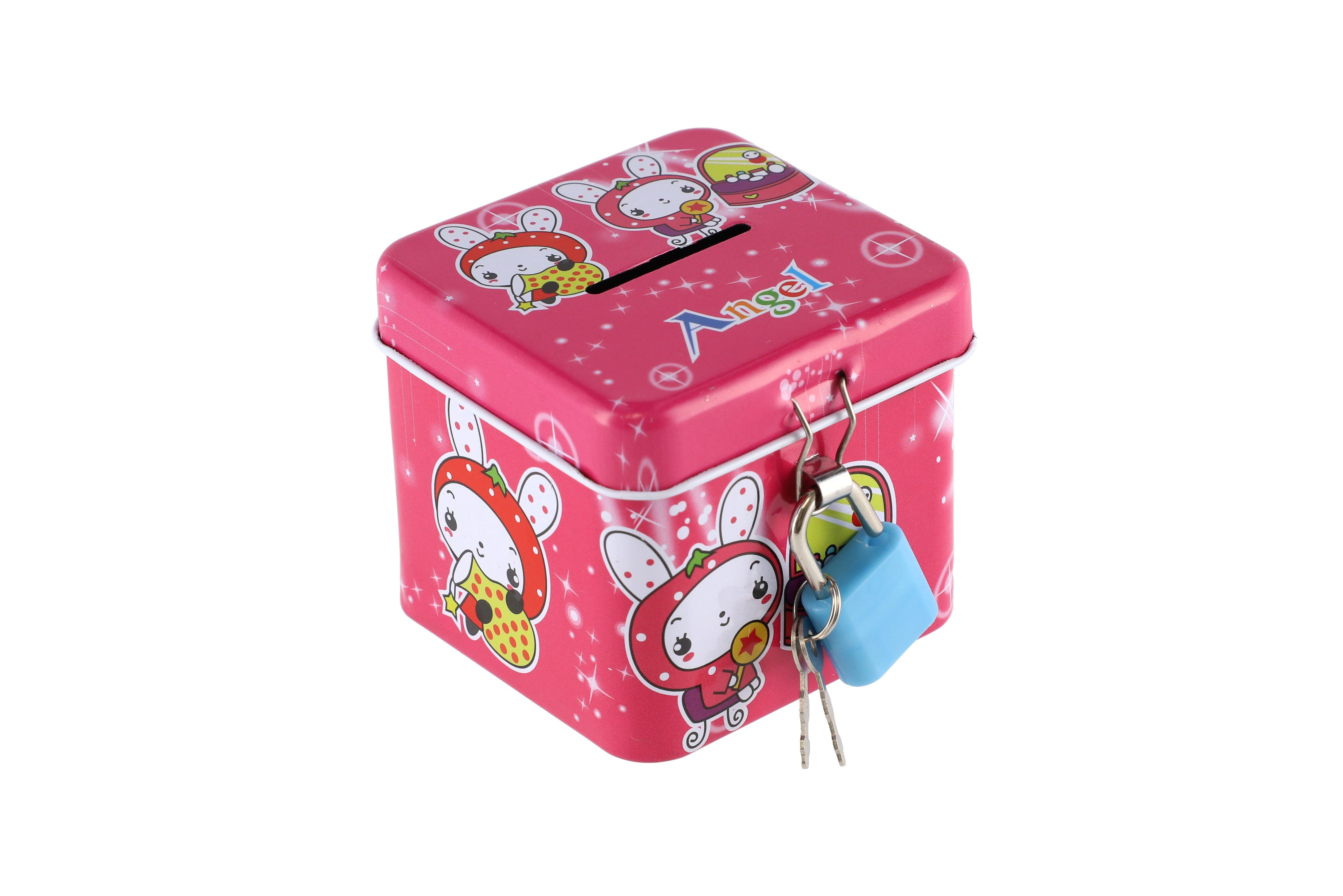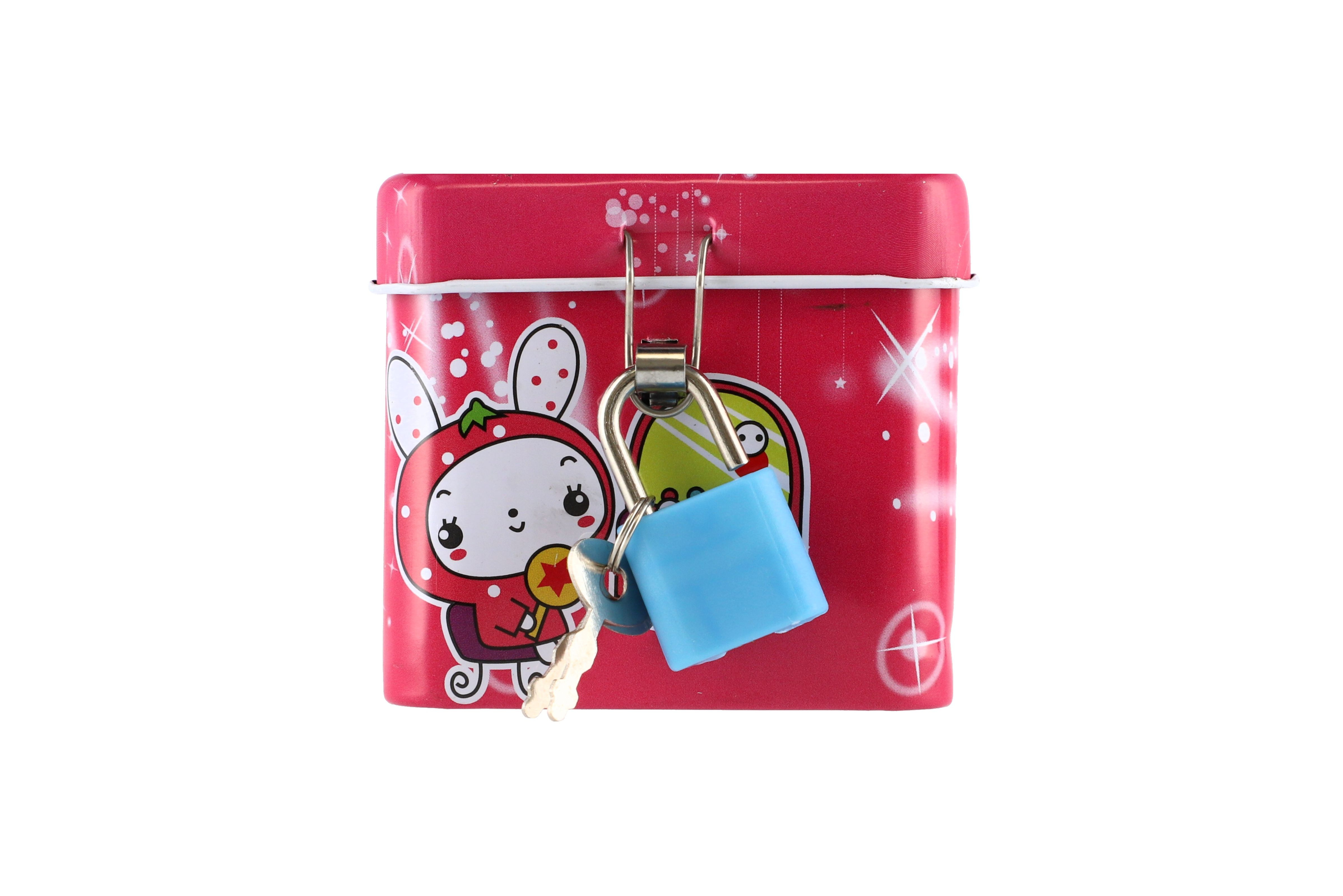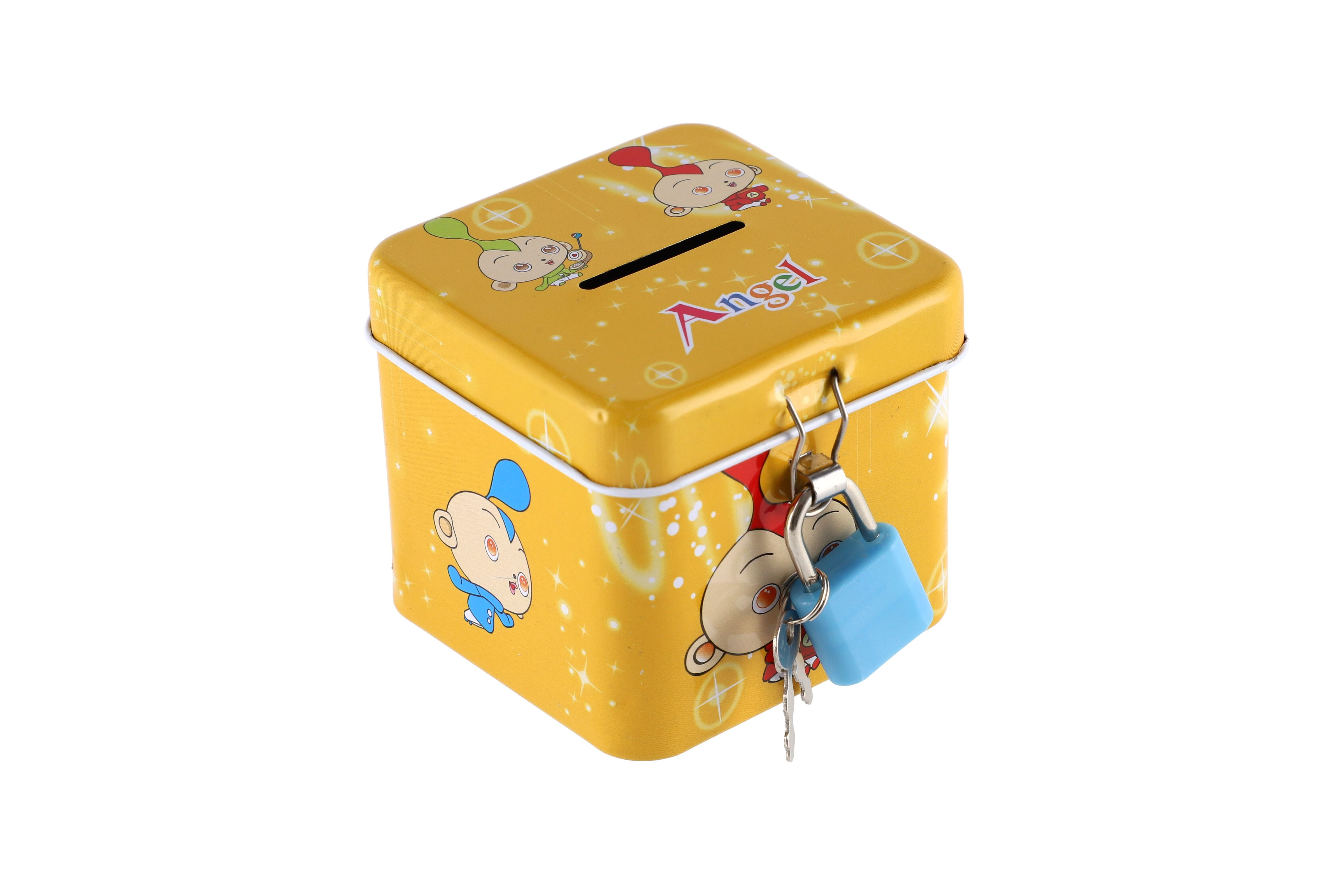 Beschreibung Teddies Spardose mit Schloss, Blechwürfel 7x6cm, 4 Farben