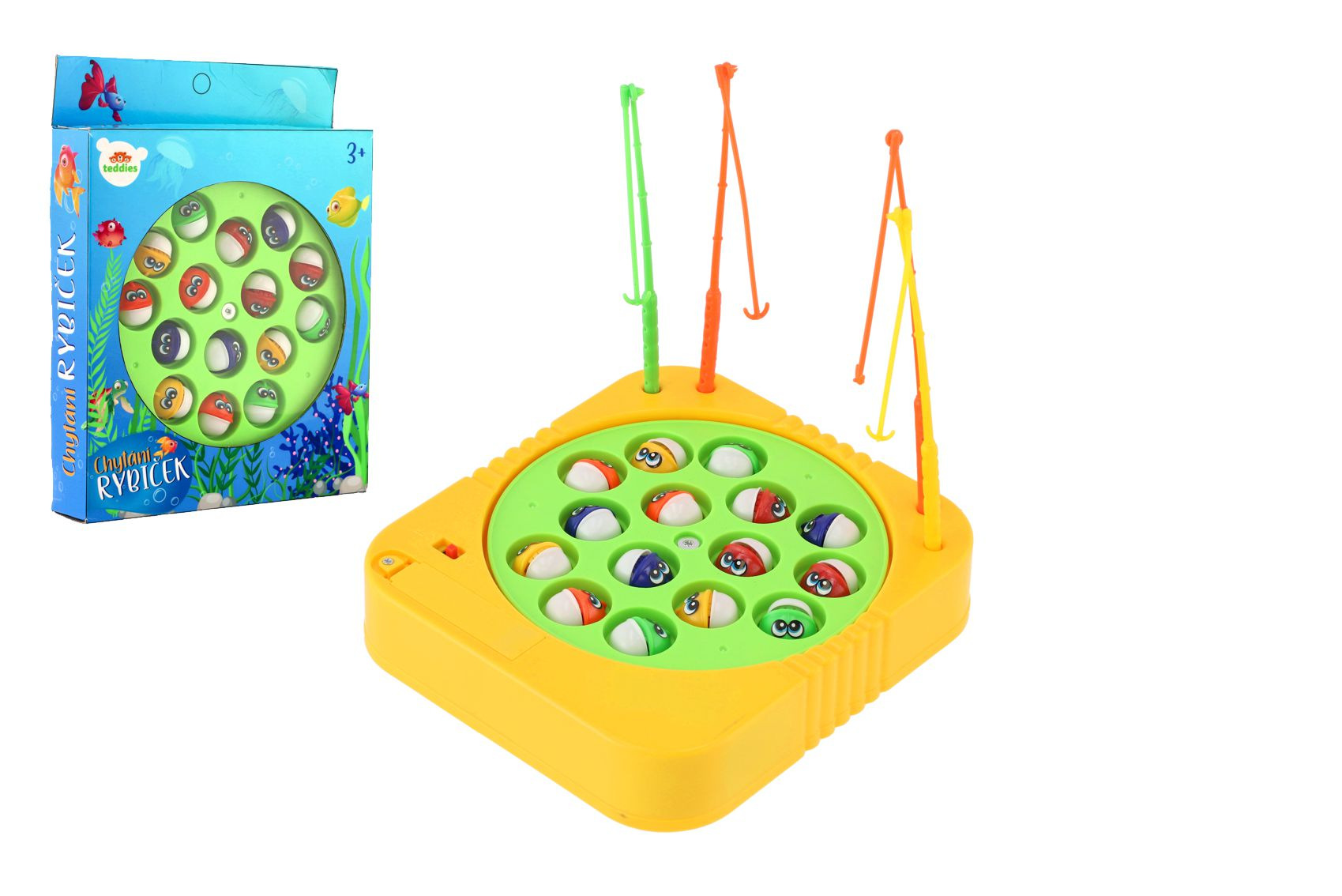 Nechte se unášet vzrušujícím dobrodružstvím rybolovu. Skvělá hra zavede vaše dítě přímo do hlubokých vod jezer, moří a oceánů. Chytáním rybiček si užijí spoustu zábavy děti i dospělí. Roztočte rybník a ulovte co nejvíce plavajících rybiček. Rybky otevírají a zavírají ústa, takže musíte najít správný okamžik, kdy ji chytit na háček. Vyhrává hráč s největším počtem ulovených ryb. Kdo z Vás to bude? Hra je na baterie: 1x AA, která není součástí. Velikost hry: 16 x 17 cm Průměr herního pole: 14 cm Rozměr krabice: 16 x 22 x 3,5 cm Vhodné pro děti od 3 let