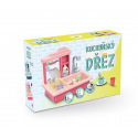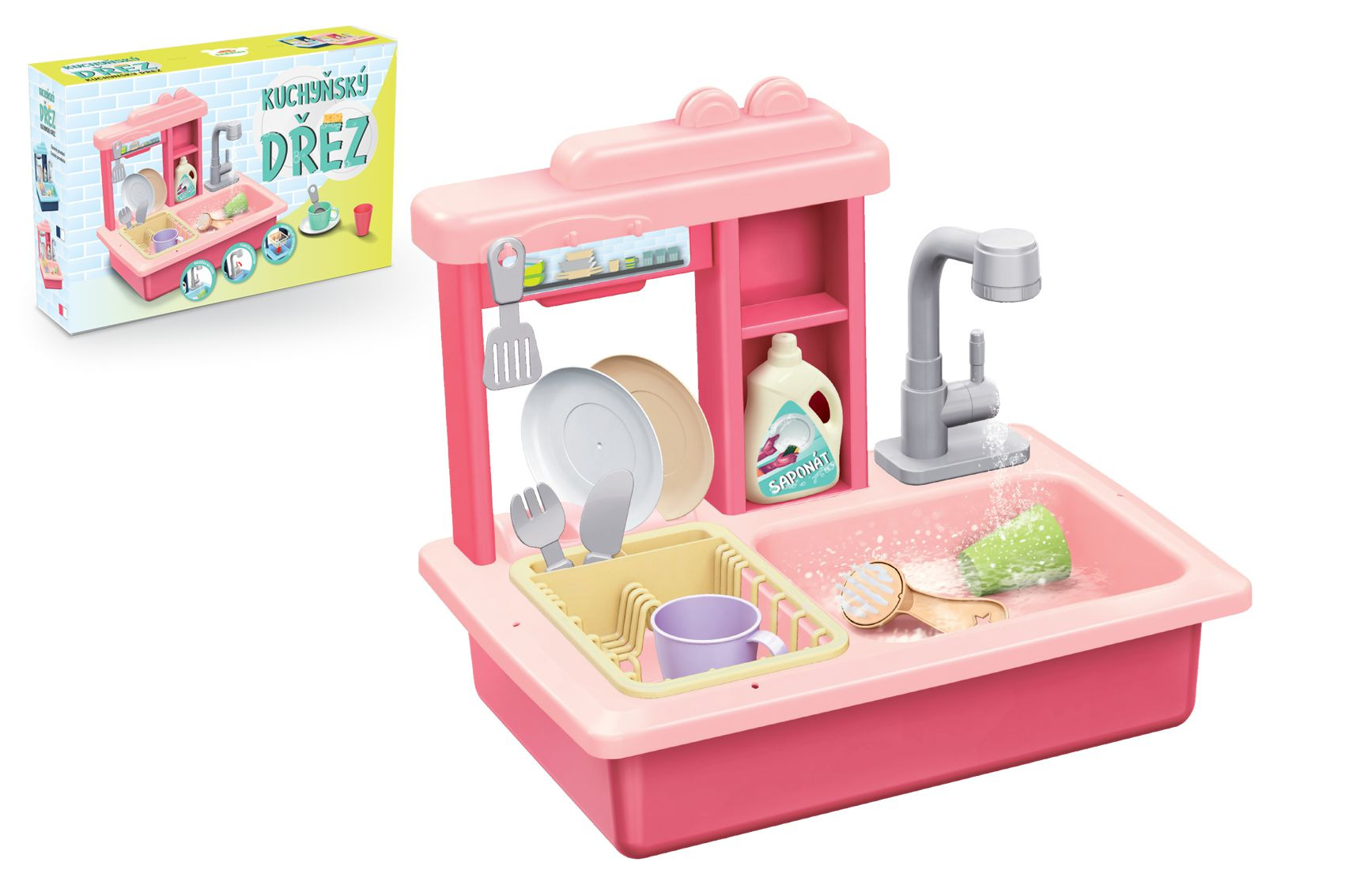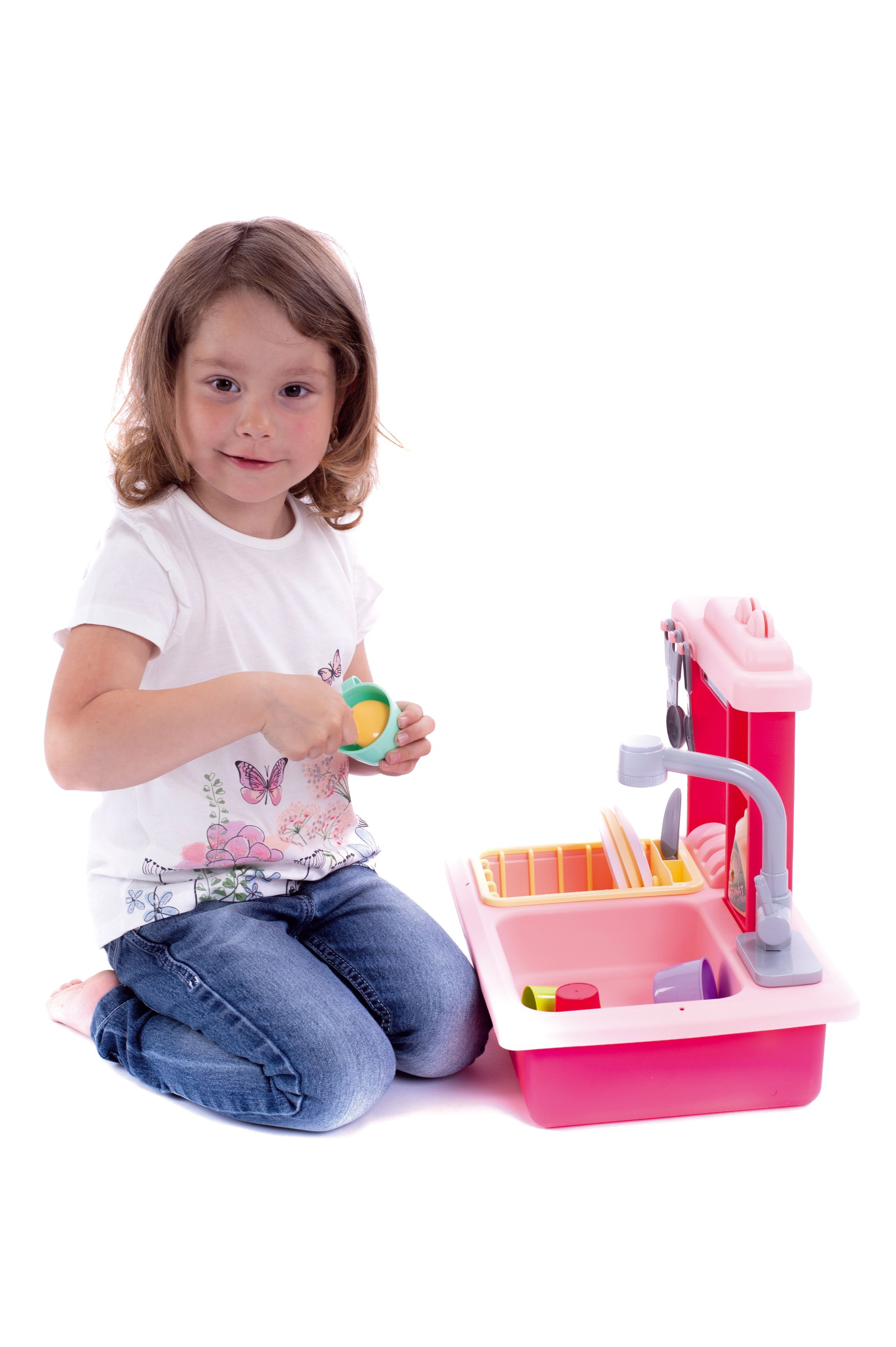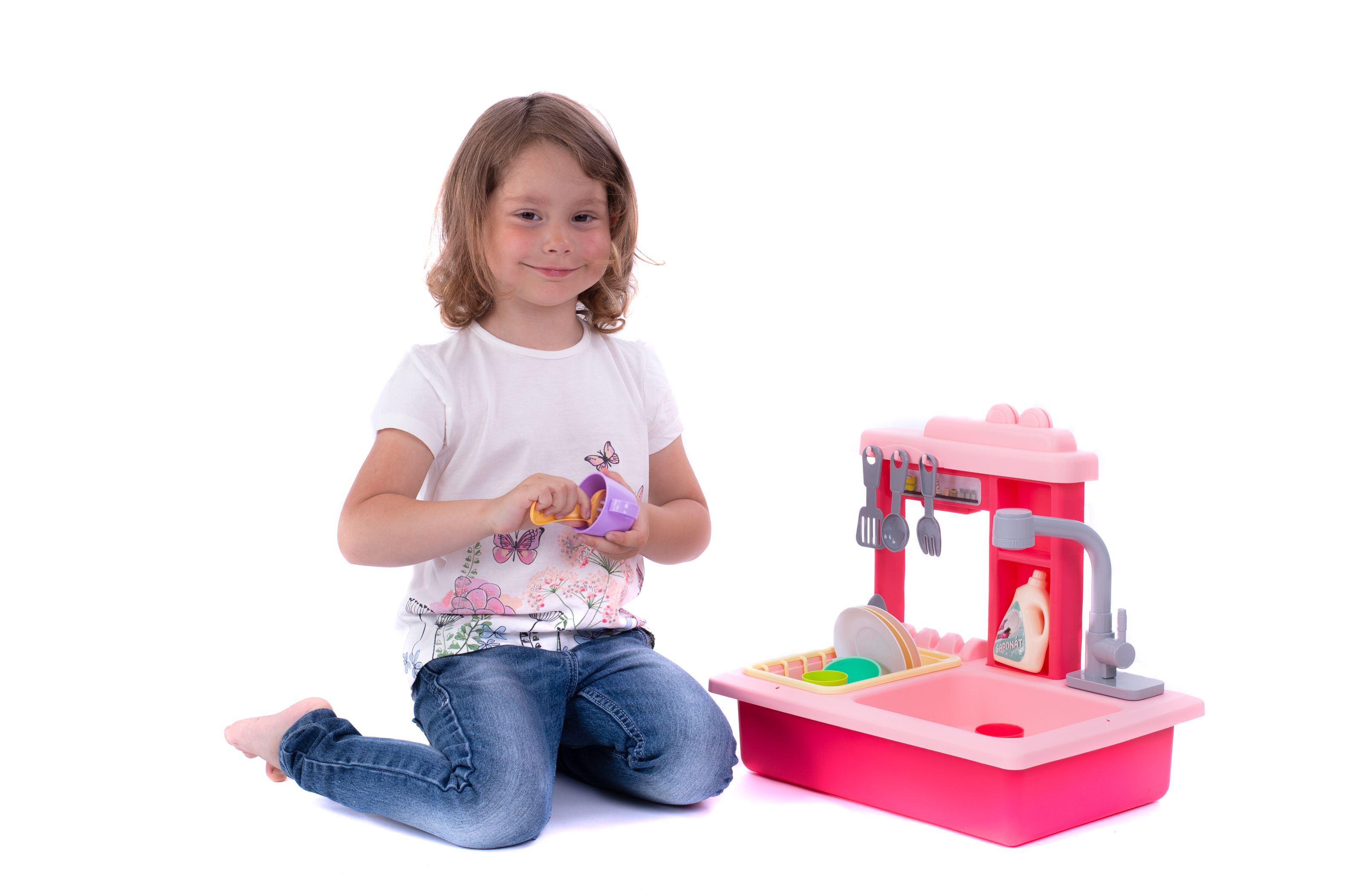 Teddies Spülbecken zum Geschirrspülen rosa + Wasserhahn mit Batterie Kunststoff mit Zubehör in der Box 46x28x12cm
