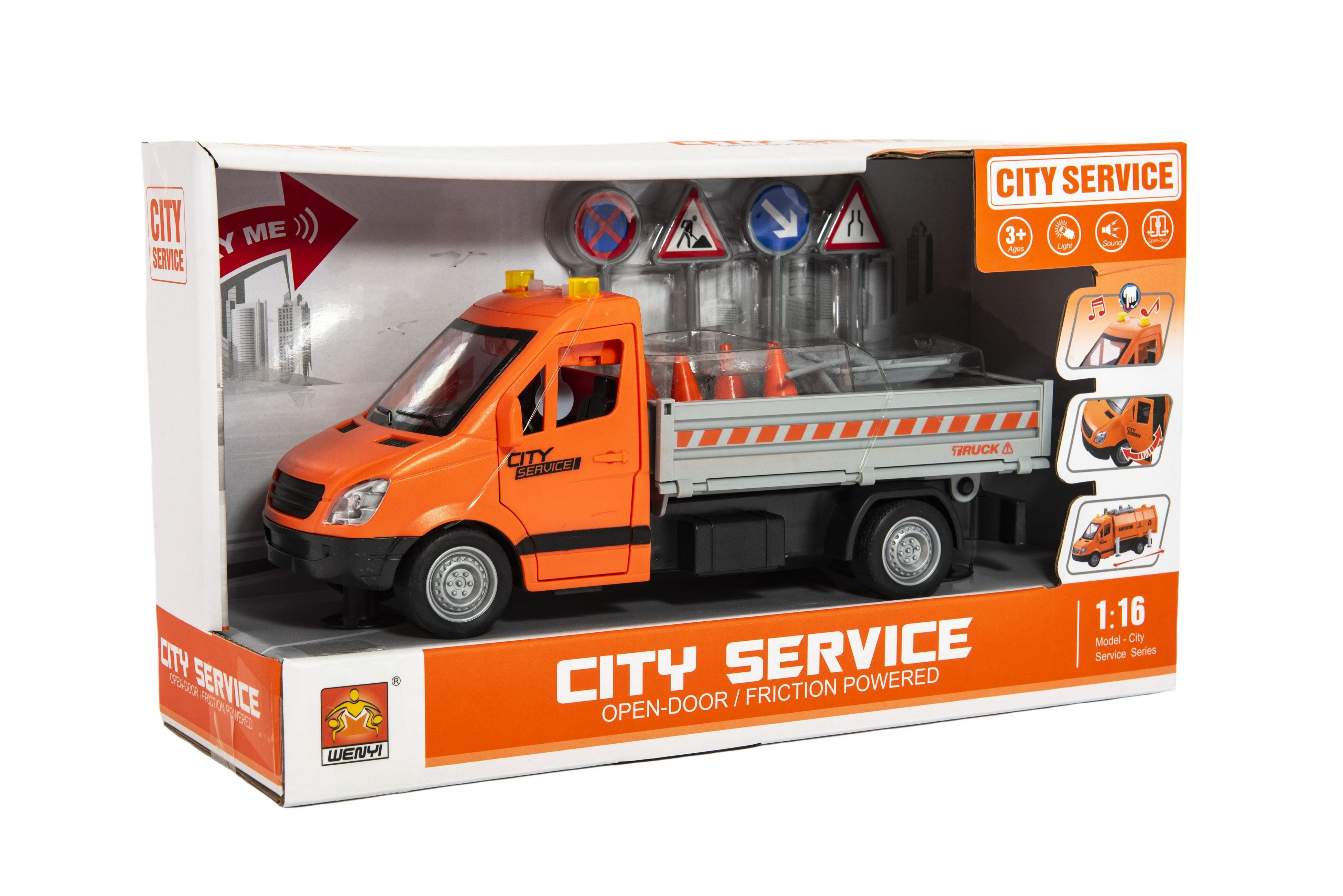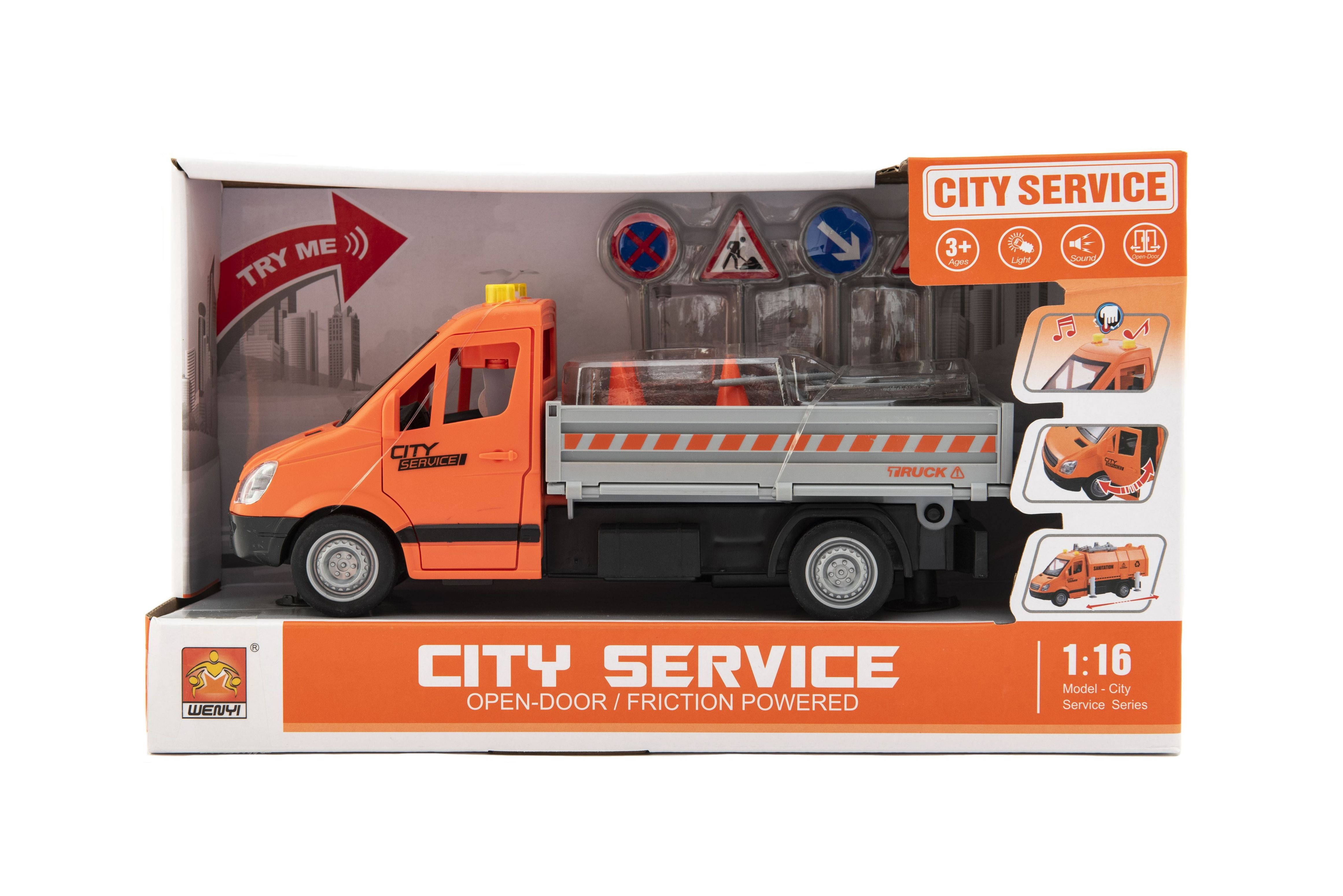 Teddies Straßenwartungsauto aus Kunststoff 25cm mit Schwungrad, batteriebetrieben mit Sound und Licht in Schachtel 32x19x12cm
