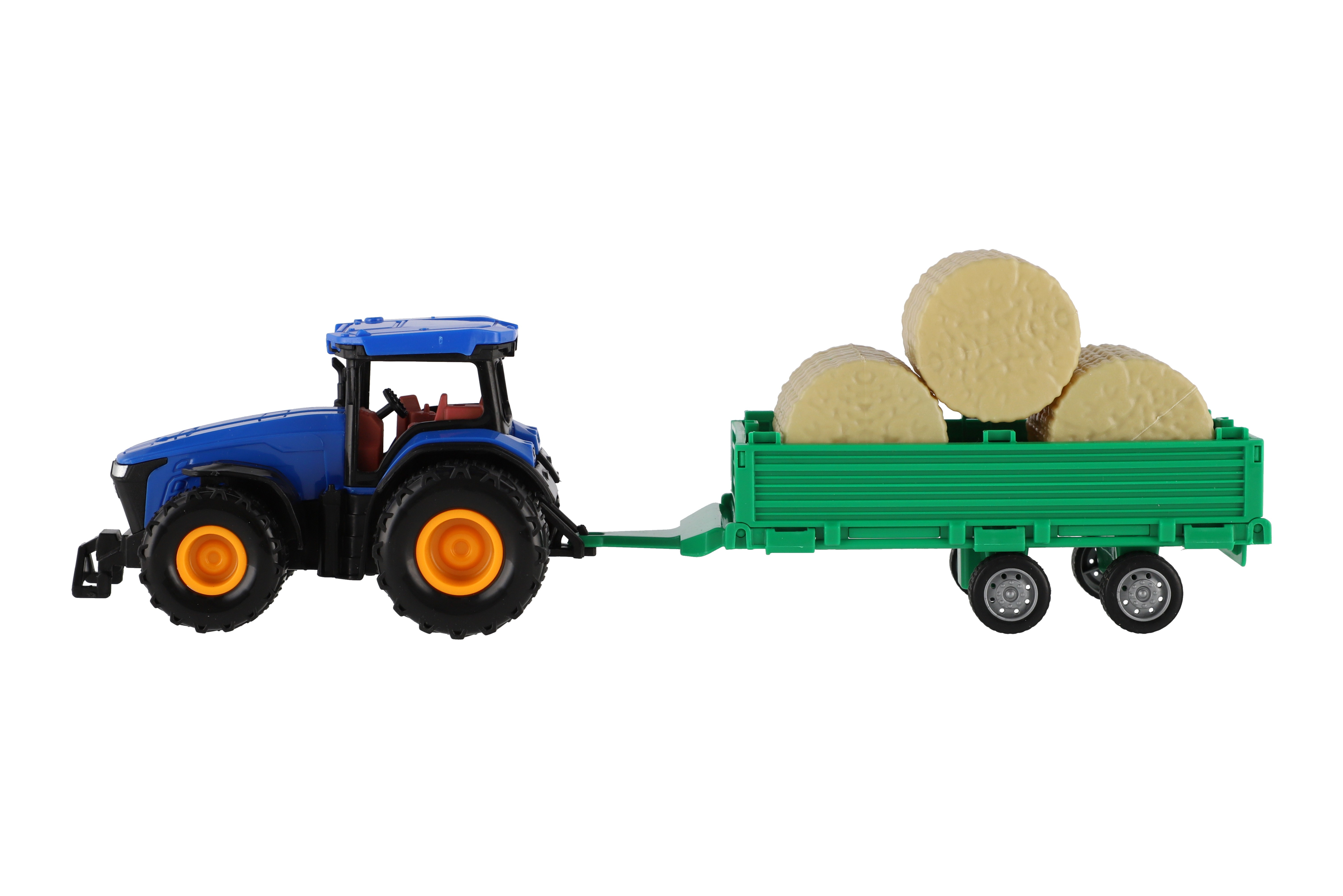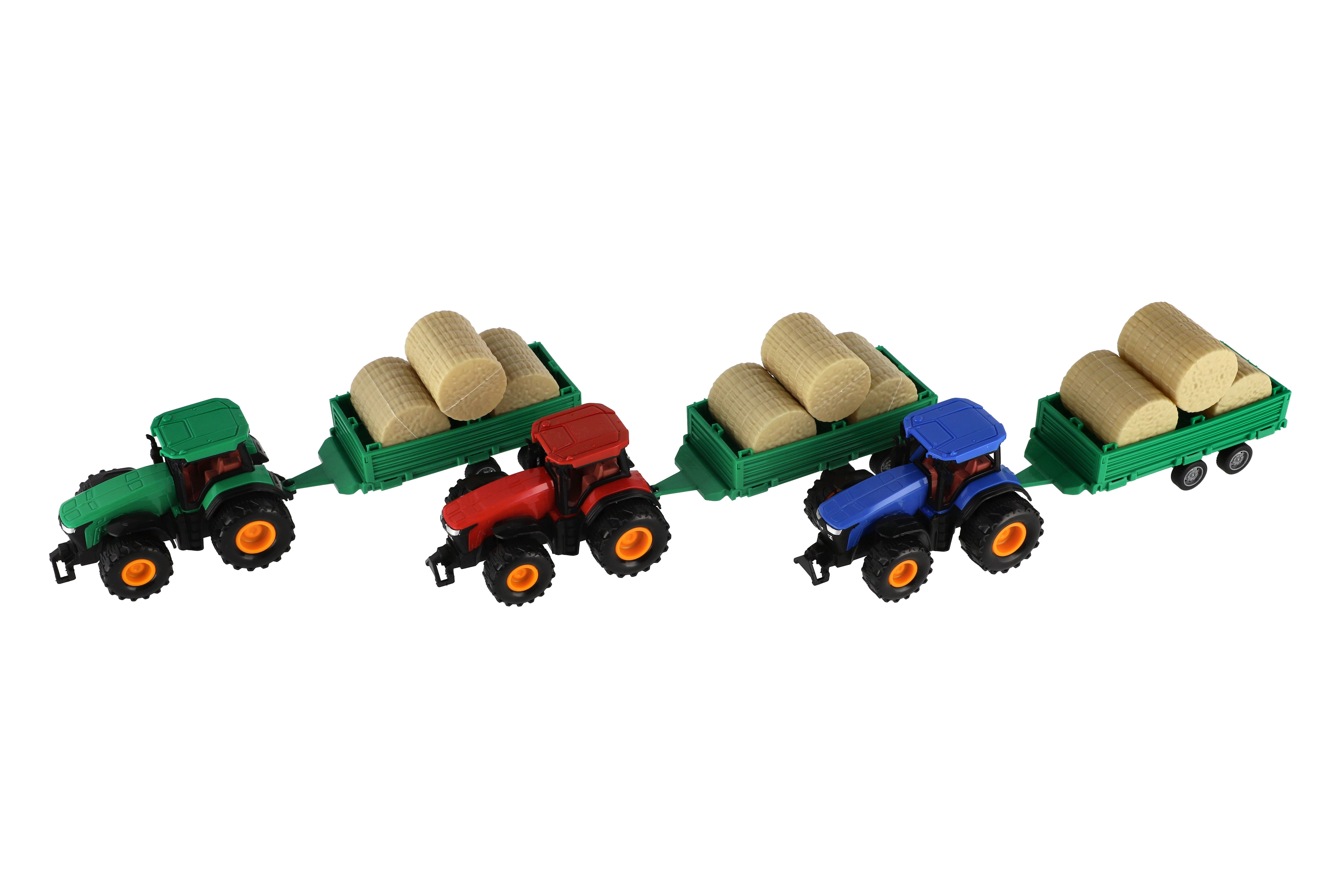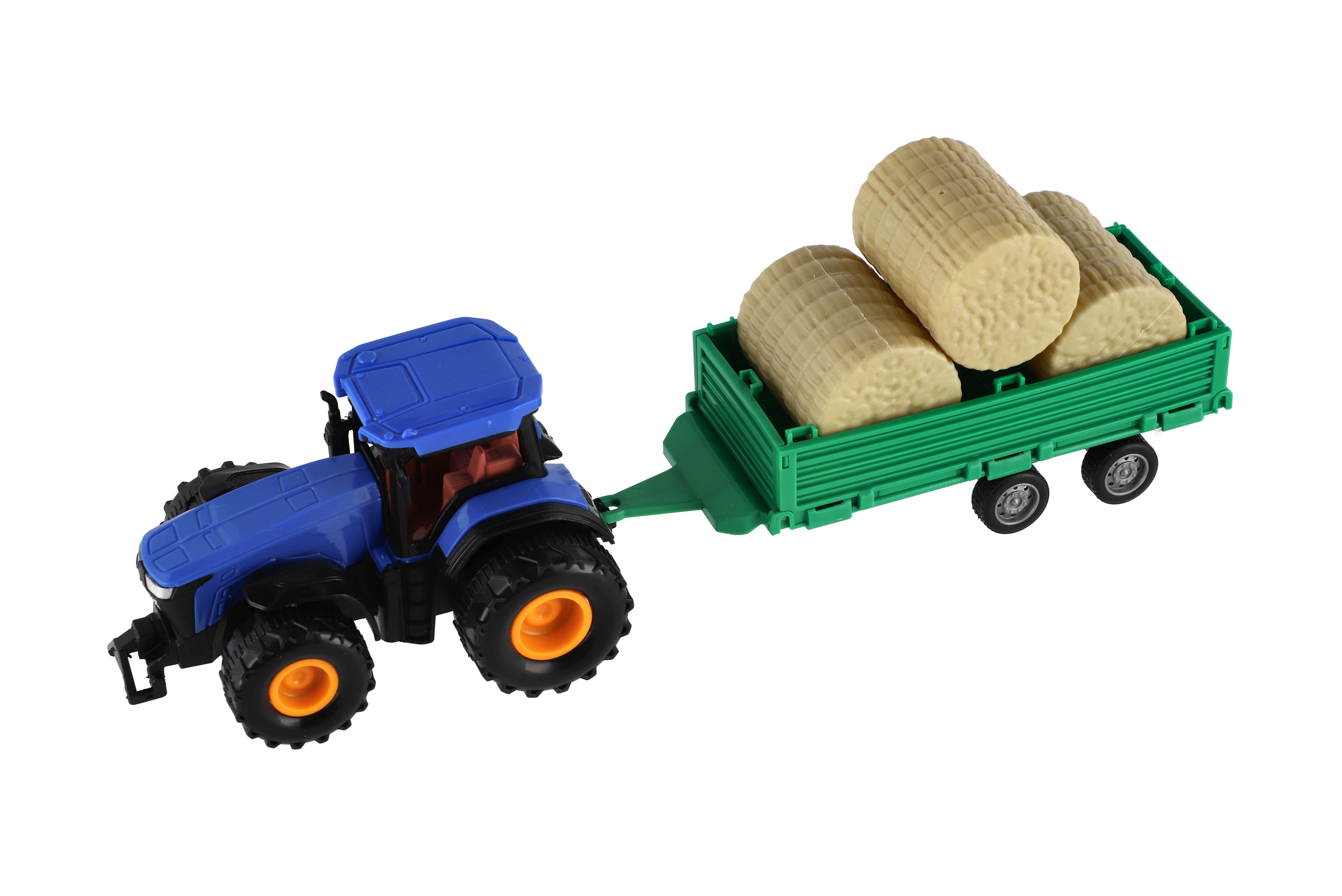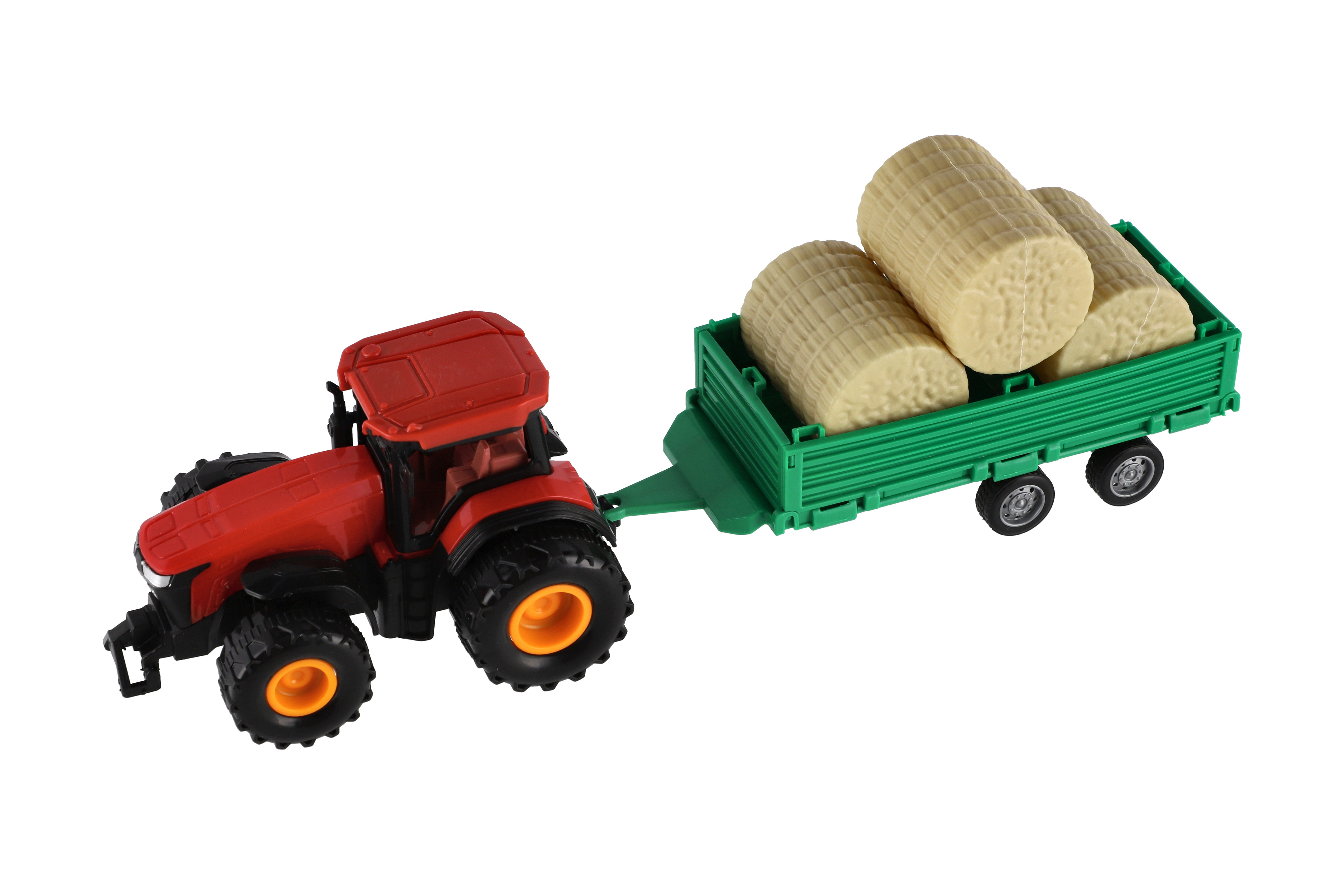 Beschreibung Teddies Traktor mit Anhänger mit Ballen aus Kunststoff 30cm mit Schwungrad 3 Farben in Schachtel 33x12x9cm