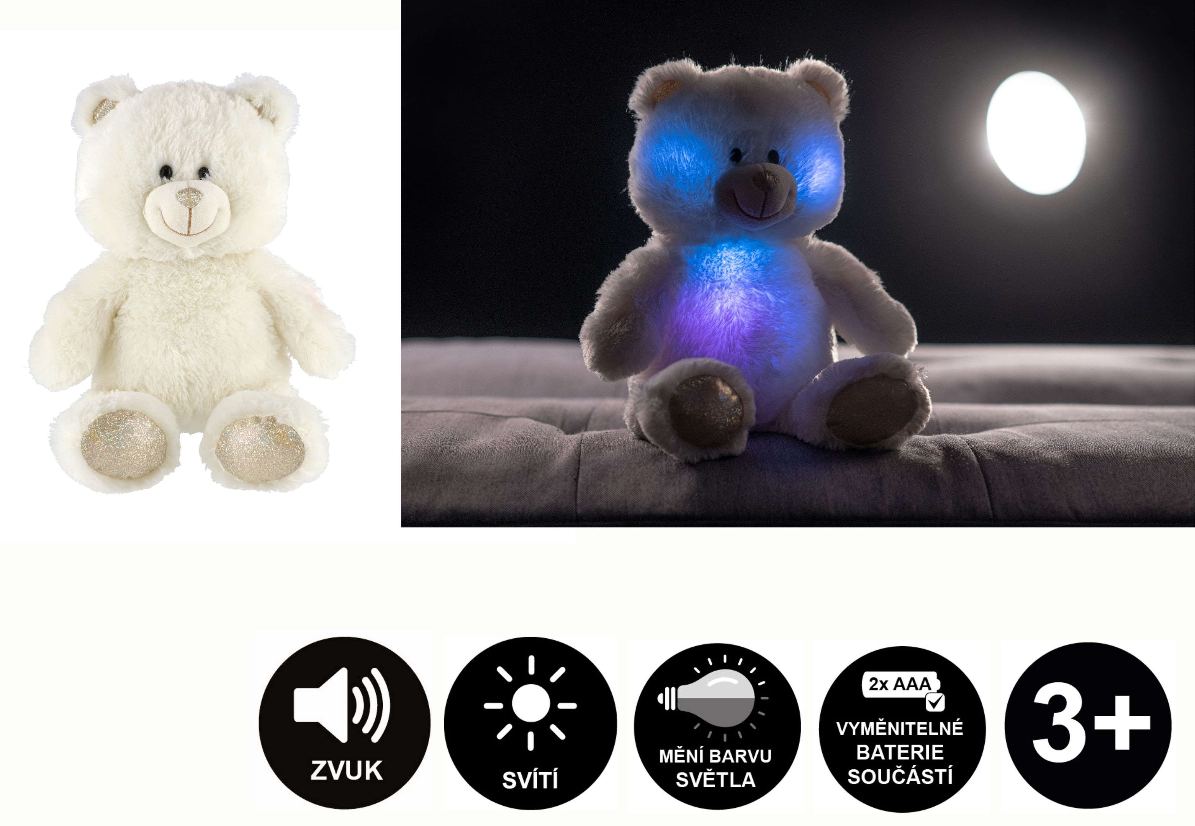 Roztomilý plyšový medvídek je vyroben z kvalitní jemné plyše. Tento plyšový kousek je ideálním dárkem! Medvídek Snílek pomáhá dětem snadněji usnout. Po zmáčknutí tlapky hraje klidnou relaxační hudbu. Ve tmě svítí a mění barvy. Velikost medvěda: 40 cm Vhodné pro děti od 3 let