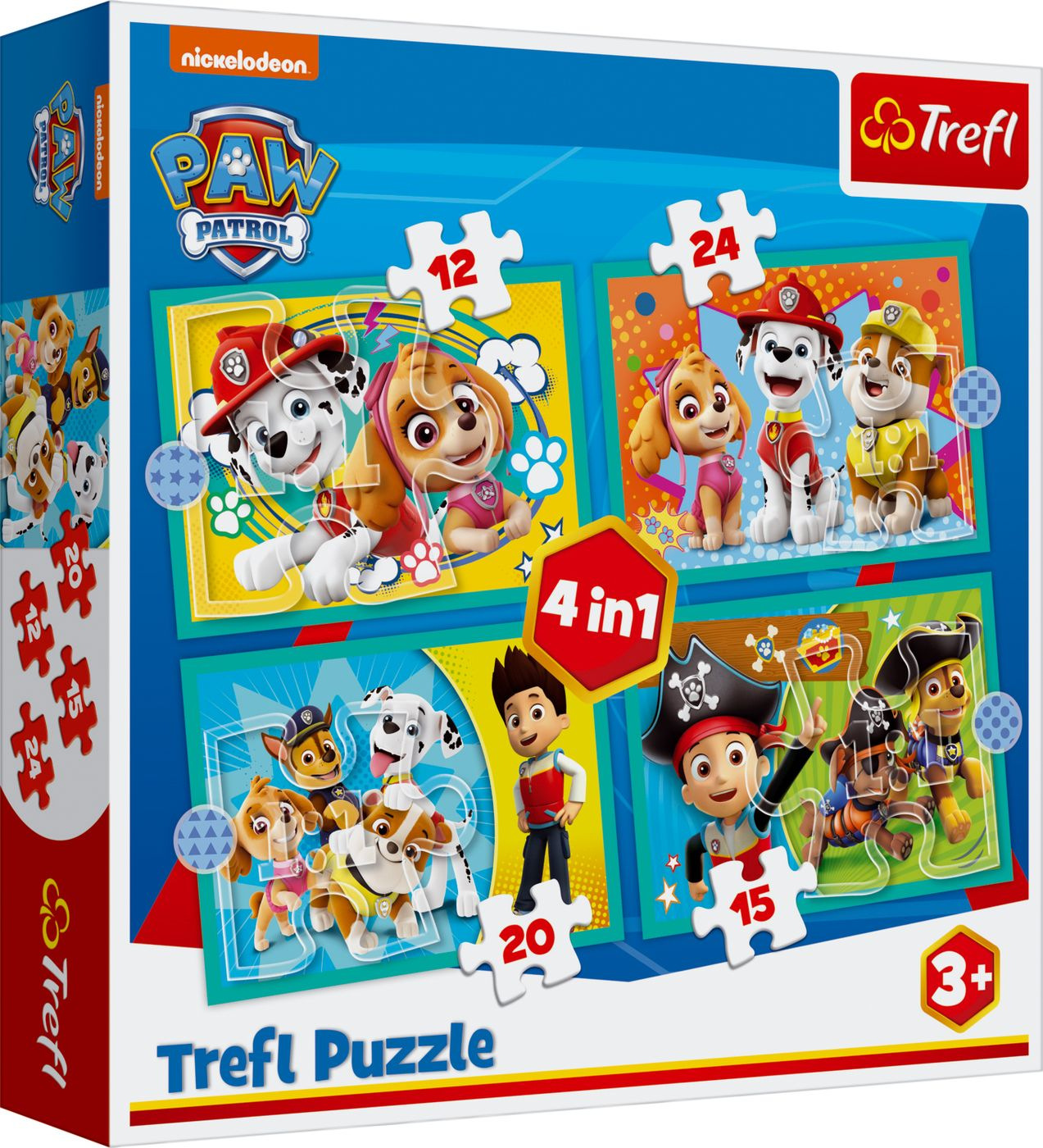 Puzzle mit einem Motiv aus der beliebten Serie Paw Patrol. Vier separate Puzzles mit unterschiedlicher Anzahl an Teilen – 12, 15, 20 und 24 – führen schrittweise zu einer Verbesserung der Zusammenbaufähigkeiten des Kindes und zu einem zunehmenden Schwierigkeitsgrad. Verpackungsmaße 28 x 28 x 6 cm. Geeignet für Kinder ab 3 Jahren.