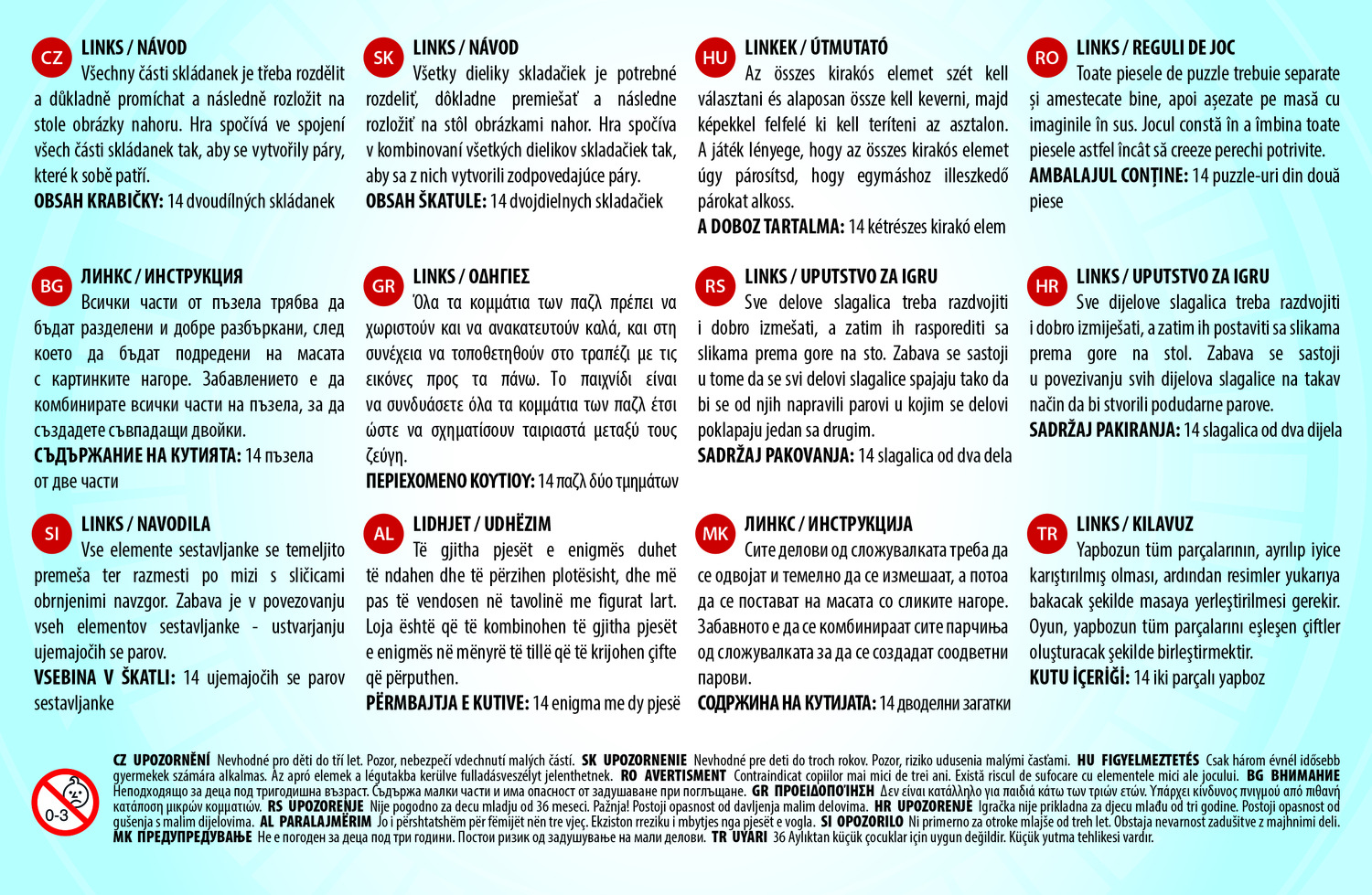 Všechny části skládanek je třeba rozdělit a důkladně promíchat a následně rozložit na stole obrázky nahoru. Hra spočívá ve spojení všech částí skládanek tak, aby se vytvořily páry, které k sobě patří. Balení obsahuje: 14 dvoudílných skládanek s motivem Tlapkové patroly Rozměr krabičky: 21 x 14 x 4 cm Vhodné od 3 let