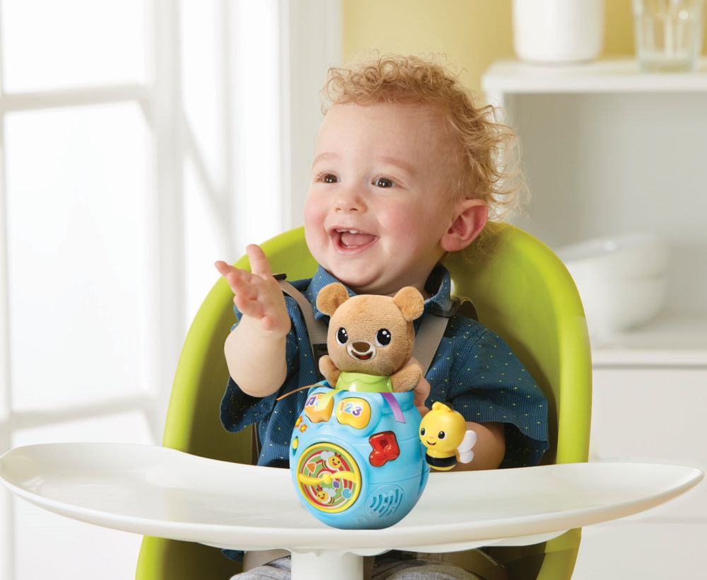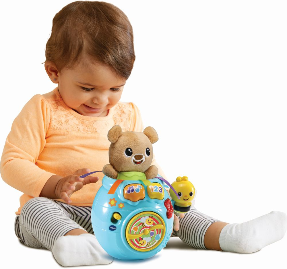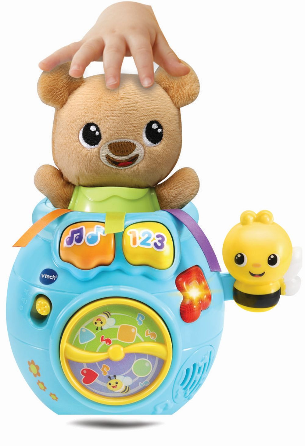 Vtech Bärchen, versteck dich! ist ein legendäres Musik- und Lernspielzeug für Kinder ab 6 Monaten. Mit niedlichen Phrasen kommuniziert es interaktiv mit dem Kind. Durch leichtes Drücken des Teddybären in den Topf versteckt sich der Teddybär. Durch anschließendes Drücken des Knopfes „springt“ der Teddybär dann aus dem Topf heraus. Alles wird von lustigen Phrasen, Liedern und Melodien begleitet. Eine bewegliche Biene an der Seite des Honigtopfs kann auch den Propeller an der Vorderseite des Topfs drehen.\nDas Spielzeug lehrt Kinder auch auf gewaltfreie Weise Lieder, Zahlen zu erkennen und erweitert den Wortschatz.\nDas Drücken des Teddybären, das Verschieben und auch das Drehen der Propeller hilft, die Feinmotorik zu entwickeln.\nSpielt 15 Melodien und singt 3 Lieder