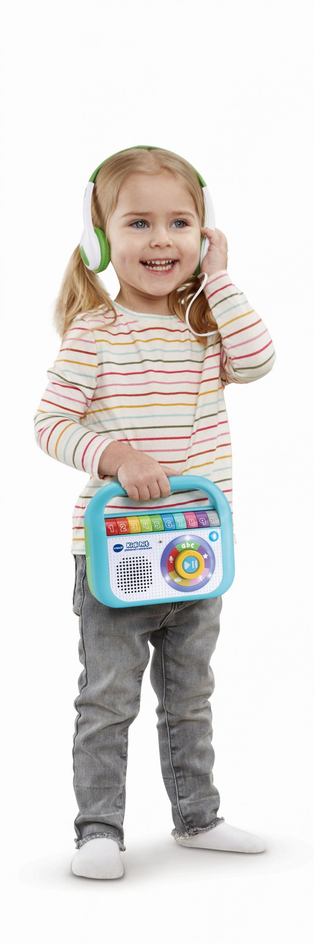Kidi hit je první hudební přehrávač s nahráváním od VTech speciálně vyvinutý pro děti, který naučí také poznávat čísla, písmena i barvy. Obsahuje 40 skladeb a českých písní. Navíc lze nahrát si vlastní zpěv anebo připojit externí přehrávač (není součástí) přes Bluetooth®! Barevná tlačítka, osvětlený volič a rukojeť přesně padnoucí do dětských ručiček udělá z přehrávače Kidi hit naprosto dokonalou hudební zábavu. Navíc lze připojit i sluchátka (nejsou součástí)