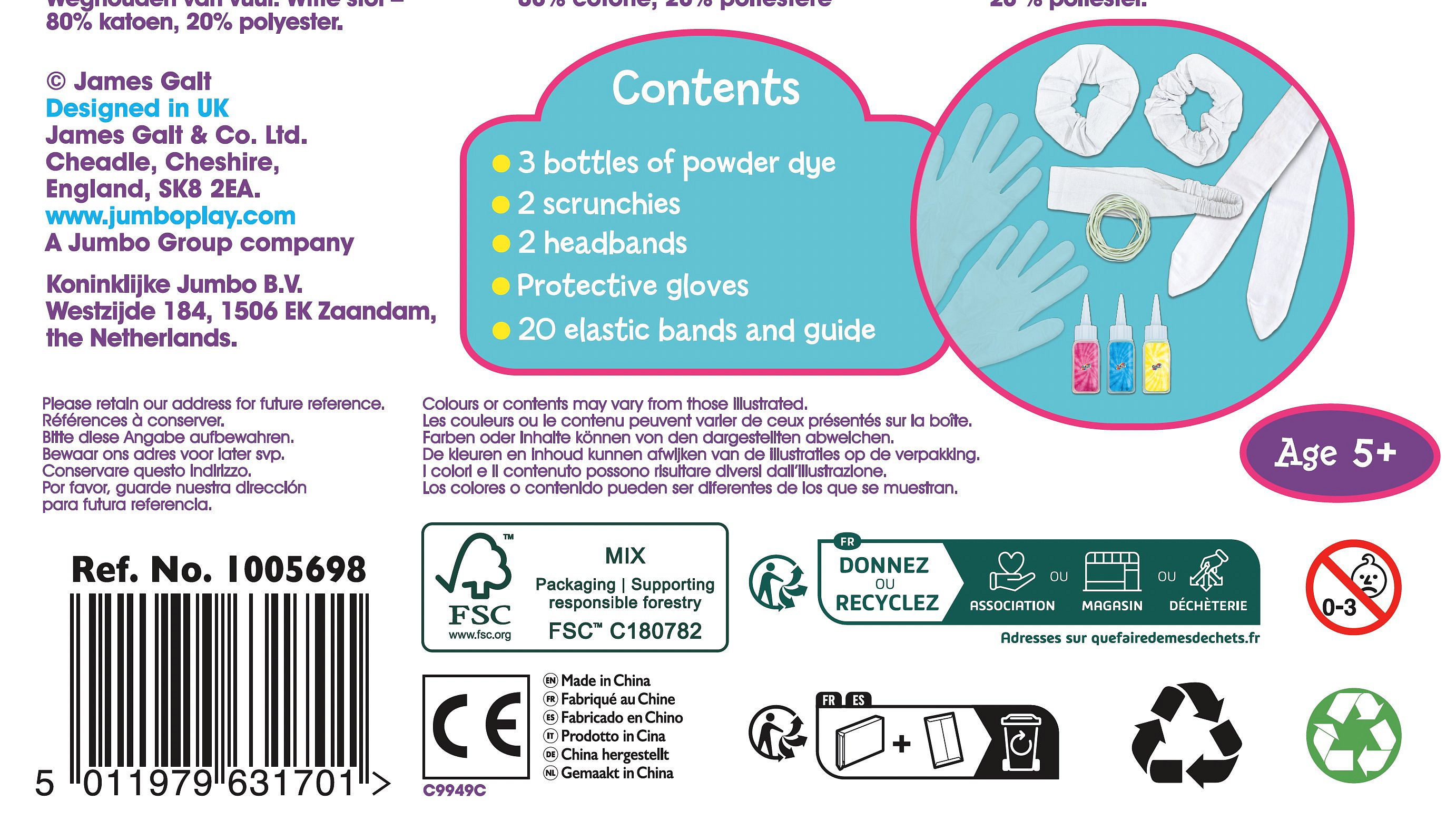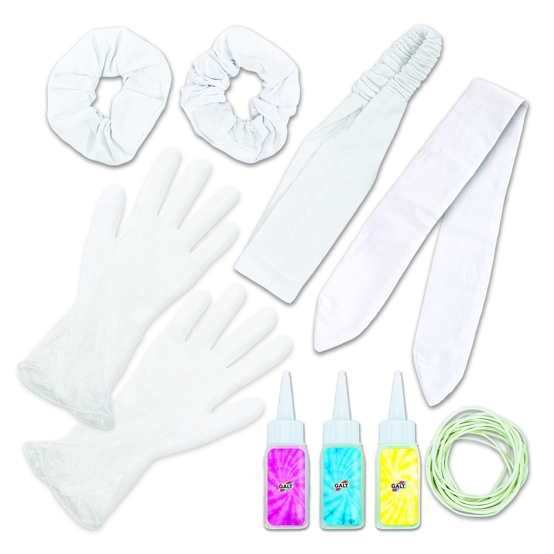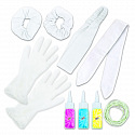 Obsah balení: 3 lahvičky s práškovou barvou, 2 gumičky (scrunchies), 1 látková čelenka, 1 elastická čelenka, ochranné rukavice, 20 gumiček na tvorbu vzorů, návod