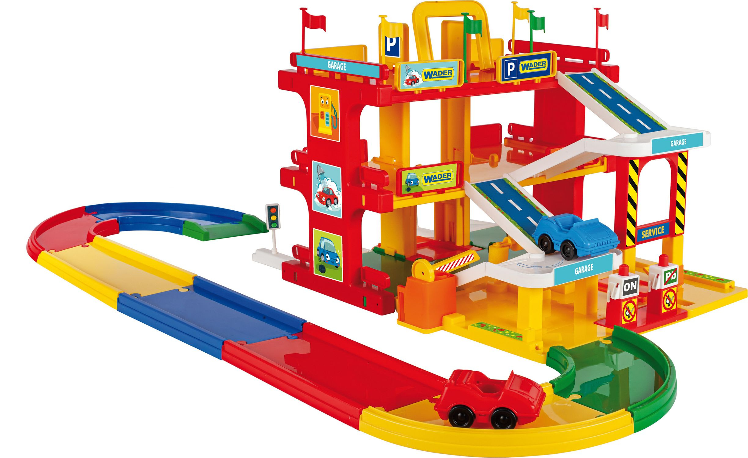 Beschreibung WADER Garage Service 3 Etagen + Strecke 1,5m + 2 Autos Kunststoff in Schachtel 59x40x15cm Wader
