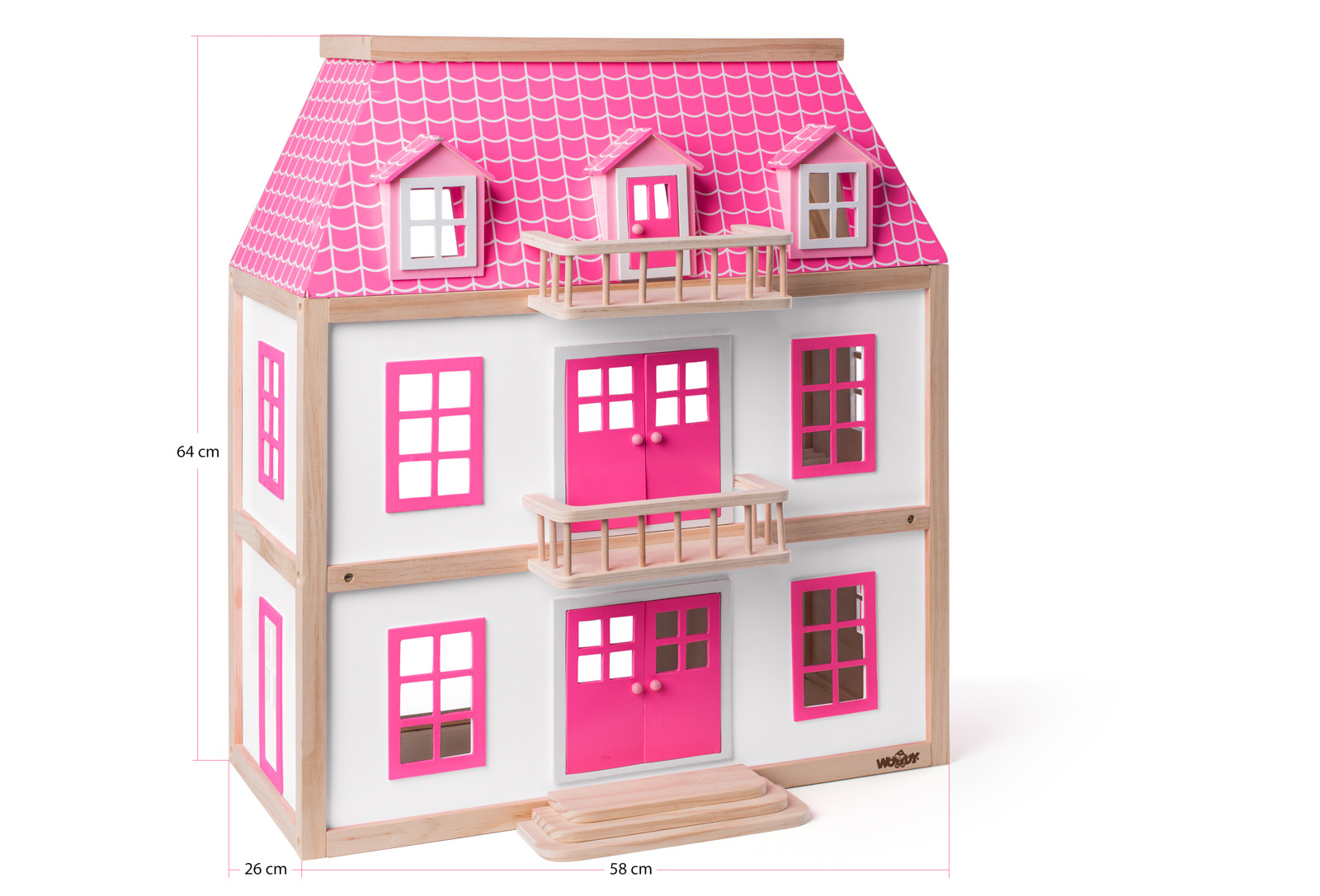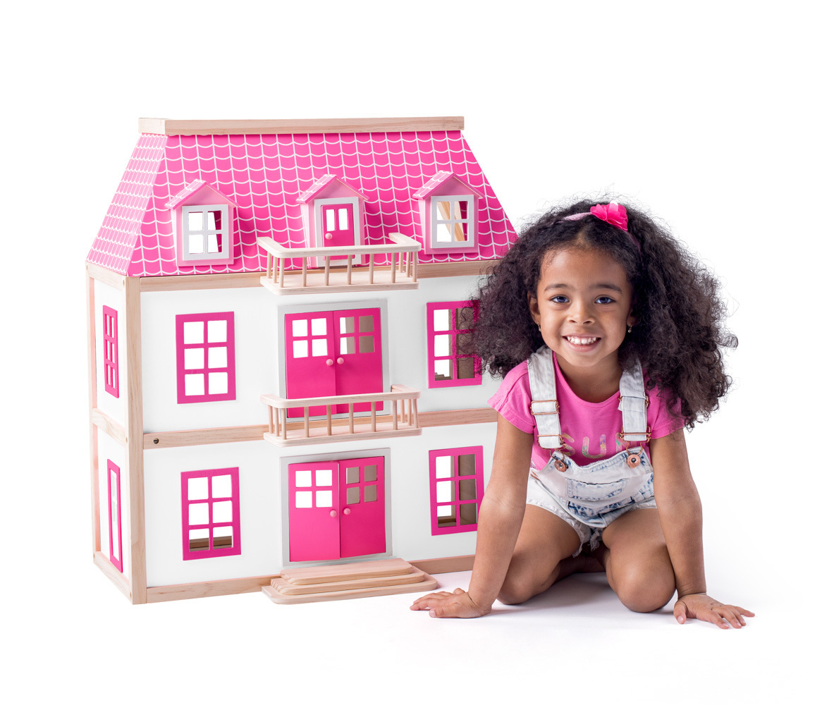 Nový design domečku vznikl ve spolupráci s českou výtvarnicí a na první pohled zaujme svojí barevností. Tento kvalitní třípatrový domeček je určen pro panenky typu Barbie (30 cm) a dodáváme ho včetně zobrazeného příslušenství (7ks). Nábytek je vyroben z kombinace materiálů dřevo/ plast/ textil. Z přízemí do prvního patra se mohou panenky svézt výtahem. Panenky nejsou součástí výrobku. Příslušenství domečku: křeslo se stolkem, stůl a dvě židle, postel, vana. | Rozměry: 74,5 x 30 x 116cm | Věková kategorie: 3+| Toto autorské dílo je registrováno u Art&Copyright pod číslem 204-04-21-01 ze dne 21.1.2021.