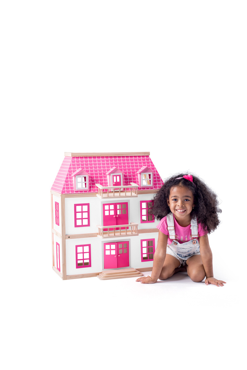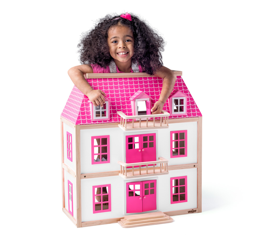 Designový domeček s plastovými balkony a rozlehlou terasou v horním patře nechá vyniknout klasické eleganci městských prvorepublikových vil. Díky otevřeným prostorům je snadno přístupný ve všech místnostech. Je vyroben v kombinaci materiálů: masivní dřevo a překližka. Vybavení domečku je velmi bohaté. Všechny místnosti jsou vybaveny nábytkem z masivního dřeva. Obsahuje celkem 19 ks příslušenství včetně 4 panenek. | Věk. 3+ | Rozměr: 55 x 26 x 51,5 cm