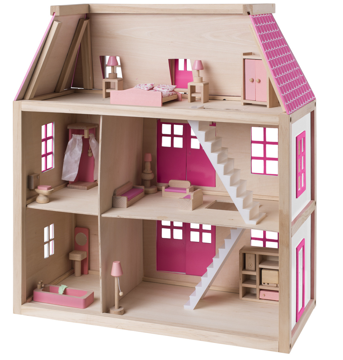 Vila ISABELLE je precizně provedený výrobek s množstvím designových a funkčních prvků. Má magnetický odnímatelná balkon, variabilní schody a funkční dveře na pantech. Díky otevřeným prostorům je snadno přístupný ve všech místnostech. Je vyroben v kombinaci materiálů: masivní dřevo a dřevovláknitá deska, čímž je odlehčena celá jeho konstrukce. Všechny místnosti jsou vybaveny nábytkem z masivního dřeva. Obsahuje celkem 13 ks nábytku a 2 panenky.| Rozměr: 53 x 32,5 x 51 cm| Věk: 3+