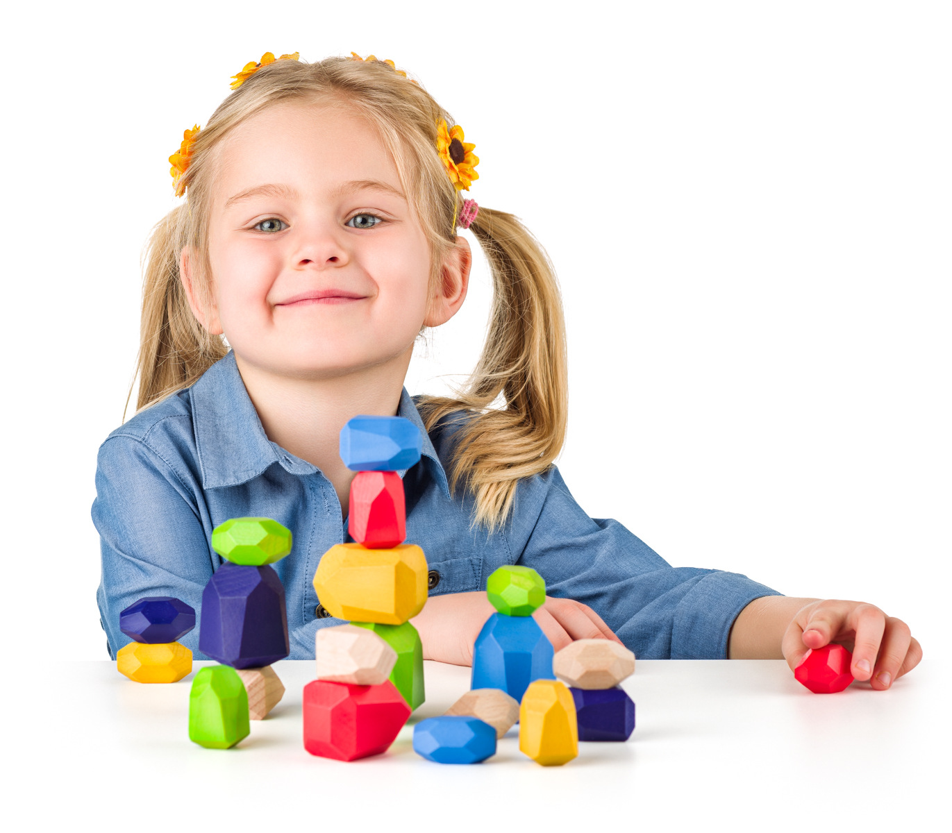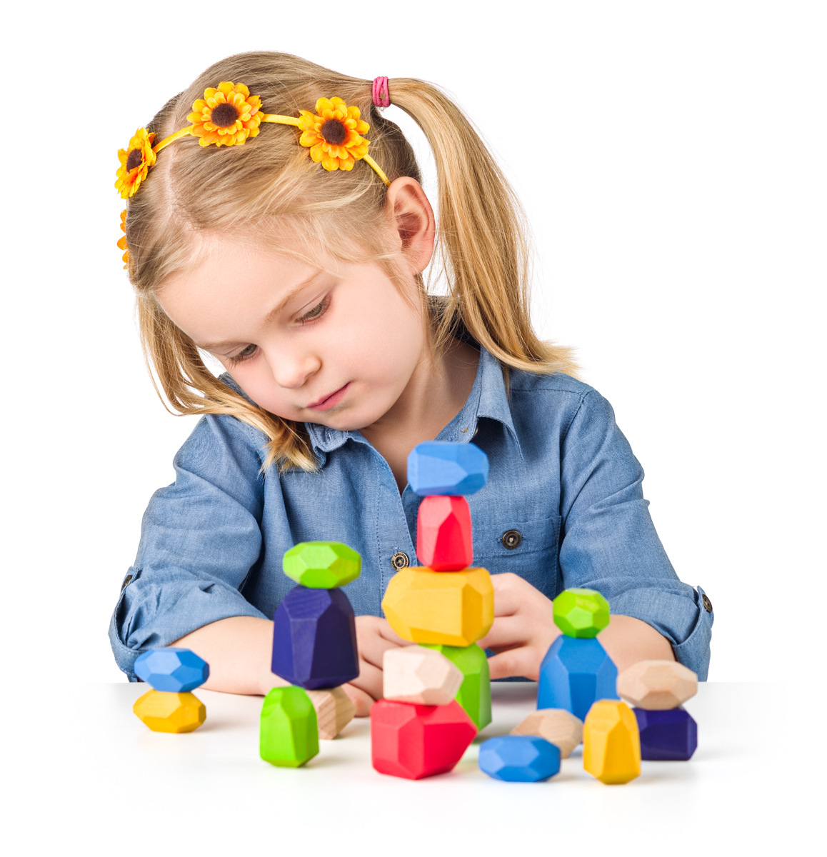 Motorická balanční hračka ze dřeva. Děti mají za úkol postavit na sebe co nejvíce dřevěných kamenů tak, aby věž z nich nespadla. Kameny jsou speciálně zpracované tak, aby plošky, na kterých stojí, byly stabilní pouze v konkrétních polohách pro konkrétní plošky dalších kamenů. Proto je třeba využít nejen motorické, ale i logické schopnosti a kombinatoriku . | Věk: 3+