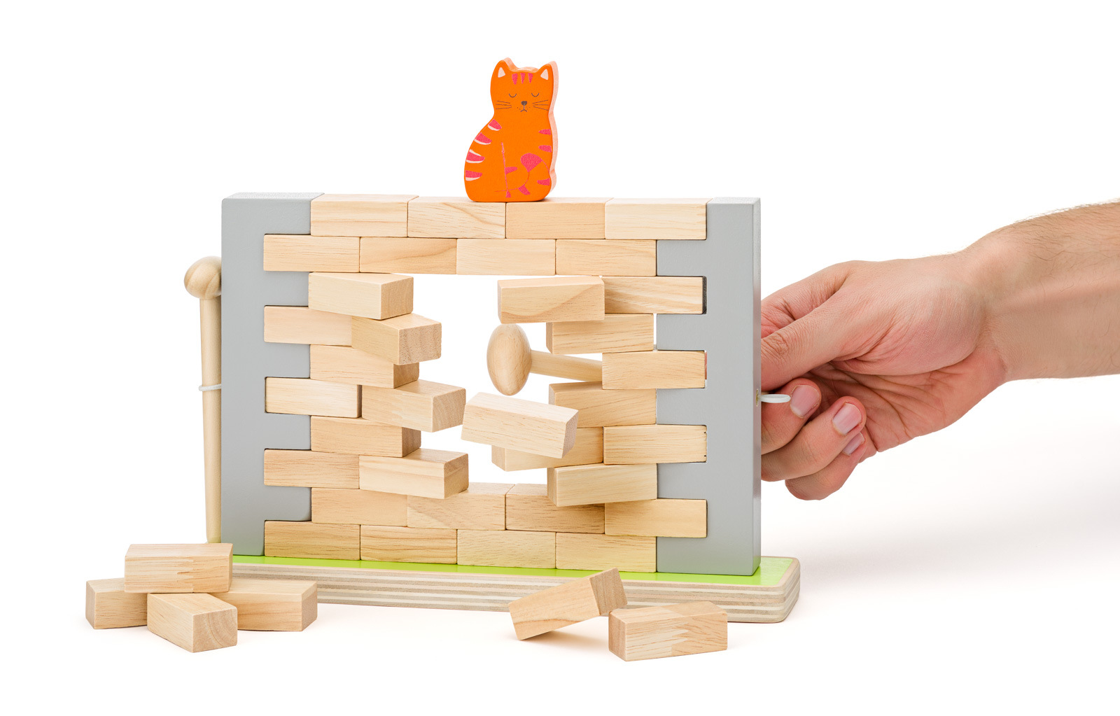 Úkolem dítěte je postavit zeď a posadit na ni kočku. Poté, co je věž postavena, může hra začít. Každý z hráčů si vezme do ruky kladívko a vyťukne jednu cihličku ze zdi tak, aby zeď stále držela pohromadě a kočka sedící na ní nespadla. Komu první kočka ze zdi spadne, prohrává. Hra je určena pro 2 hráče, z nichž může být jeden rodič a druhý dítě. Věk:3+| Rozměr: 25,8x5x16,5 cm