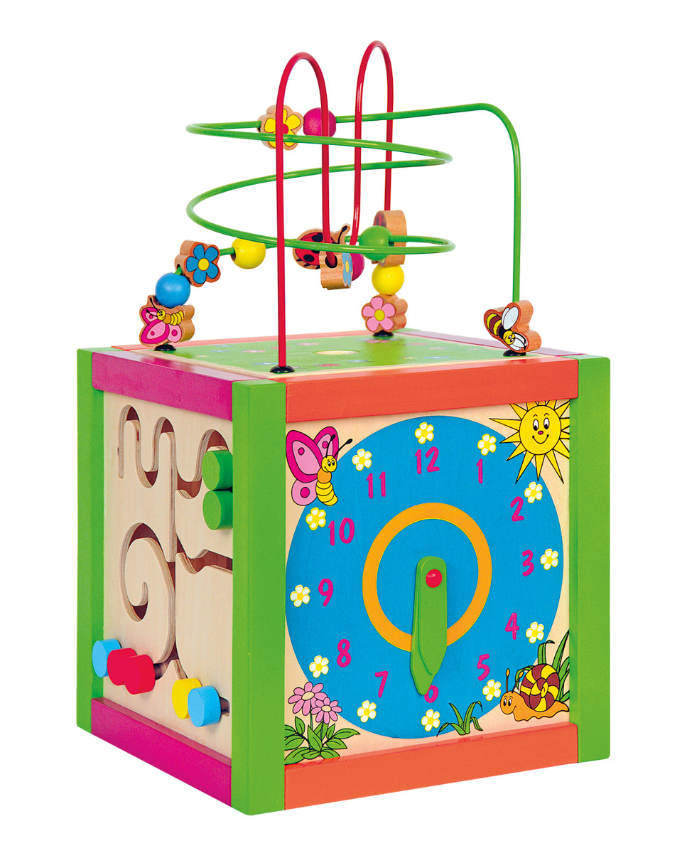 Didaktická pomůcka, logická hračka. Výborné pro rozvoj motorických schopností dítěte. Obsahuje: xylofon s paličkou, hodiny, počítadlo, bludiště a v horní části labyrint s korálky, které je možno posouvat po drátěné konstrukci. Po ukončení hry se strana s labyrintem zaklopí dovnitř pro snadné uskladnění hračky. | Rozměry: 21 x 36 x 21 | Věk: 3+