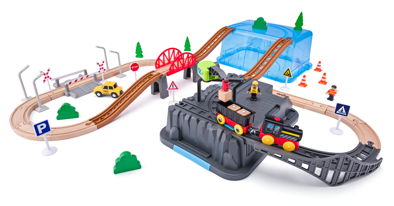 Plastový box je nejen praktický pro uskladnění vláčkodráhy, ale zároveň je po sestavení její nedílnou součástí. Provoz vláčkodráhy tak probíhá ve více výškových úrovních. Na kopečky šplhá mašinka s ozubenými kolečky po vroubkatých kolejničkách a stejně bezpečně po nich i sjíždí. Na jednom z kopečků je umístěn jeřáb s magnetem, který nakládá na vagónky náklad vybavený druhou polaritou magnetu. Vláčkodráha je vyrobena v kombinaci materiálů dřevo/plast.| Věk: 3+
