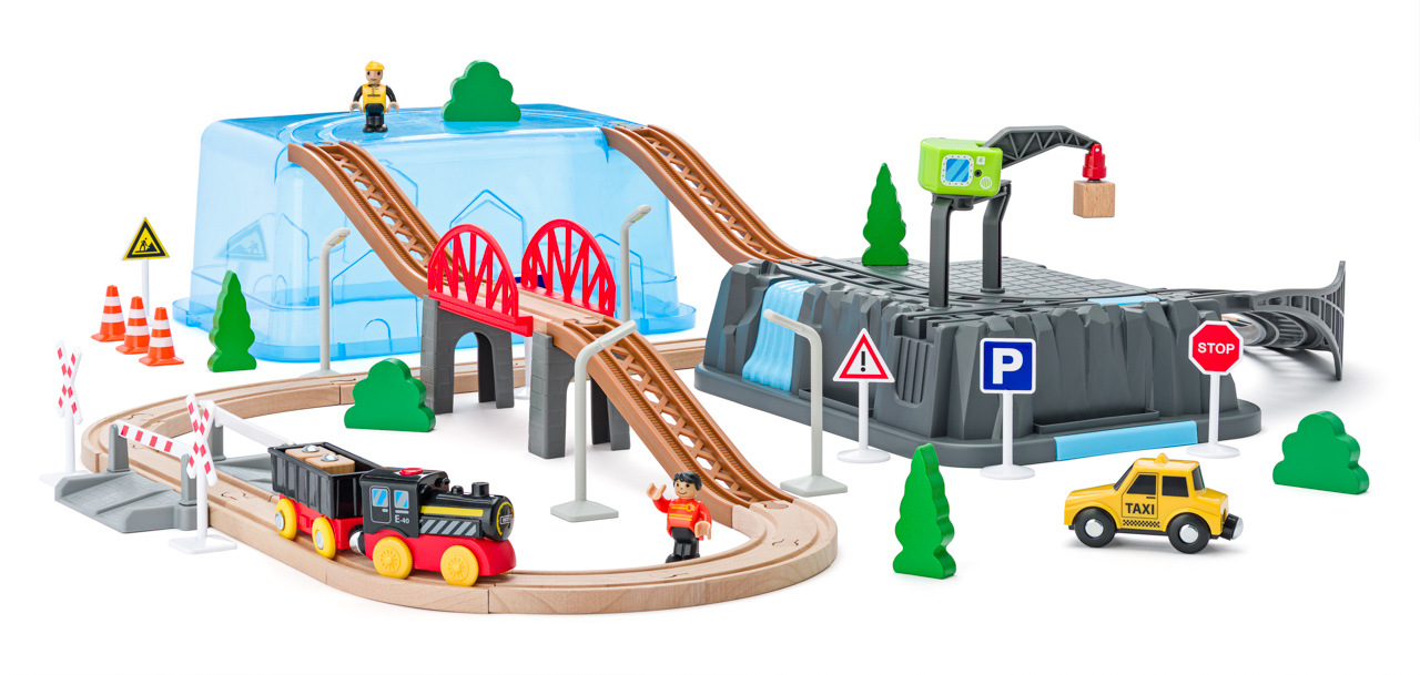 Víceúrovňová vláčkodráha s lanovým mostem a kombinací kolejí dřevo/plast. Sestava obsahuje elektrickou mašinku, plastové autíčko, vlakovou zastávku, 2 figurky a další příslušenství. Dráhu lze postavit pokaždé jinak a jednotlivé díly je možné kombinovat i s ostatními vláčkodráhami dostupnými na našem trhu. | Věk: 3+| Rozměr rozložené dráhy: š 90cm/v. 12cm/ hl.56cm, délka tratě: 260cm
