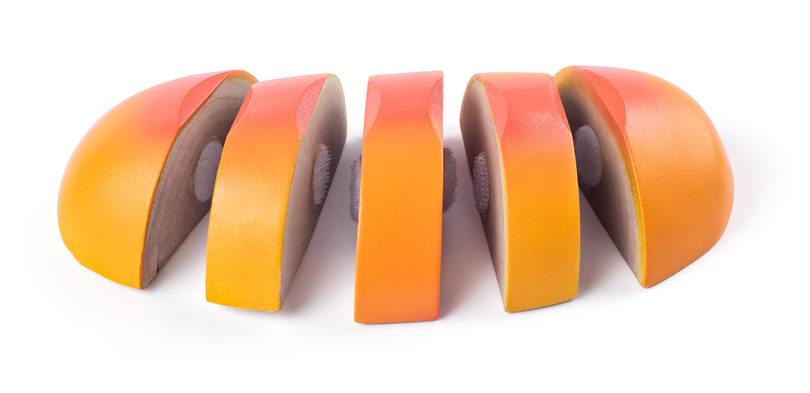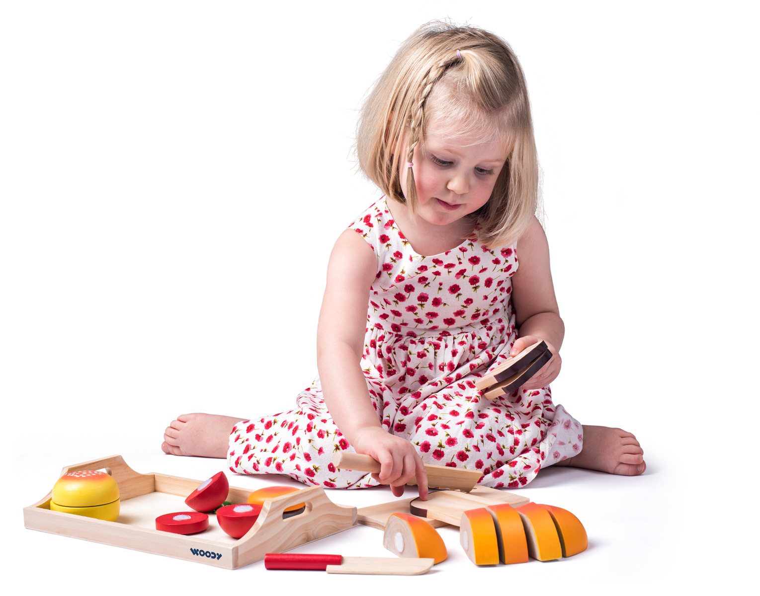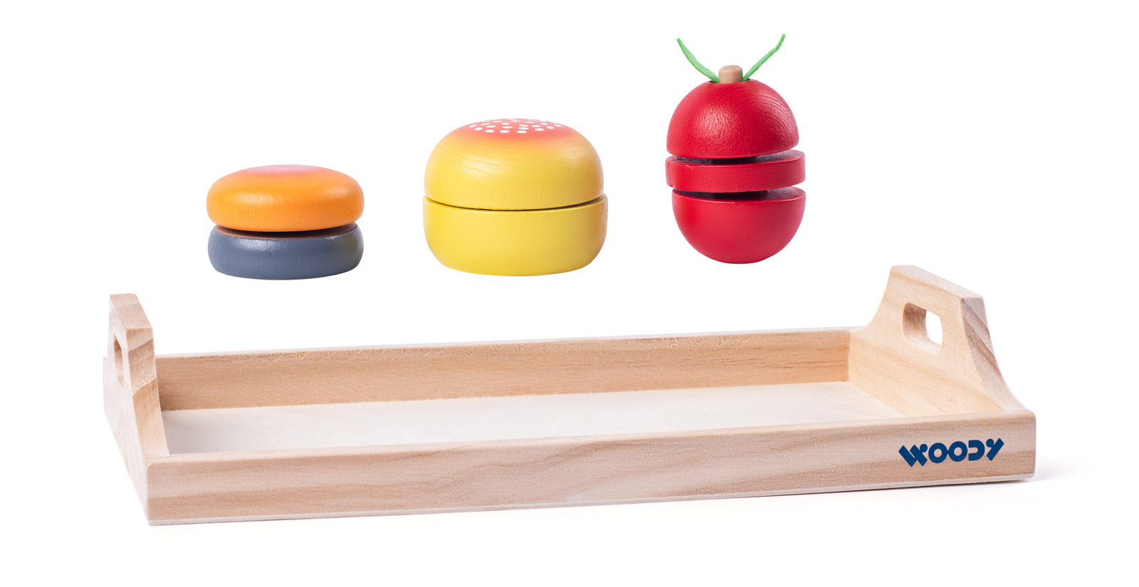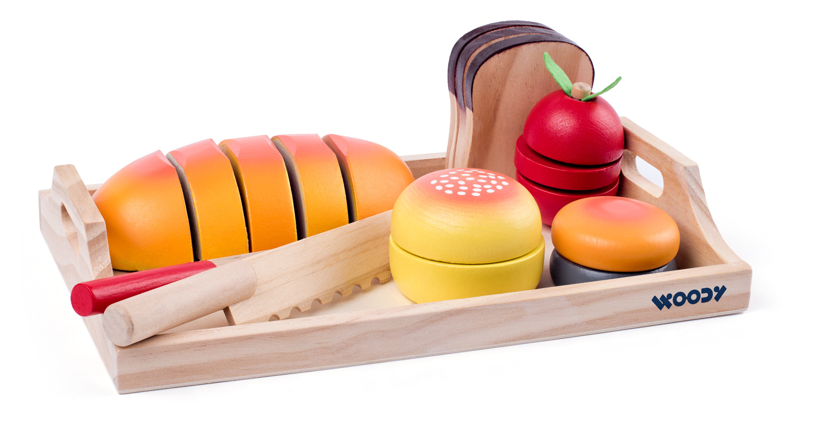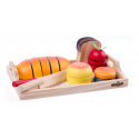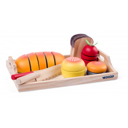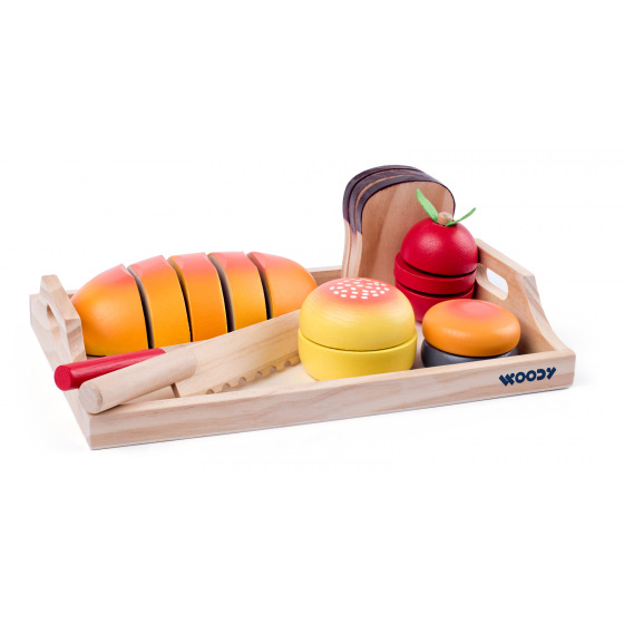 Všechny potraviny na dřevěném táce jsou složeny z částí spojených suchými zipy. Potraviny lze takto opakovaně krájet a znovu skládat. Ideální hračka pro rozvoj motoriky a logického myšlení. Věk: 3+. Rozměr: 28 x 19 cm