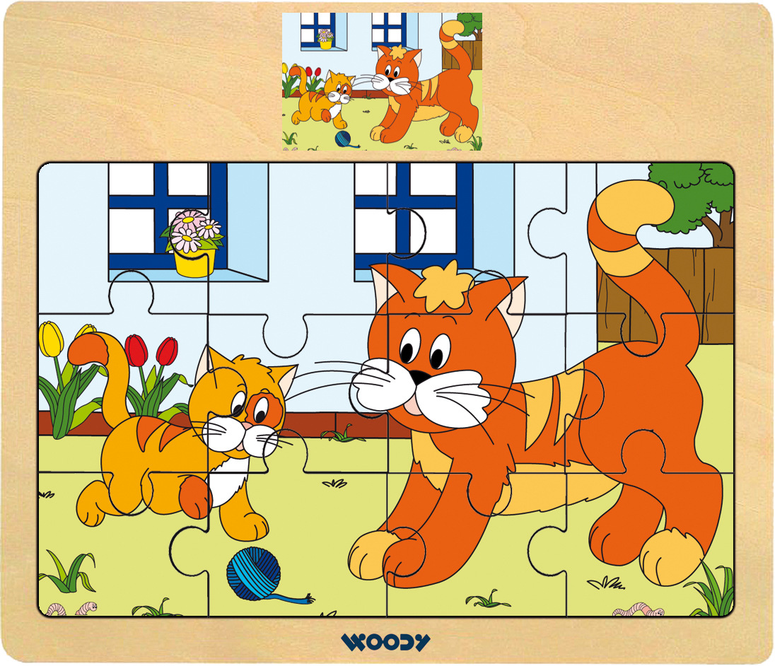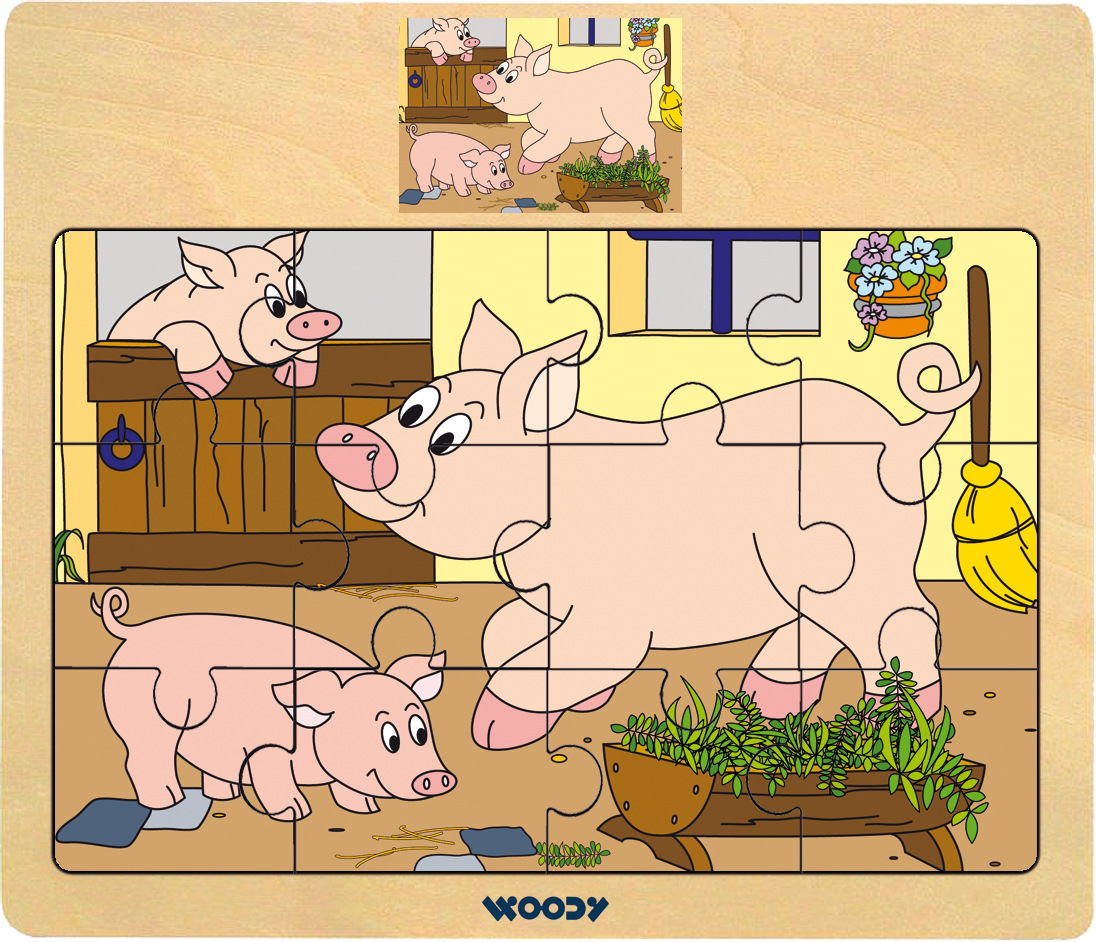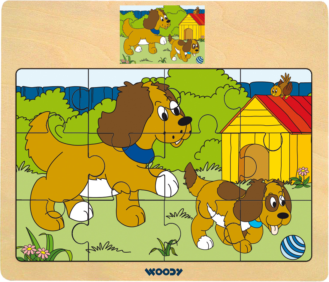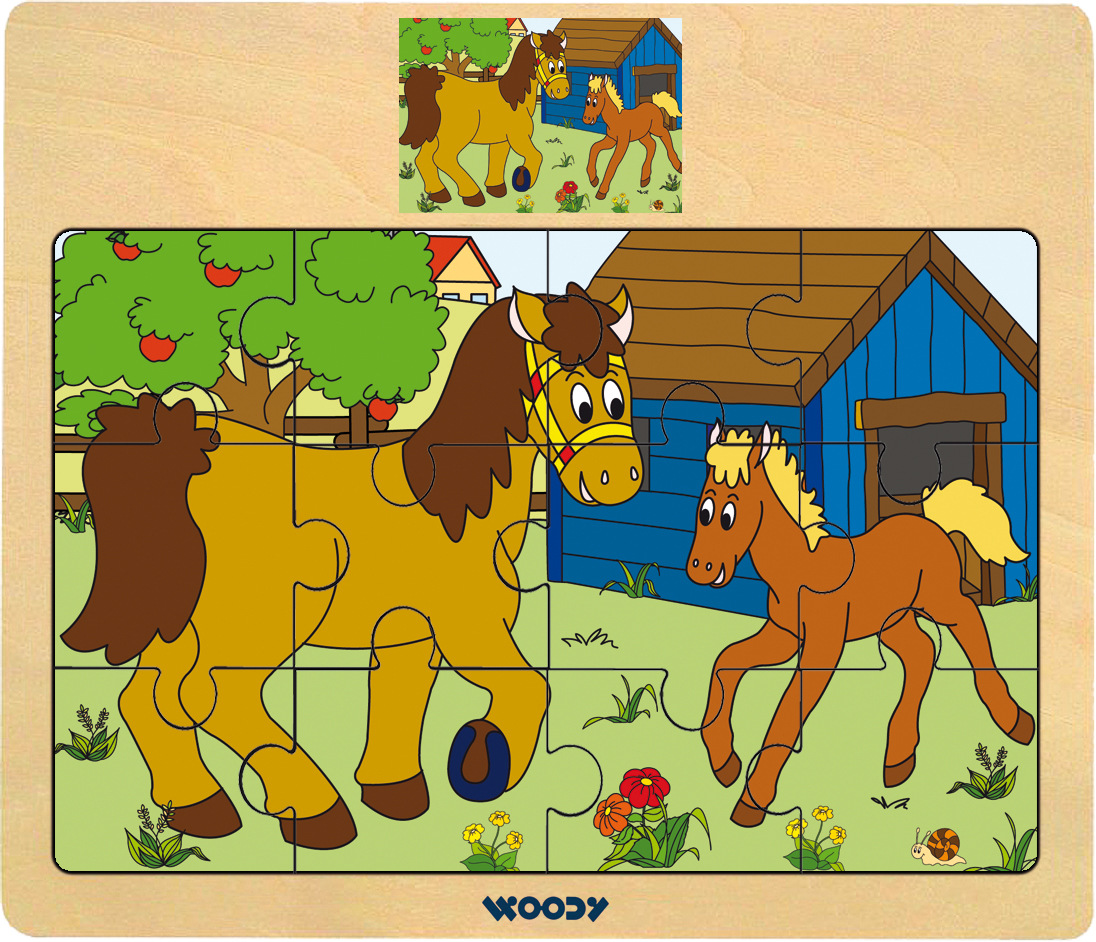 Klasické zámkové puzzle umístěné ve dřevěném rámu. Puzzle je navrženo tak, aby se snadno skládalo i malým dětem. Nenaleznete zde např.stejné dílky s plochou trávy či nebe, které jsou pro malé děti špatně identifikovatelné. Na každém dílku je zobrazena část celku nebo alespoň lísteček či šneček tak, aby se dítě snadno orientovalo.