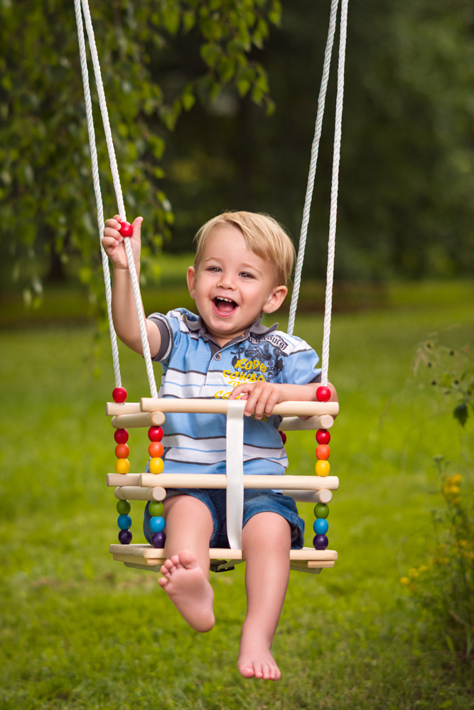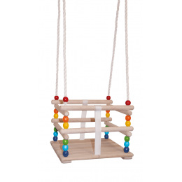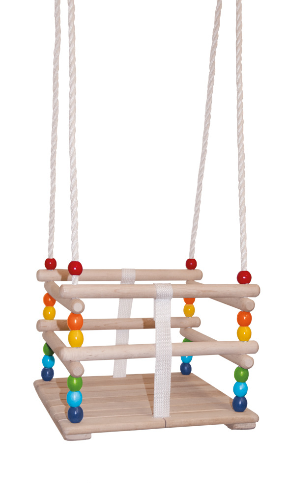 Houpačka pro nejmenší děti je vyrobena z masivního dřeva. Je opatřena bezpečnostní ohrádkou a popruhem umístěným mezi nohami dítěte, který zabraňuje vyklouznutí dítěte z houpačky. Houpačka má nastavitelnou délku lan. Je vhodná do interiéru i exteriéru. Je určena pro zavěšení na bezpečnostní (nejlépe točivé) háky, které však nejsou součástí balení. Vyrovná se uvolněním šňůry. Je určena pouze pro domácí použití (nikoliv tedy pro veřejná hřiště). Instalujte hračku tak, aby se zabránilo převrácení, či jinak nesprávnému použití hračky. Nedoporučuje se hračku instalovat nad betonový, asfaltový, či jiný tvrdý povrch. Doporučujeme orientaci hračky tak, aby dítě nebylo vystaveno ve směru přímého slunce. Před použitím hračky vždy proveďte kontrolu. Houpačka nesmí být vystavena přímým povětrnostním vlivům. Doporučujeme před každým použitím překontrolovat správné a bezpečné zavěšení houpačky. Maximální nosnost: 30 kg. Rozměr sedátka: 30 x 30 x 28 cm. Délka lan: 160–230 cm. Rozměr balení: 33 x 10 x