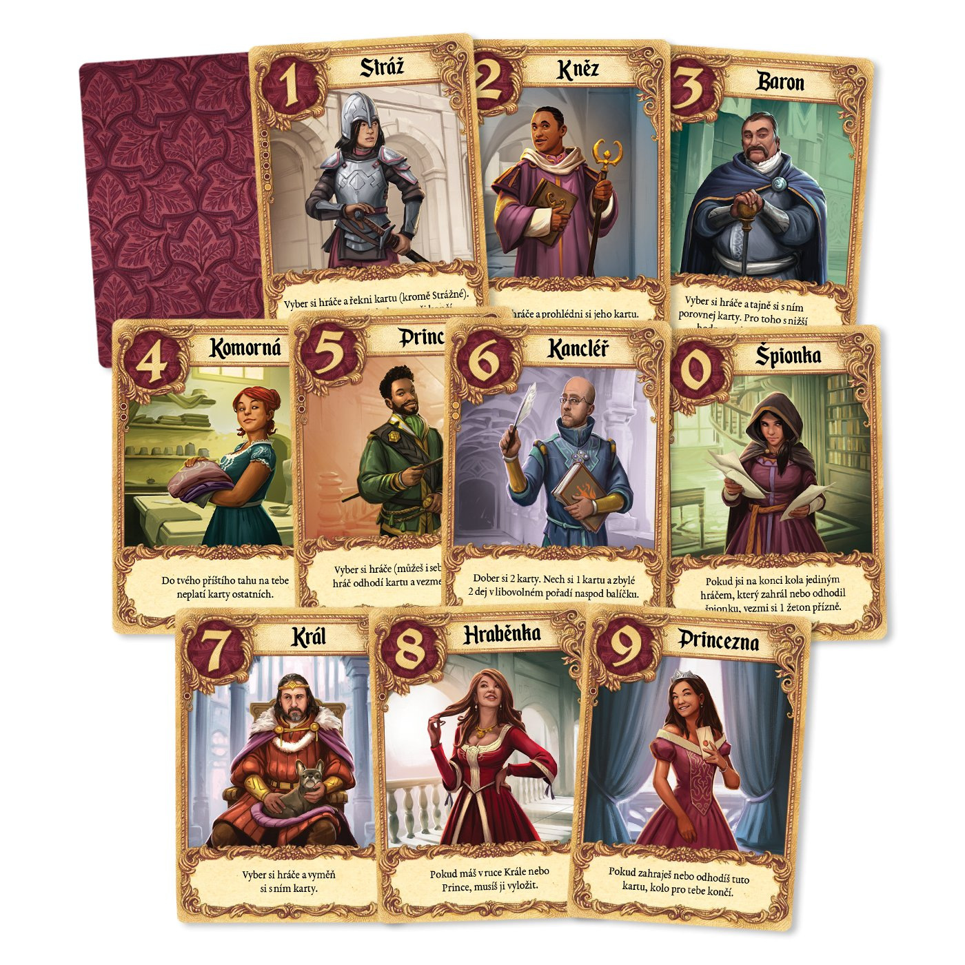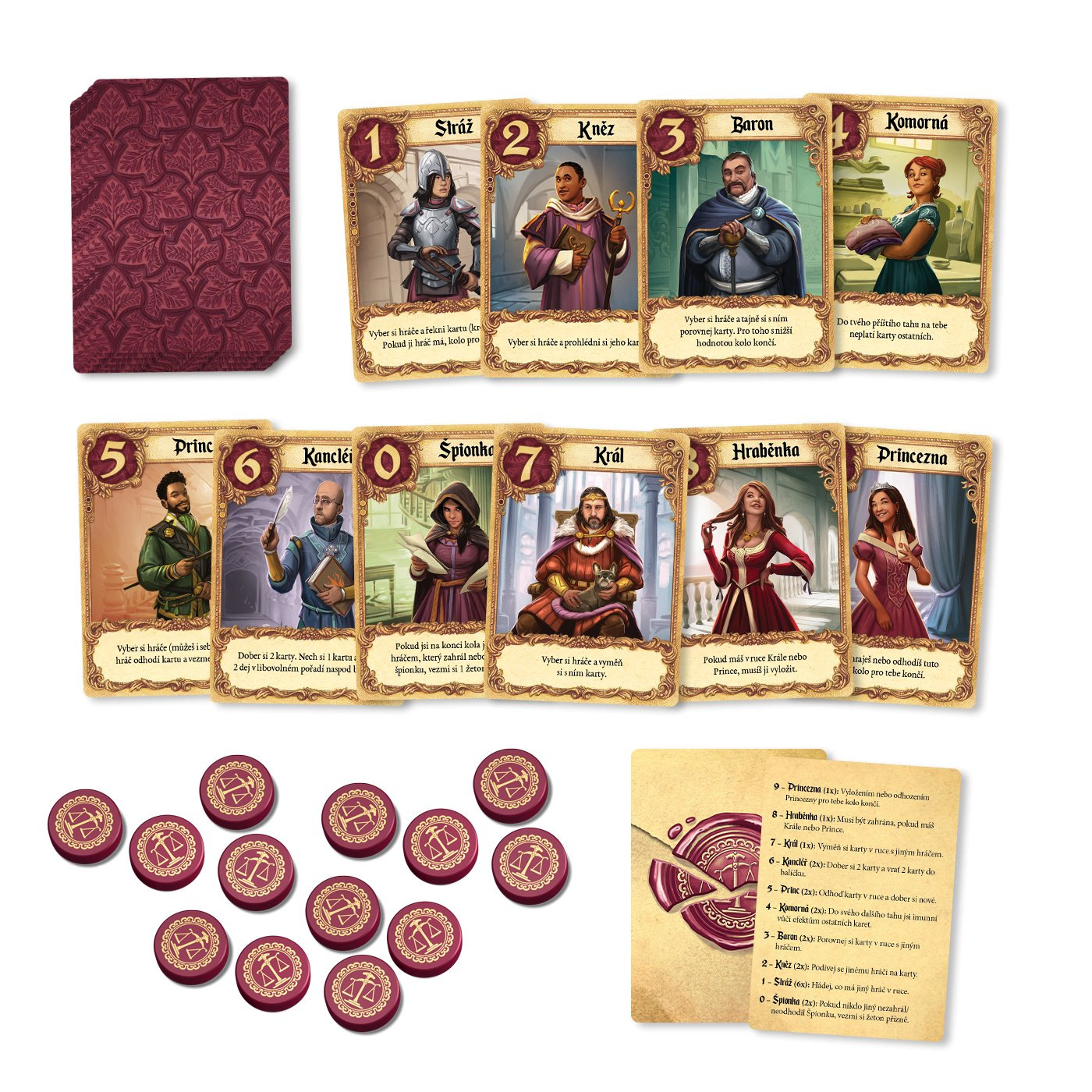 Obsah balení: 21 karet s postavami 6 přehledových karet 13 žetonů přízně 1 látkový pytlík 1 česká pravidla